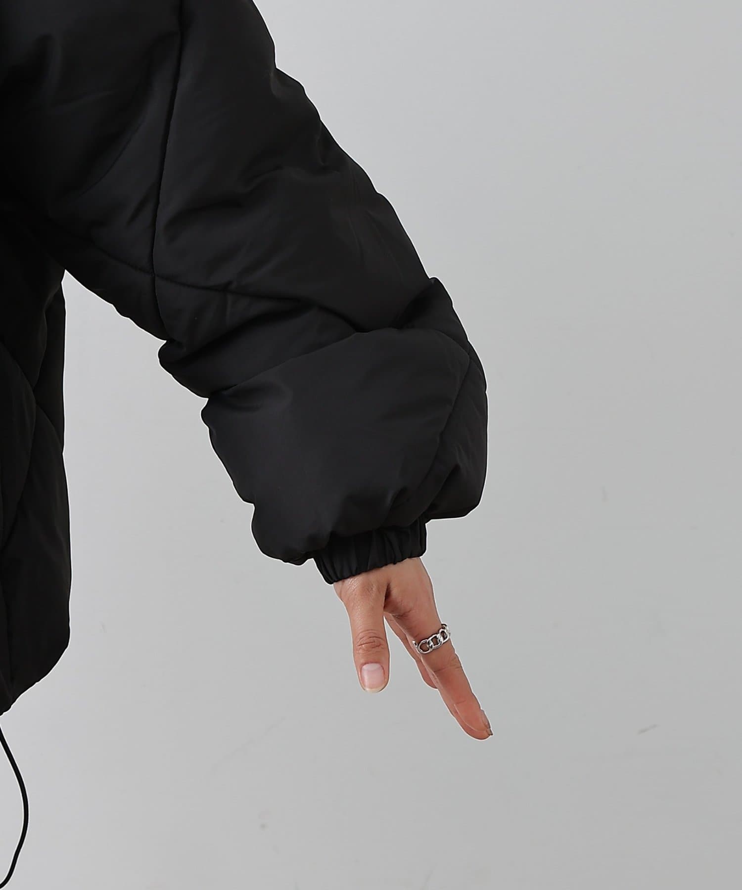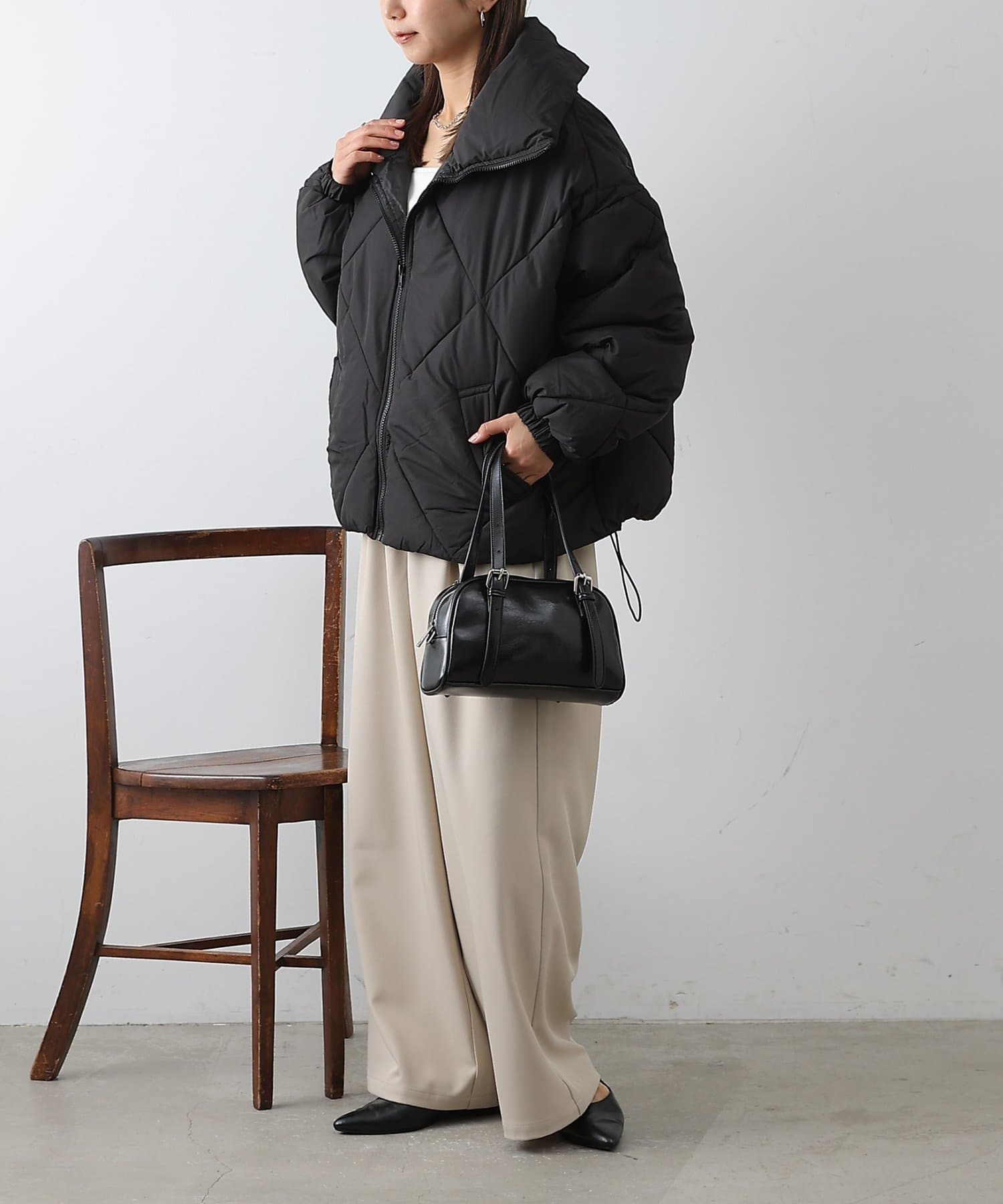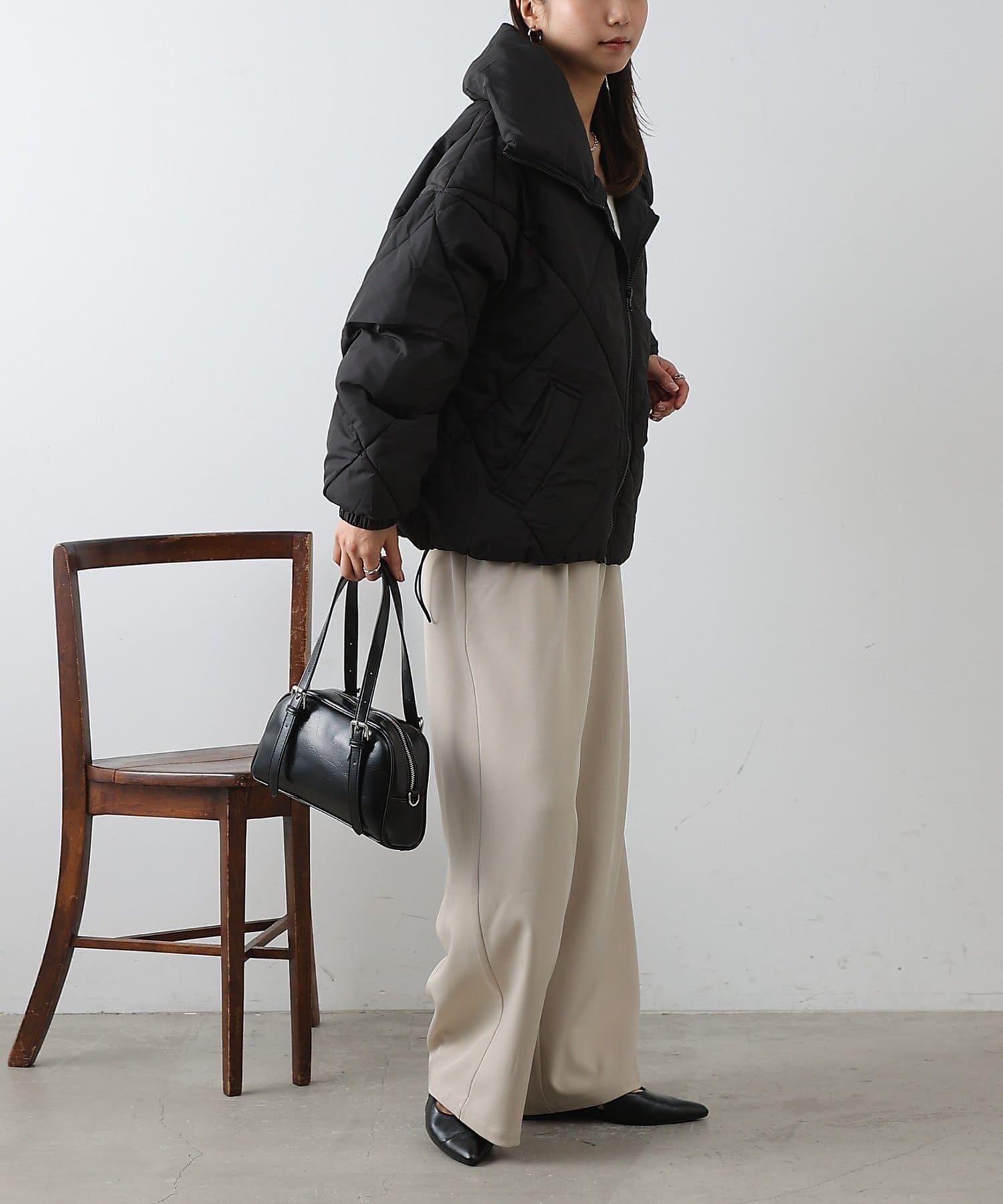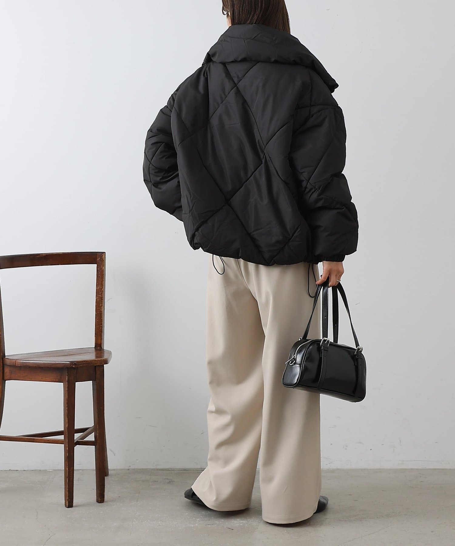 大きめのダイヤキルトの中綿ショートコートです。