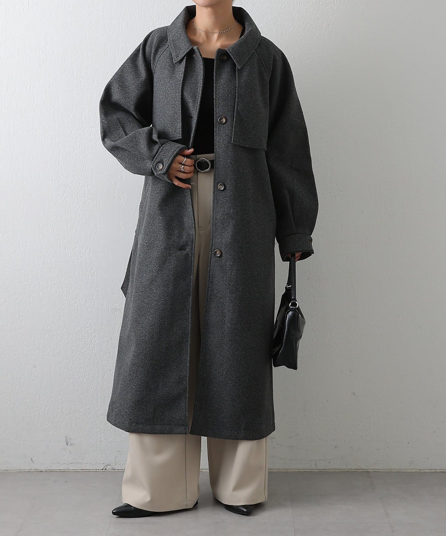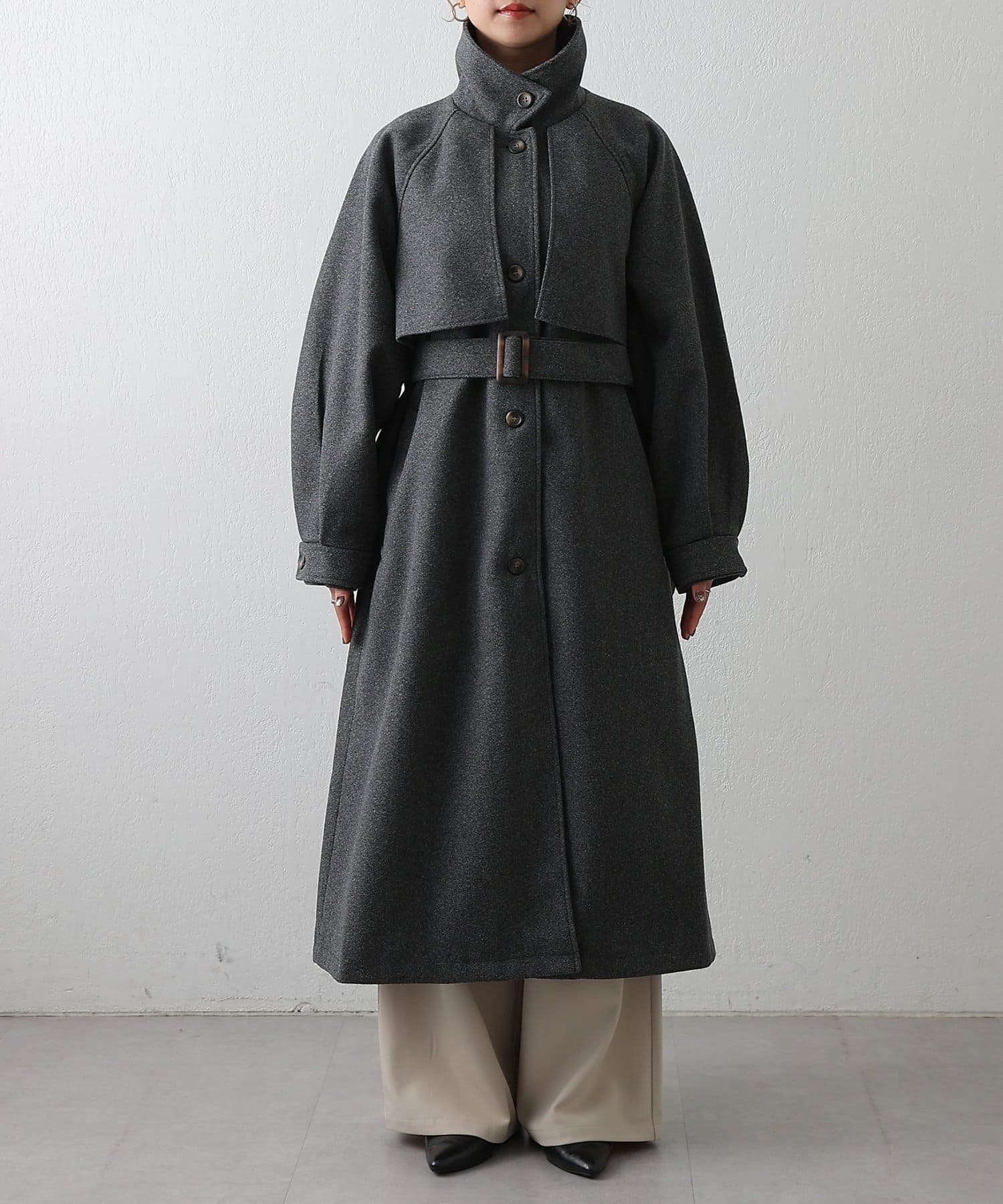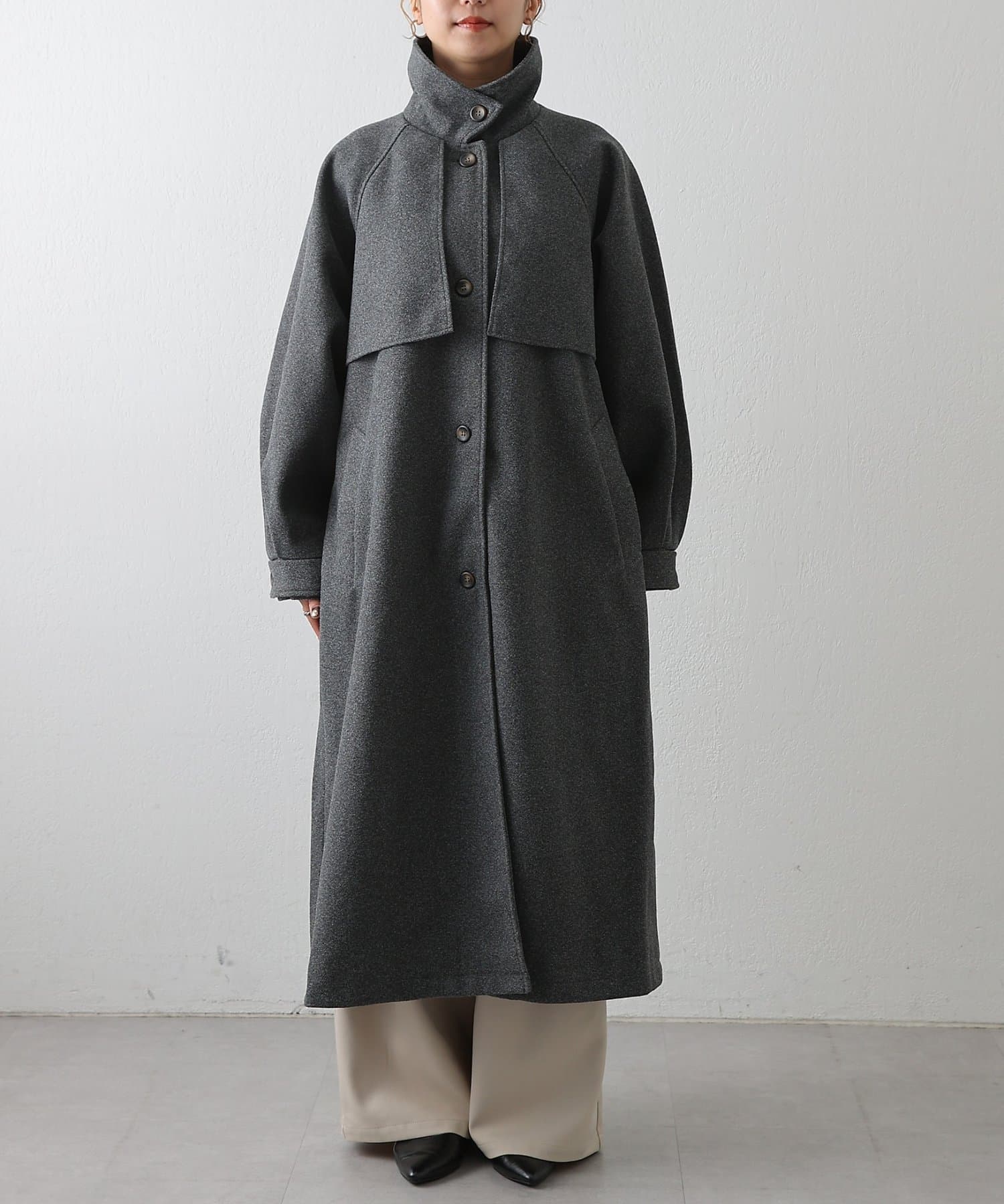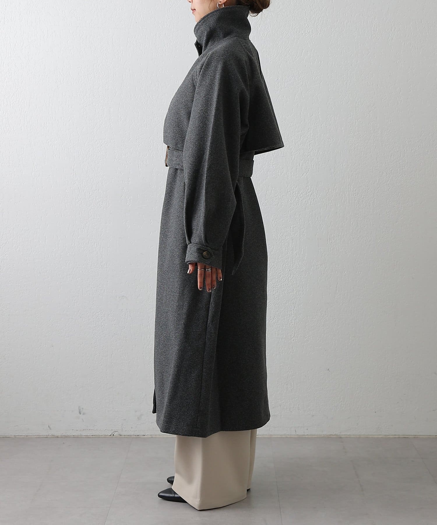 衿を立ててハイネックとしても着られる2WAYカラーが魅力のシングルロングコートです。