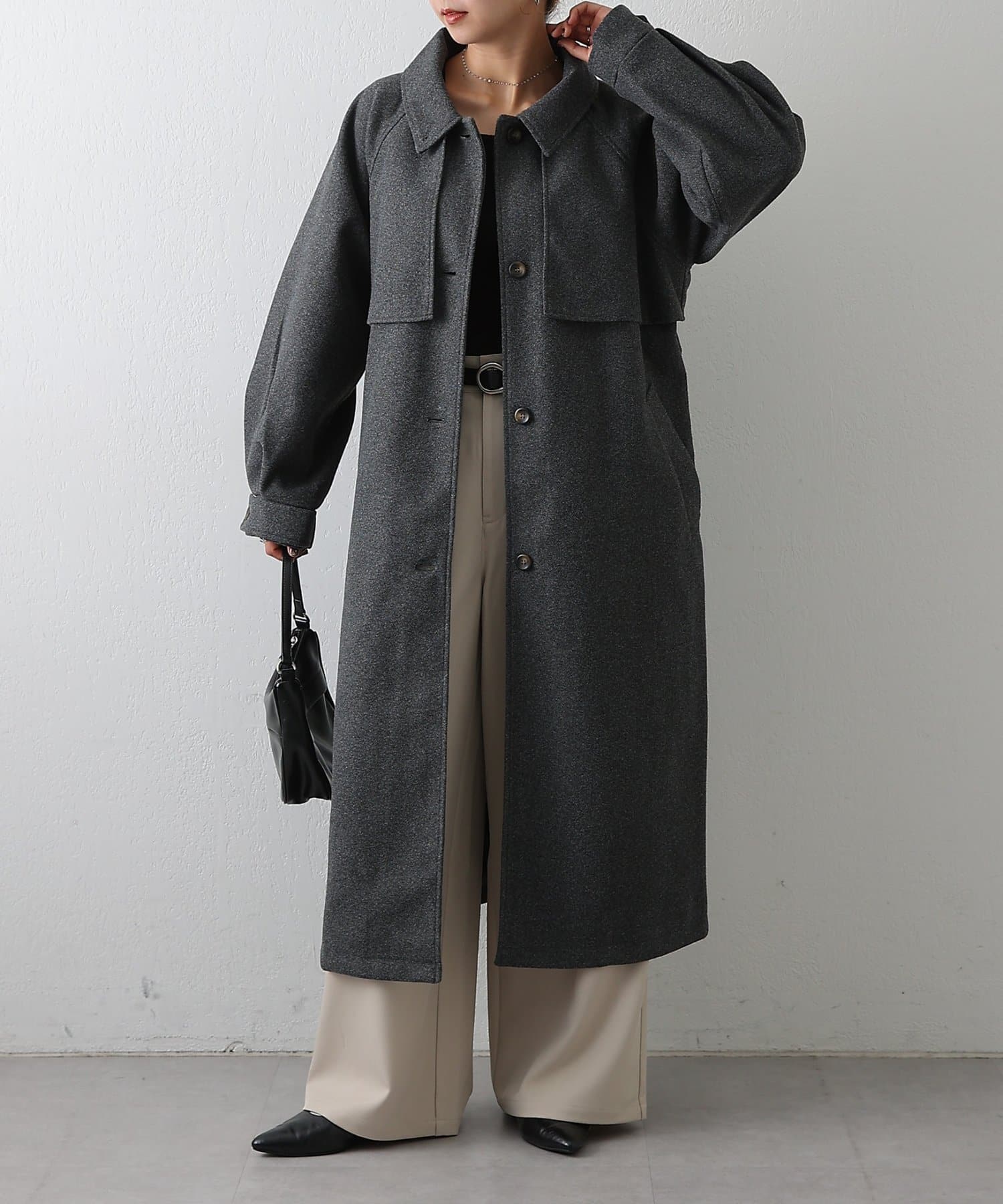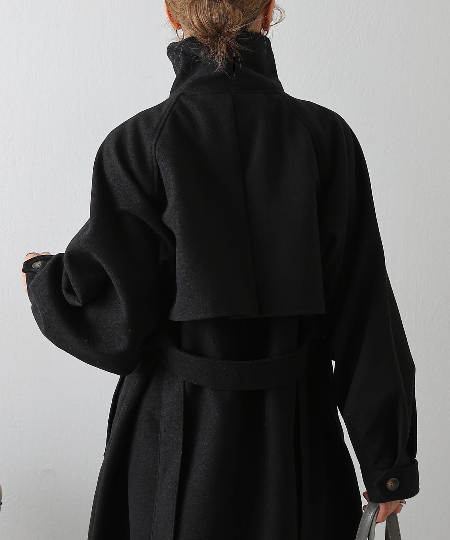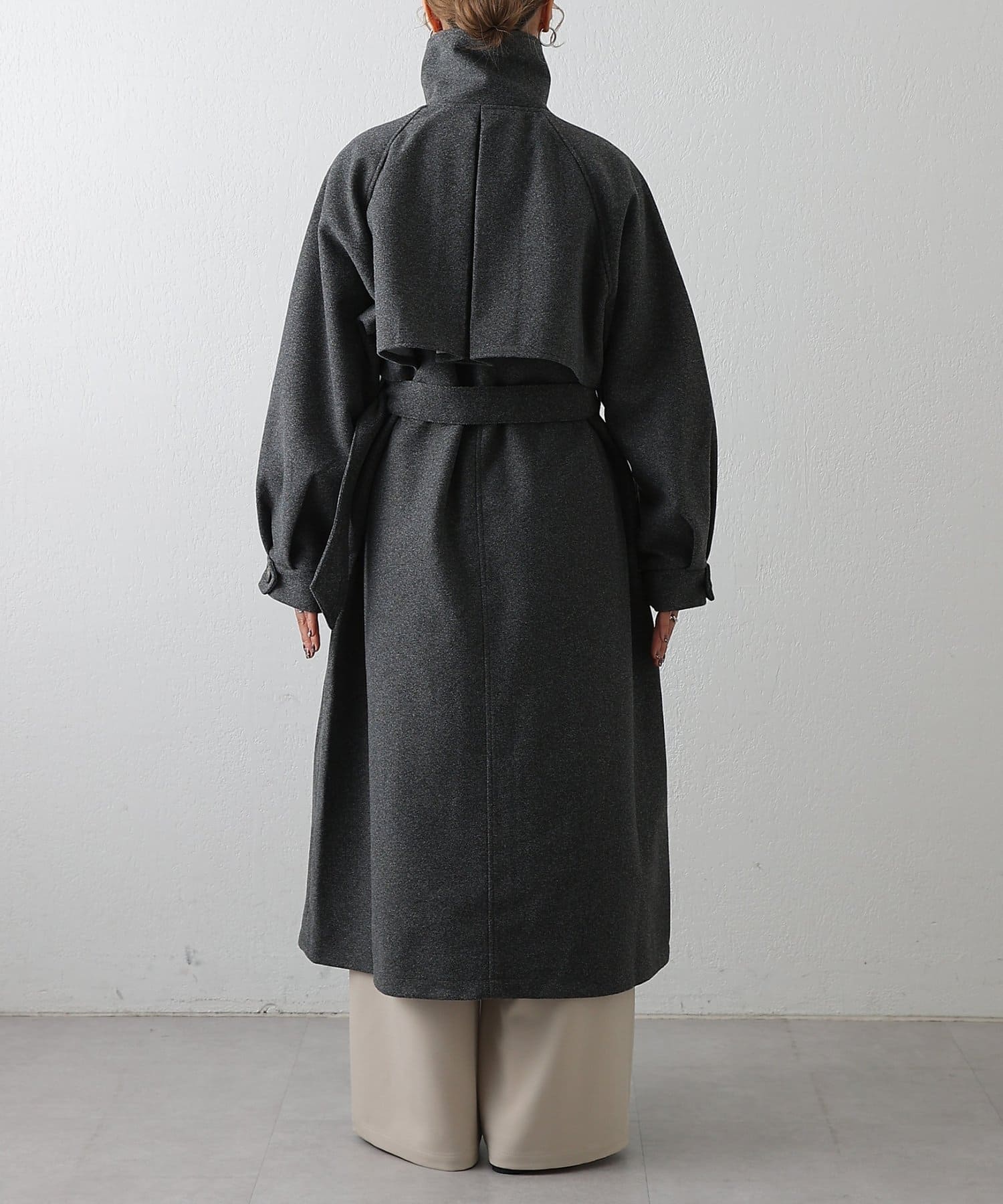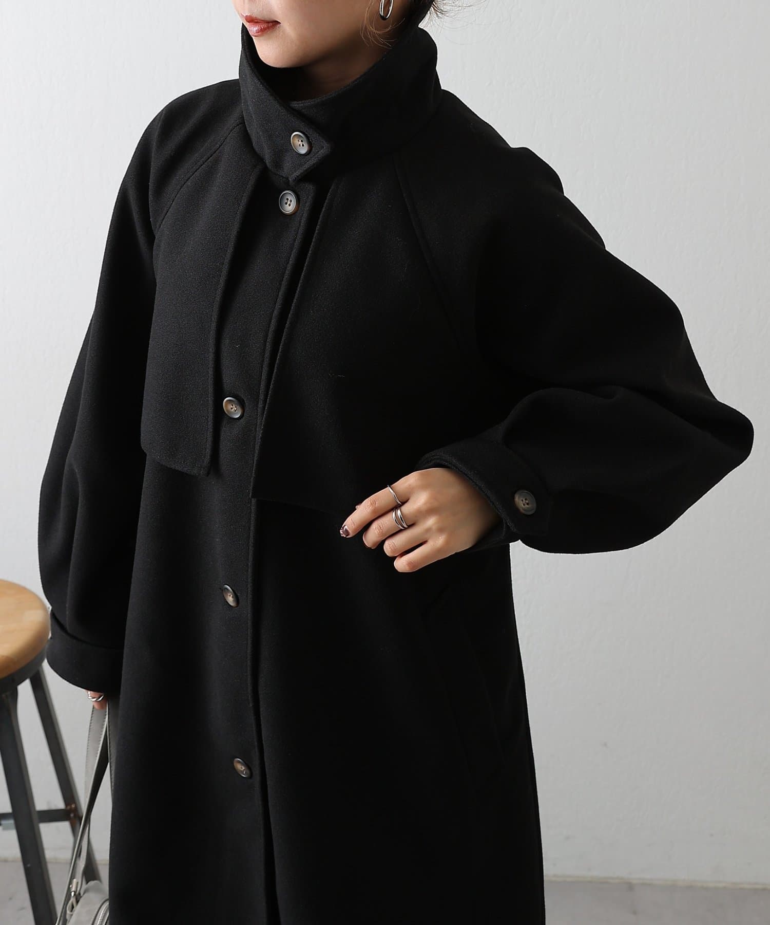 衿を立ててハイネックとしても着られる2WAYカラーが魅力のシングルロングコートです。