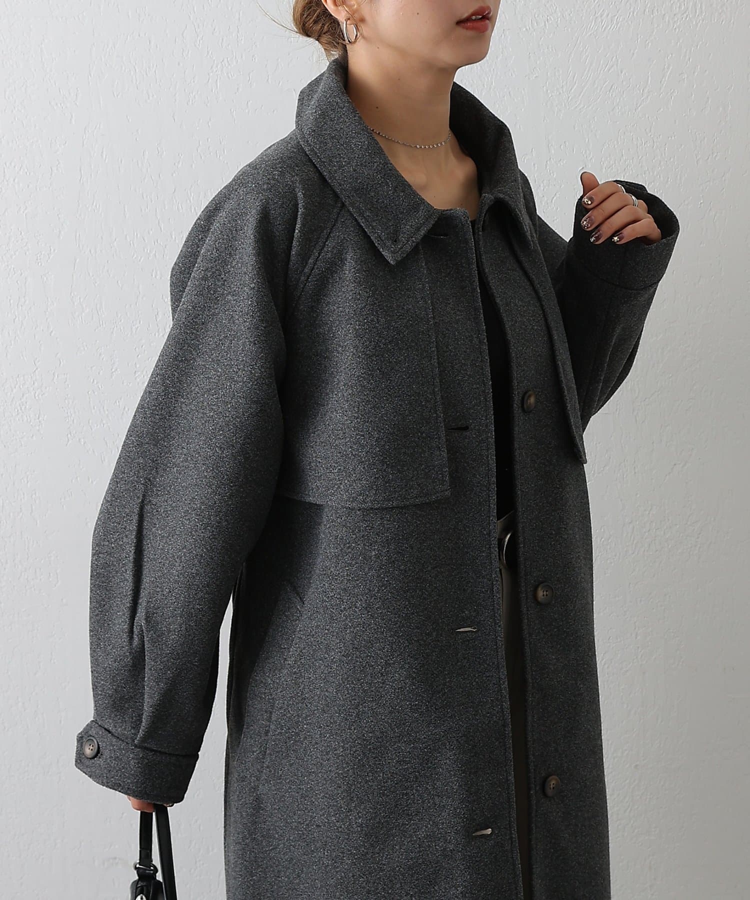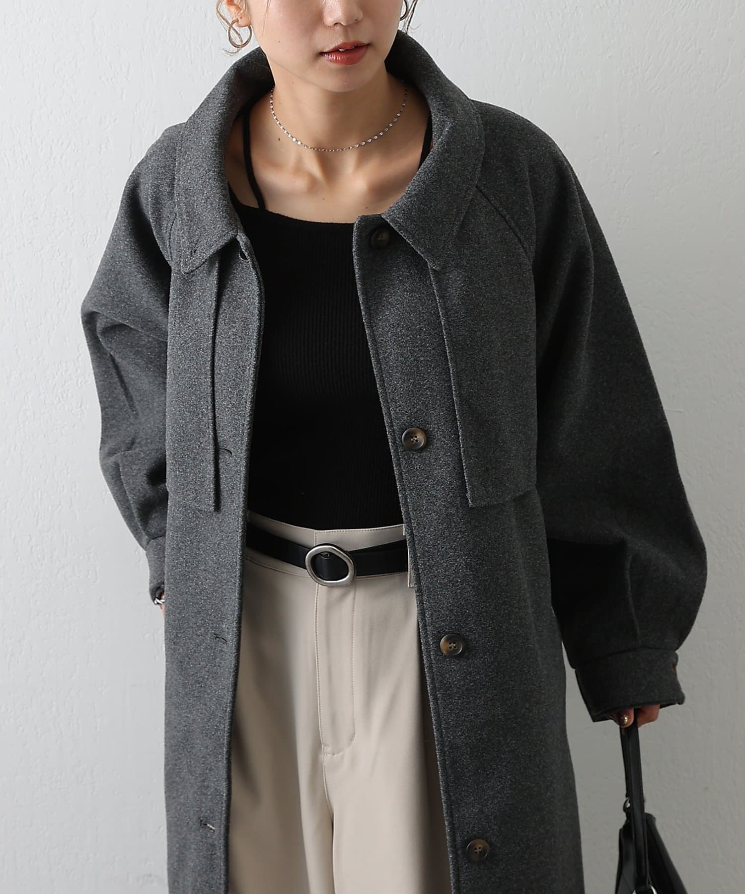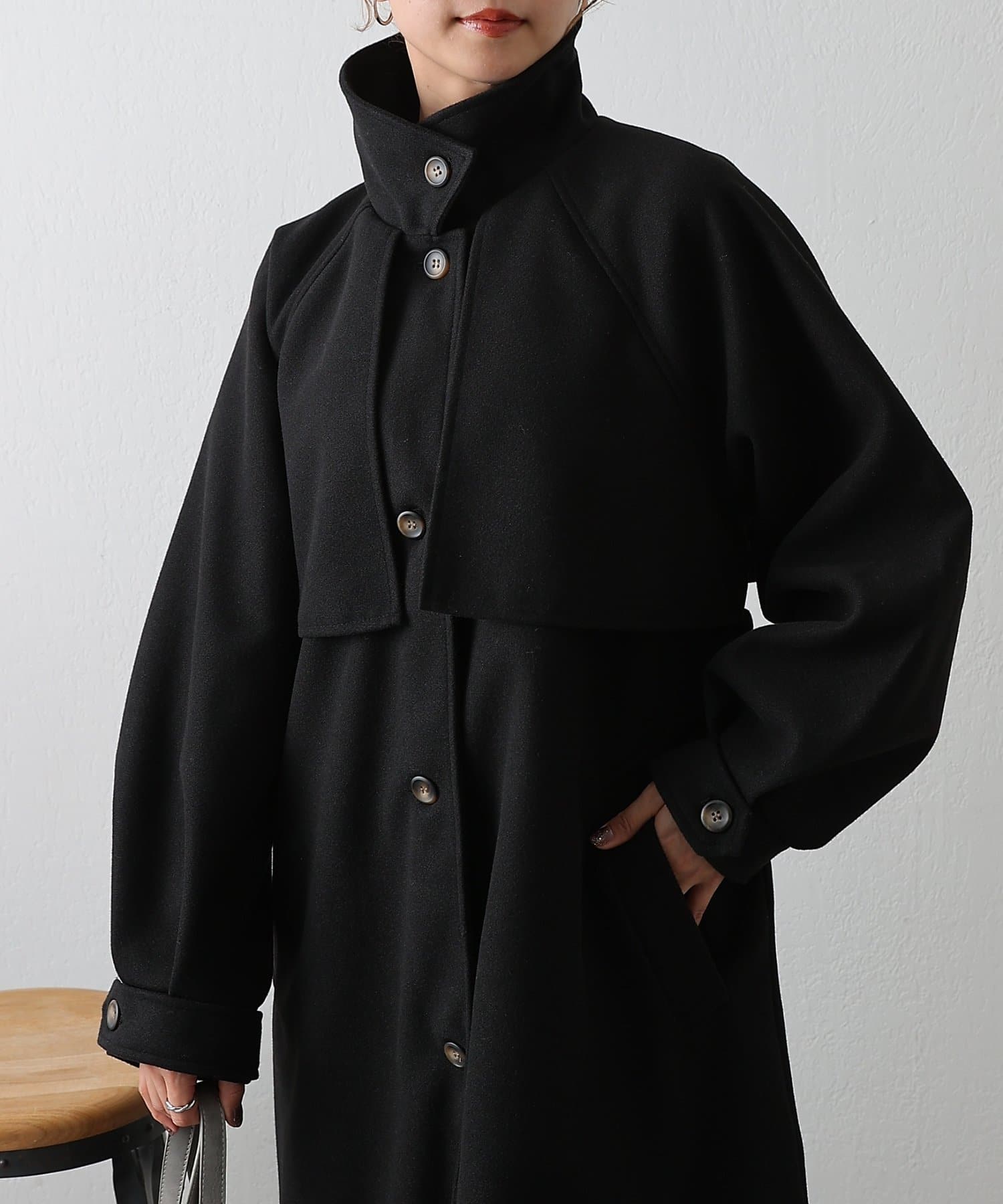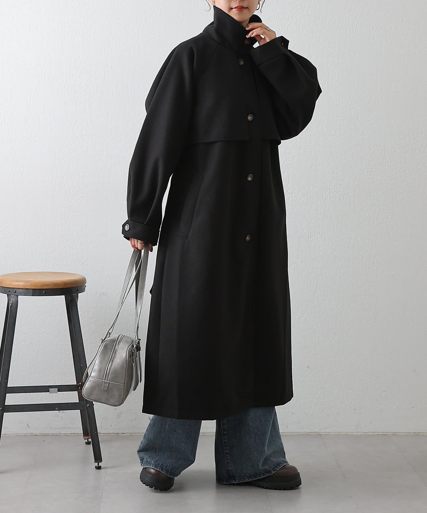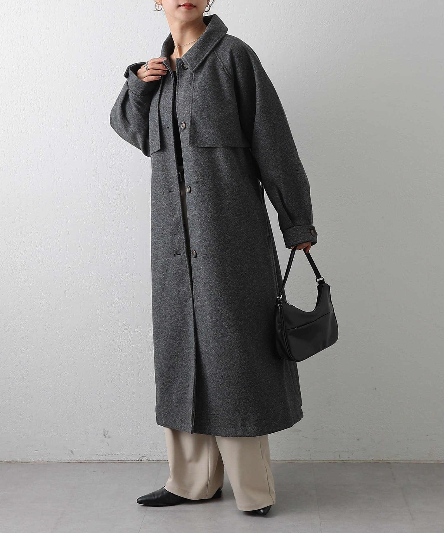 衿を立ててハイネックとしても着られる2WAYカラーが魅力のシングルロングコートです。