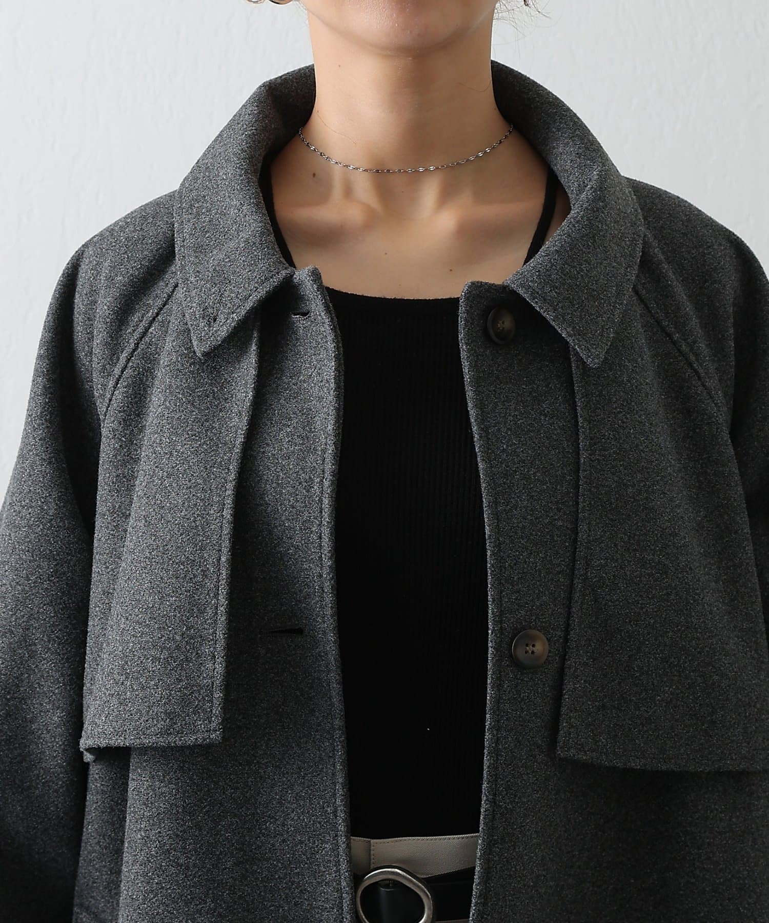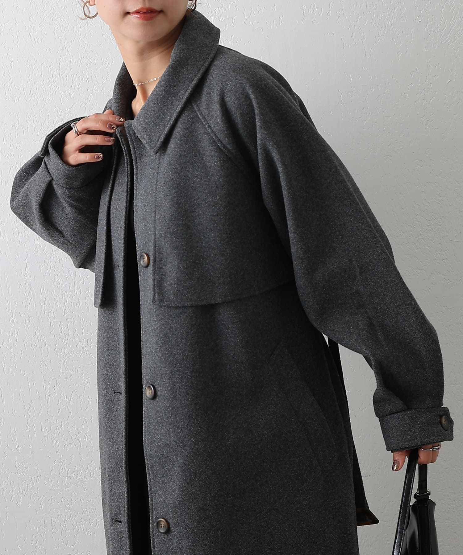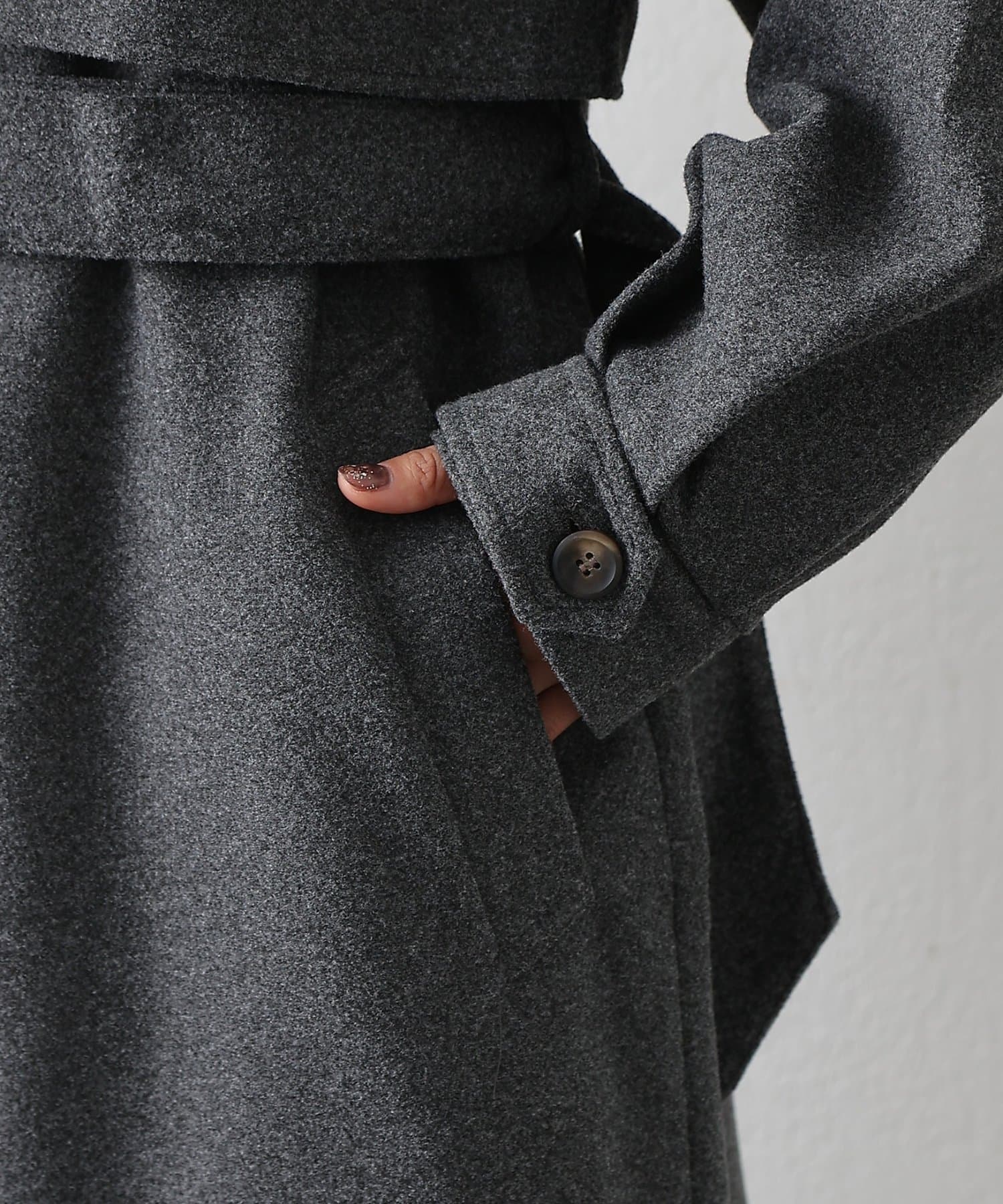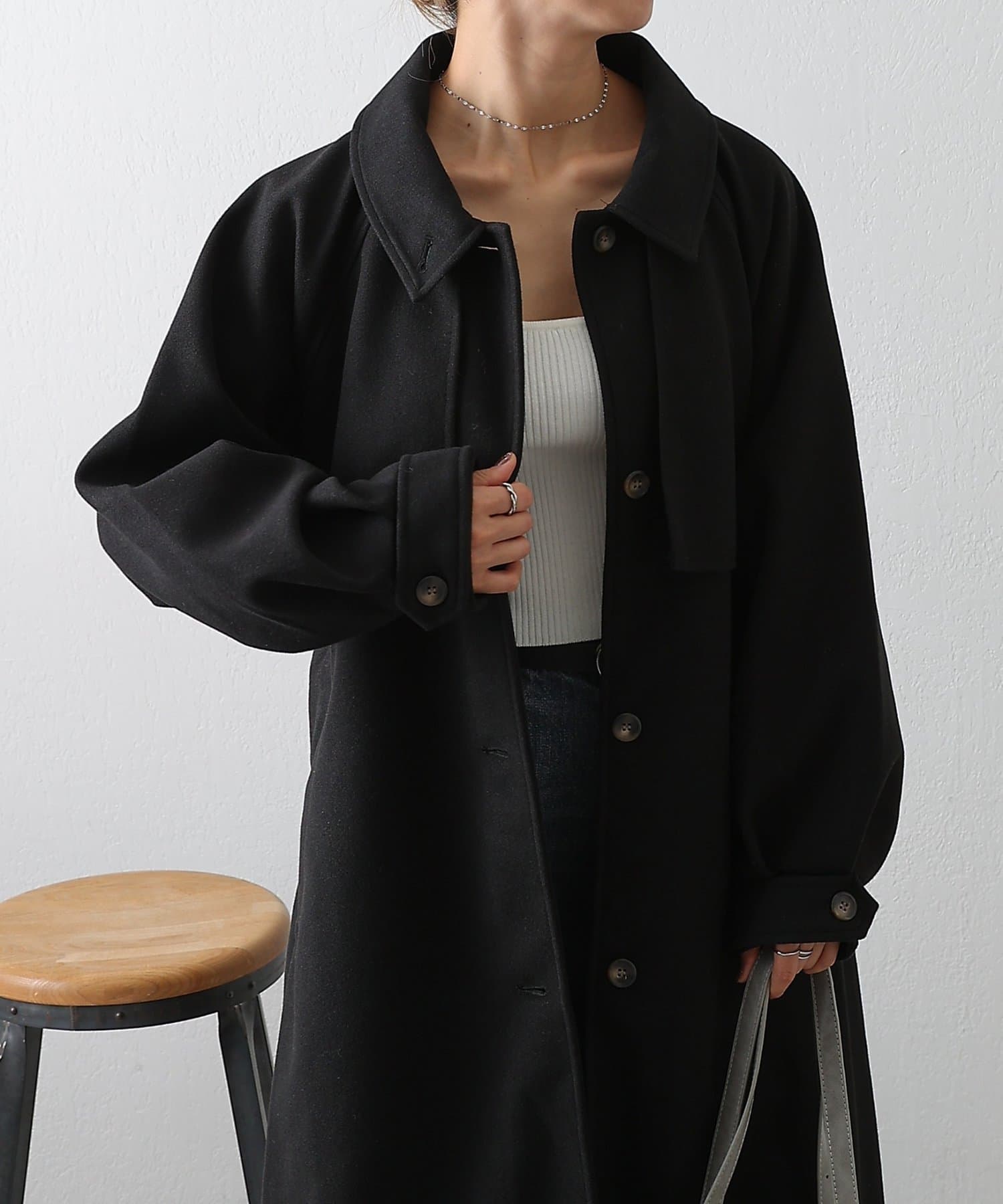 衿を立ててハイネックとしても着られる2WAYカラーが魅力のシングルロングコートです。