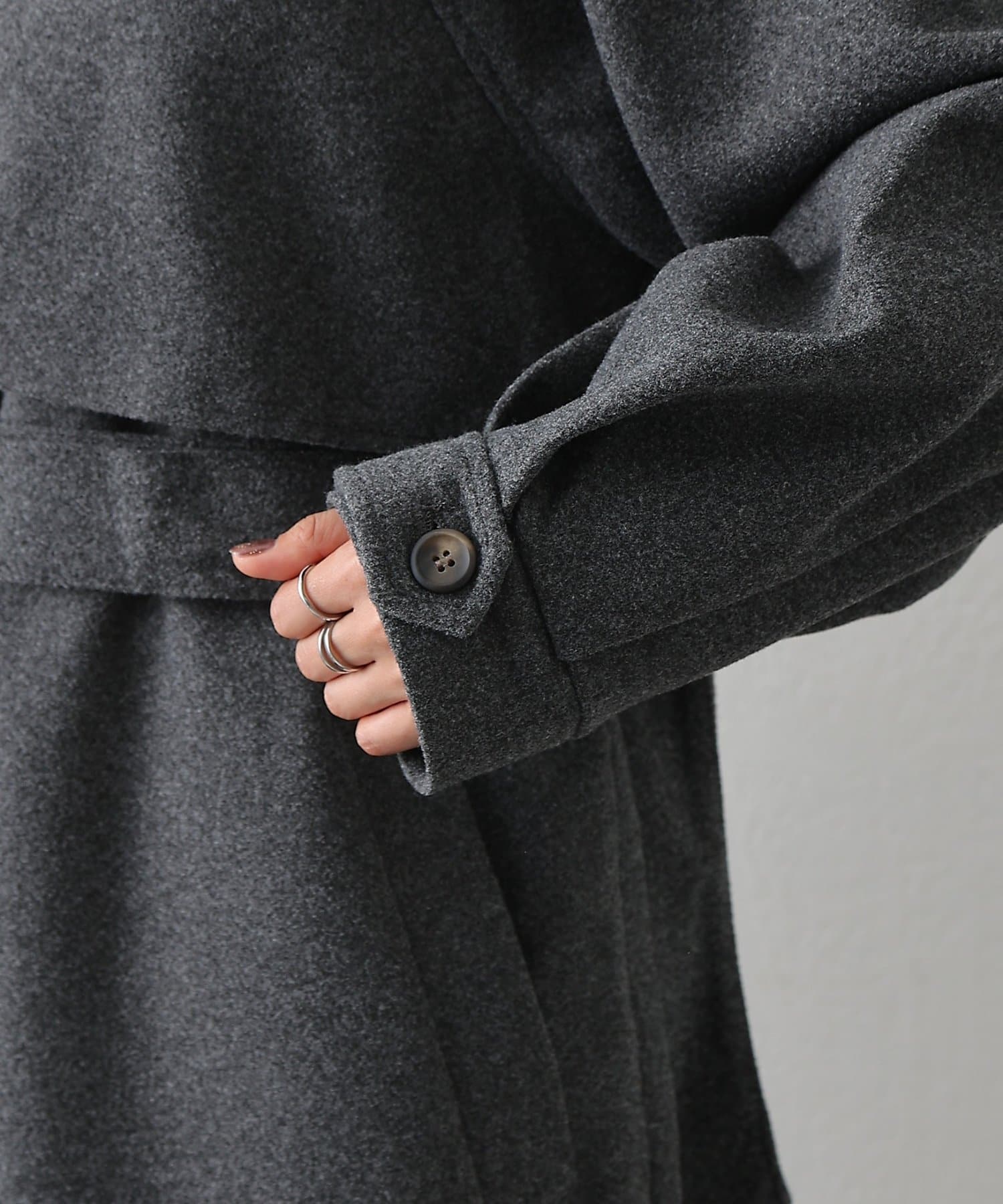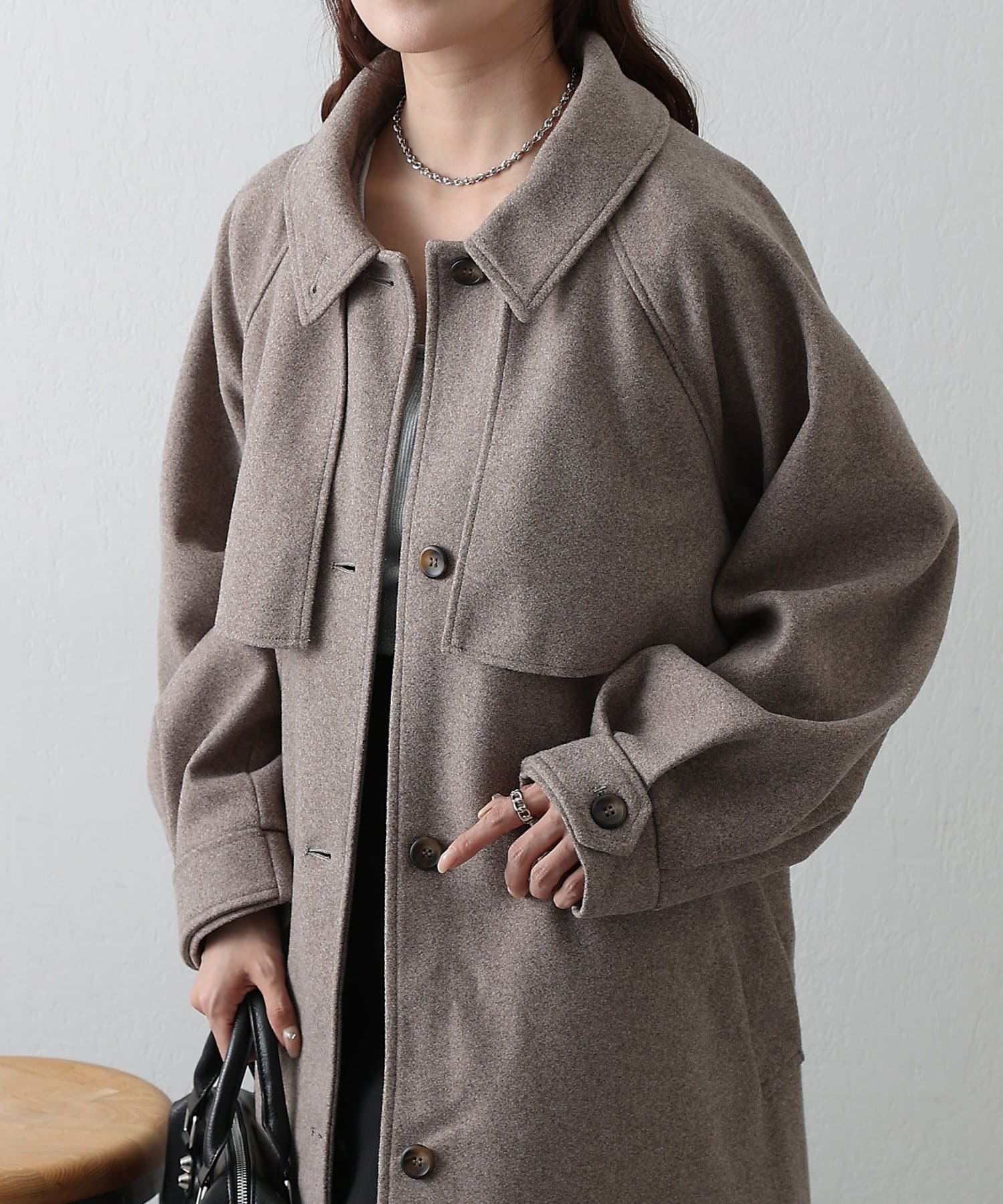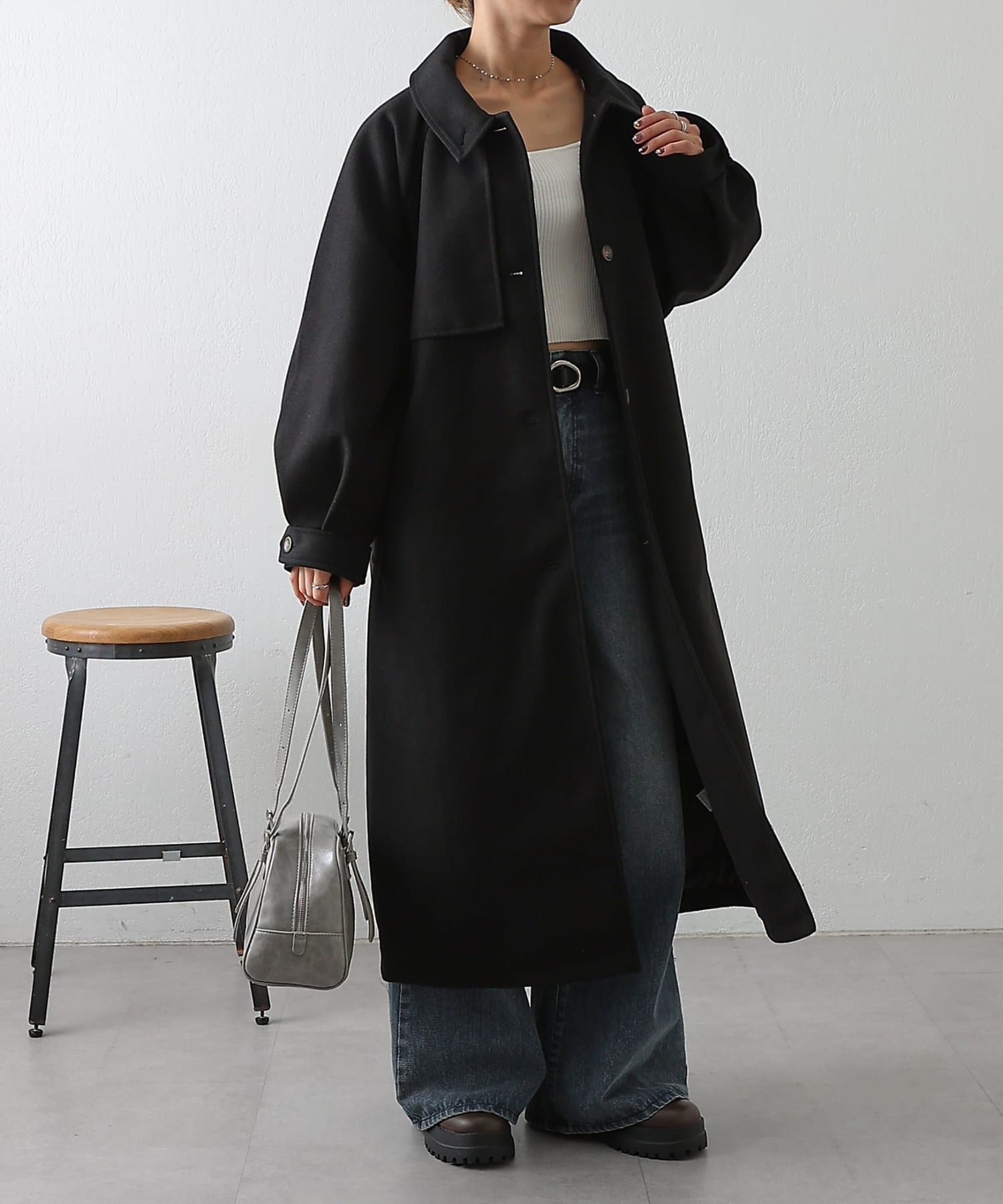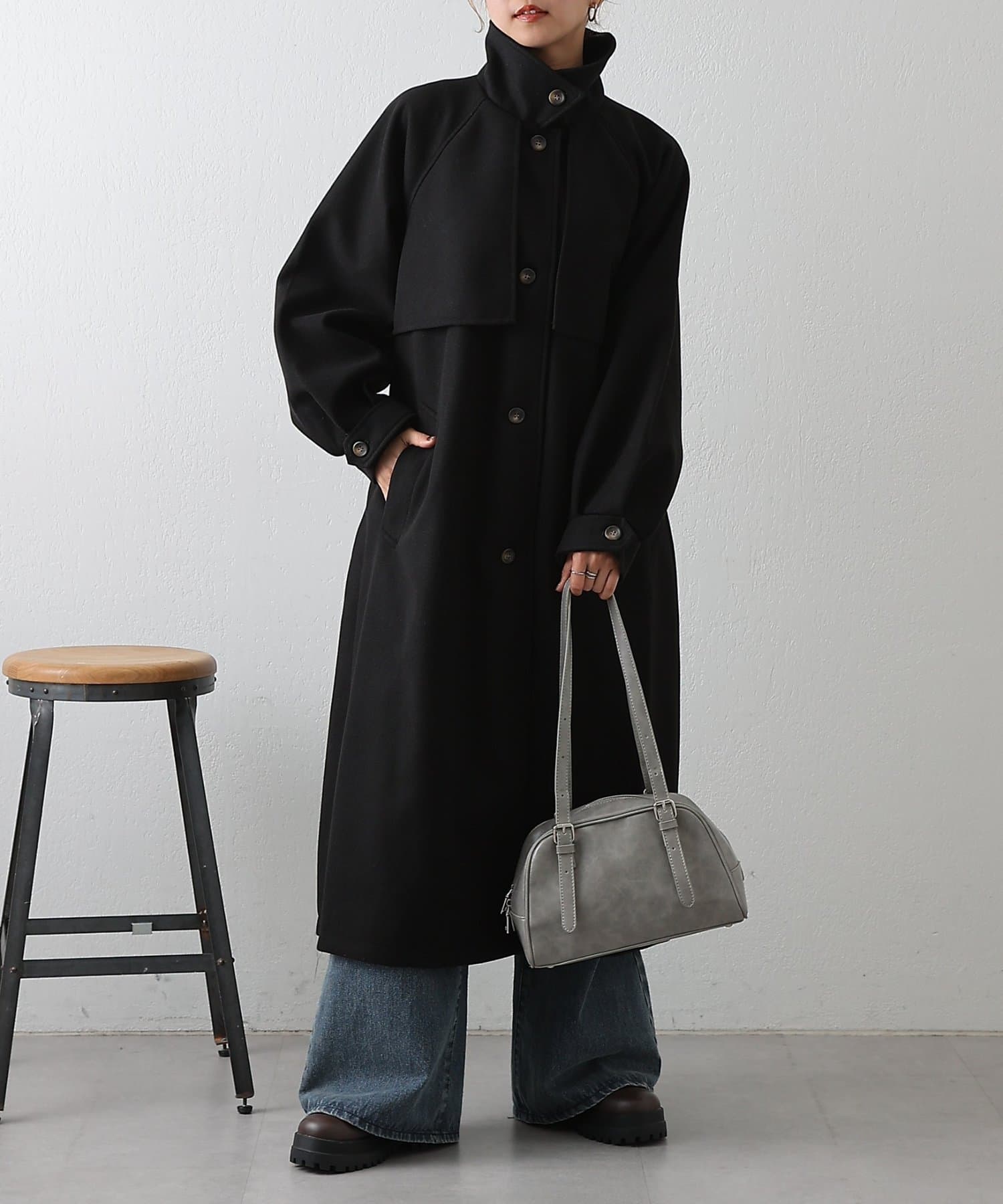 衿を立ててハイネックとしても着られる2WAYカラーが魅力のシングルロングコートです。