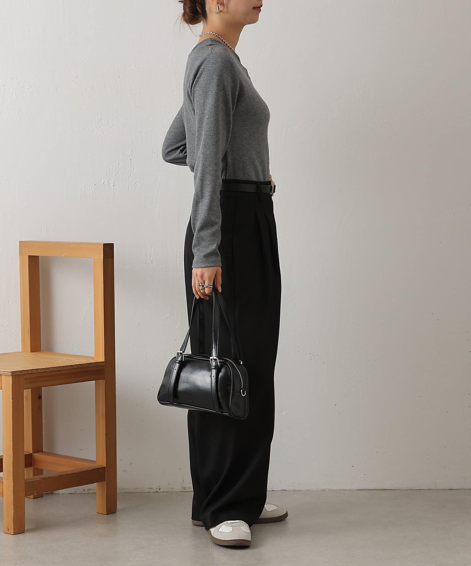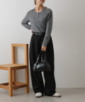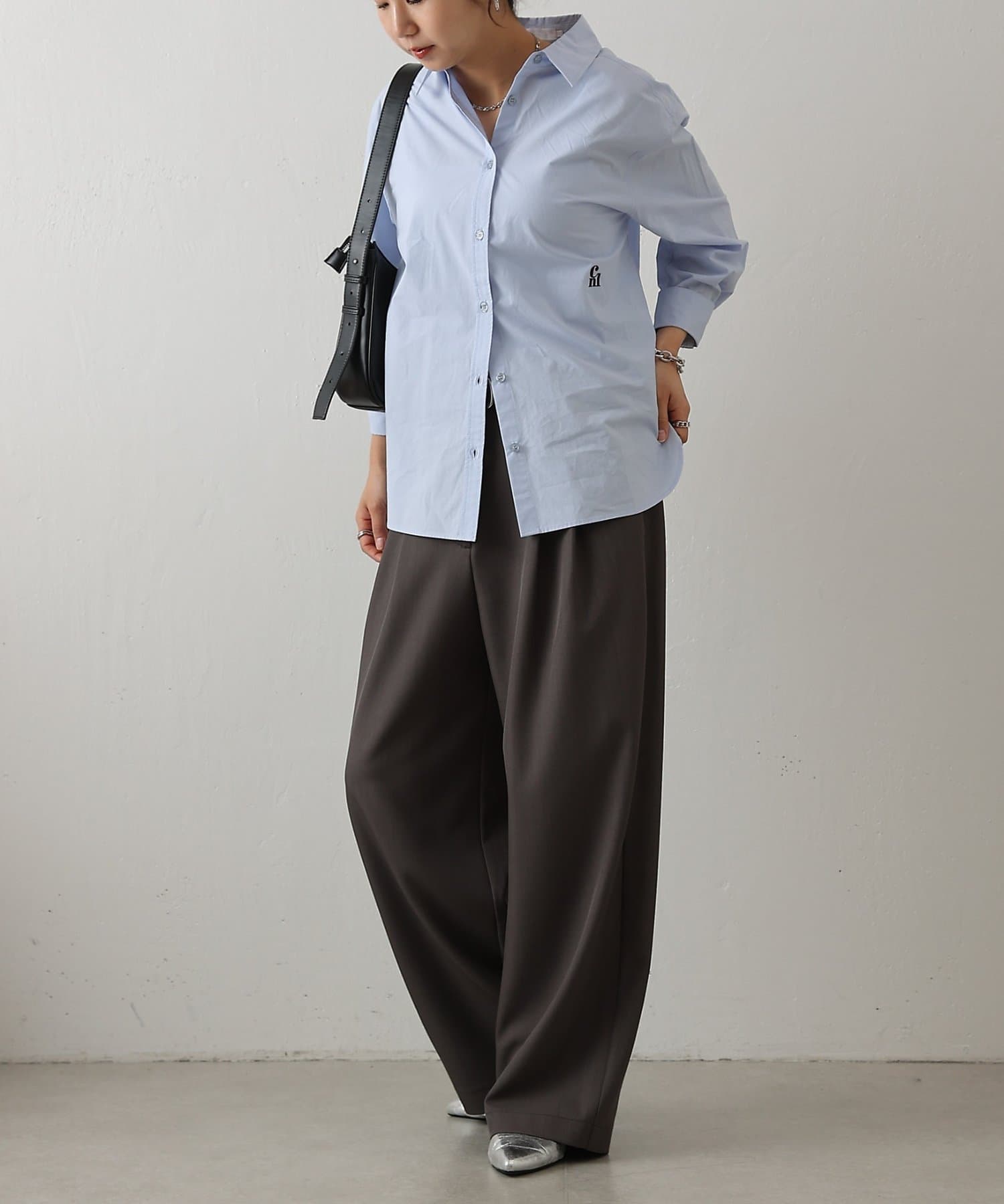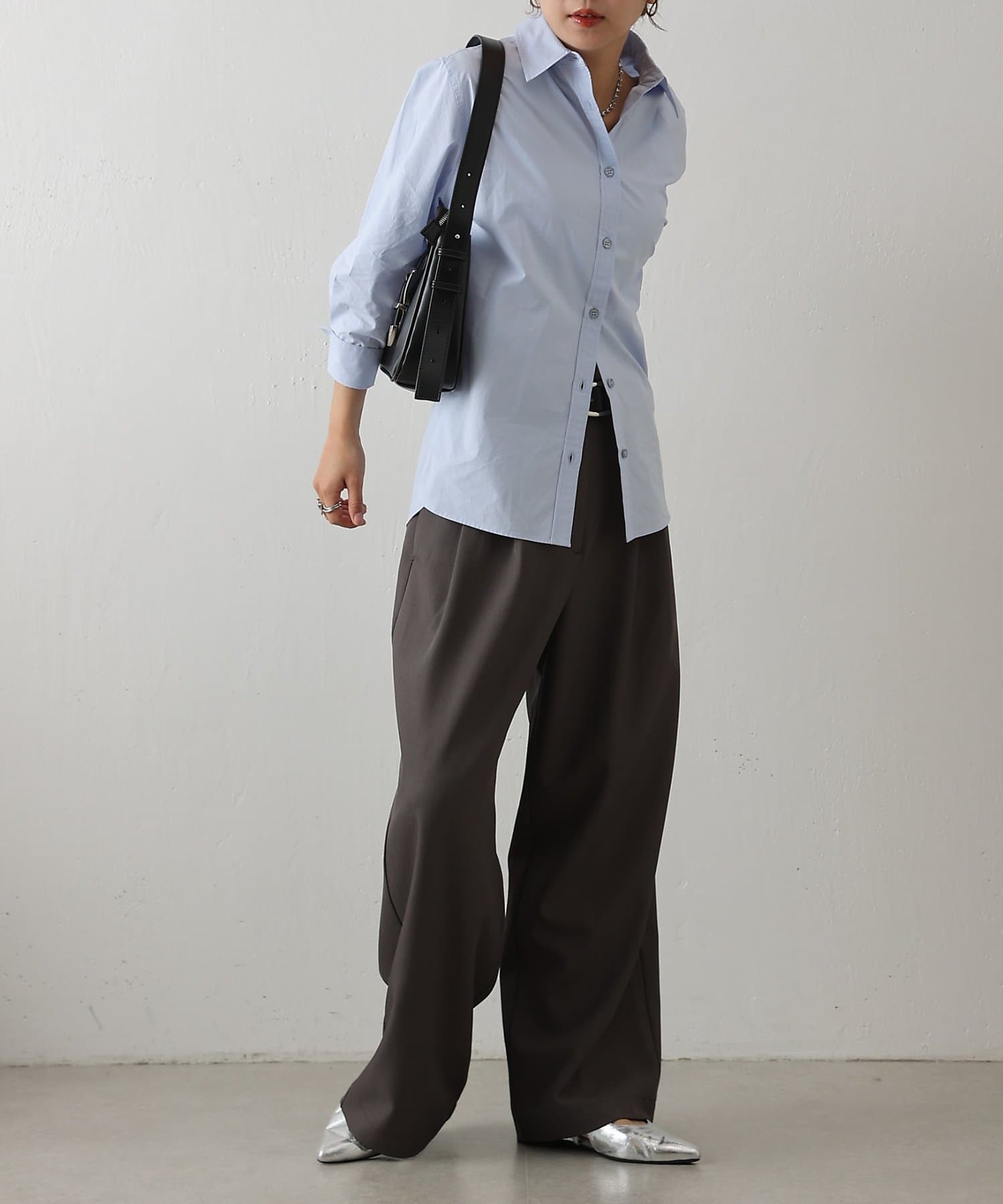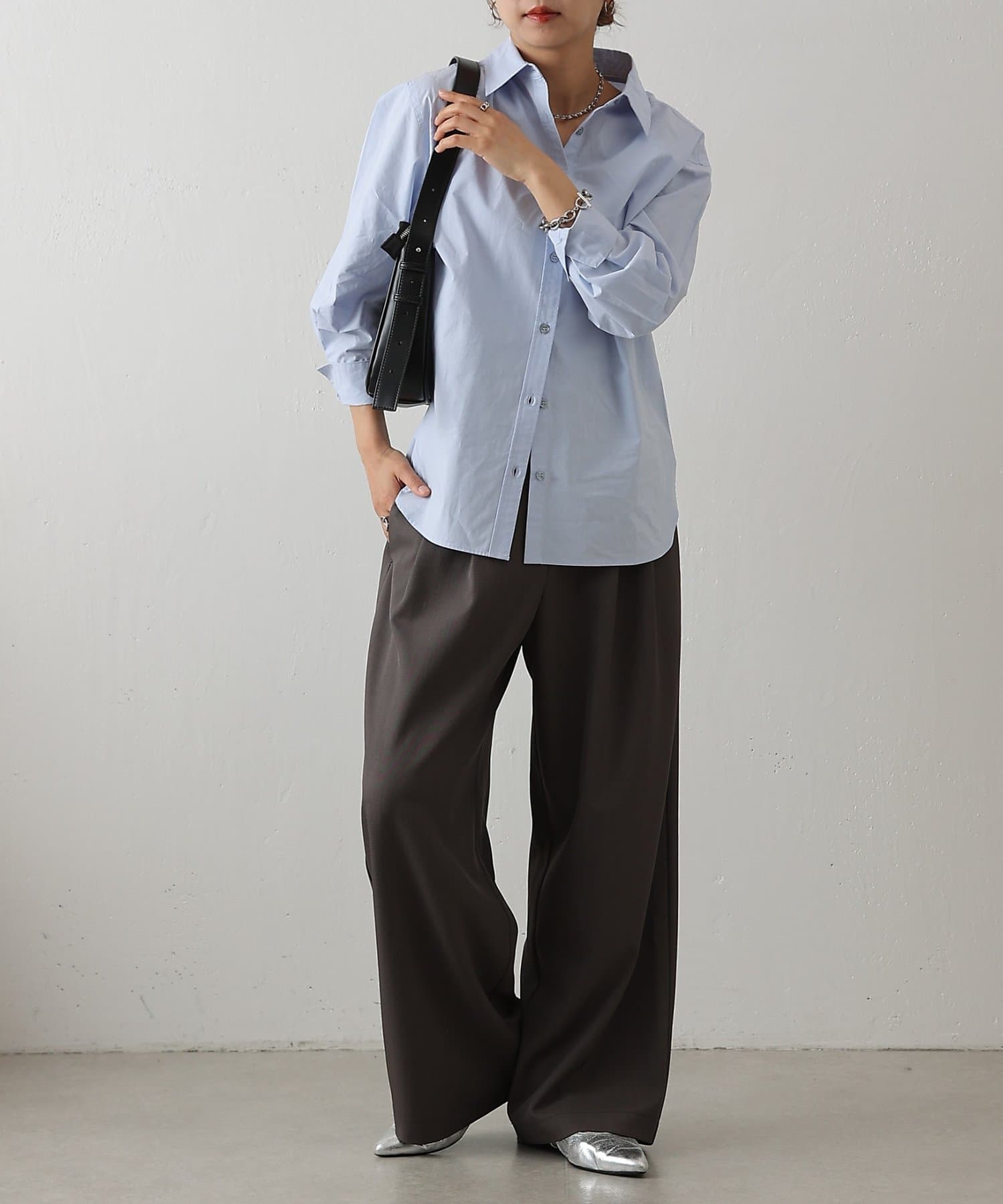 ワイドシルエットながら落ち感のある素材を使用することで広がりすぎず合わせられます。