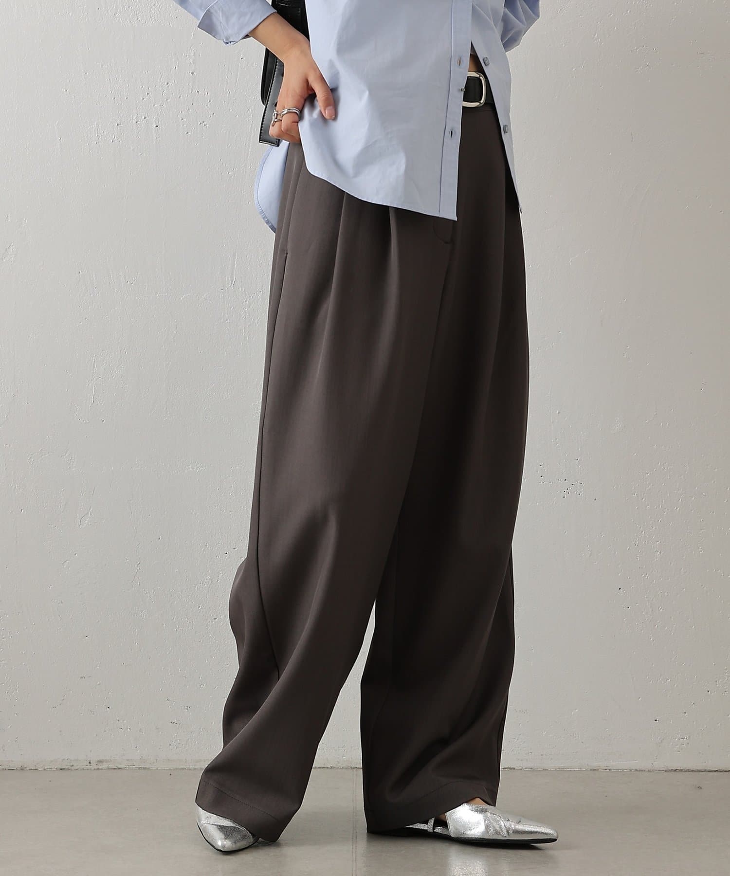 フロントに施した2タックが腰まわりに自然な立体感を生み、すっきりとした美脚ラインを演出するワイドパンツです。