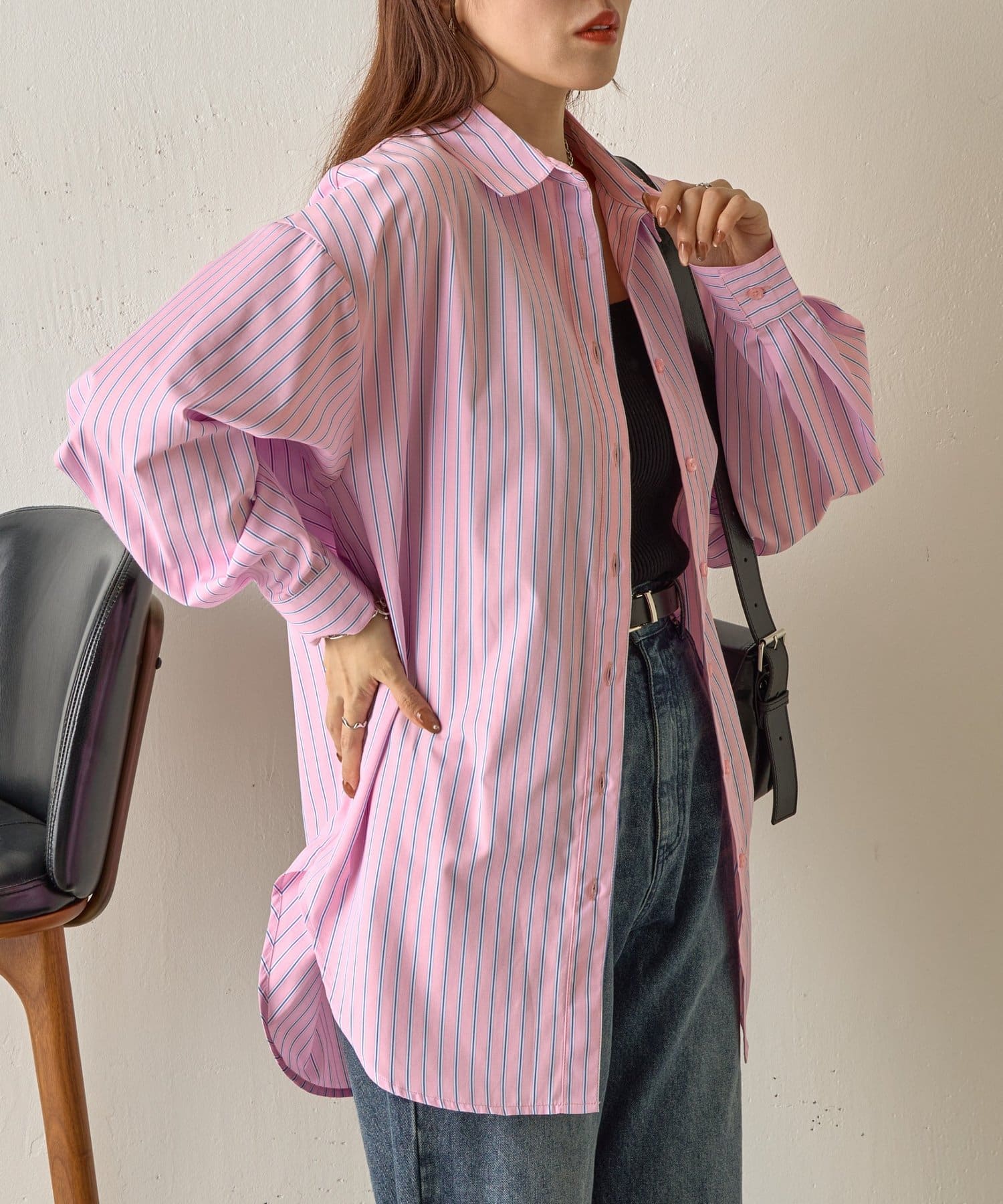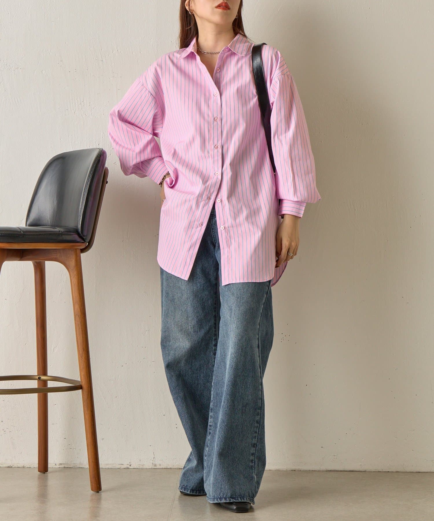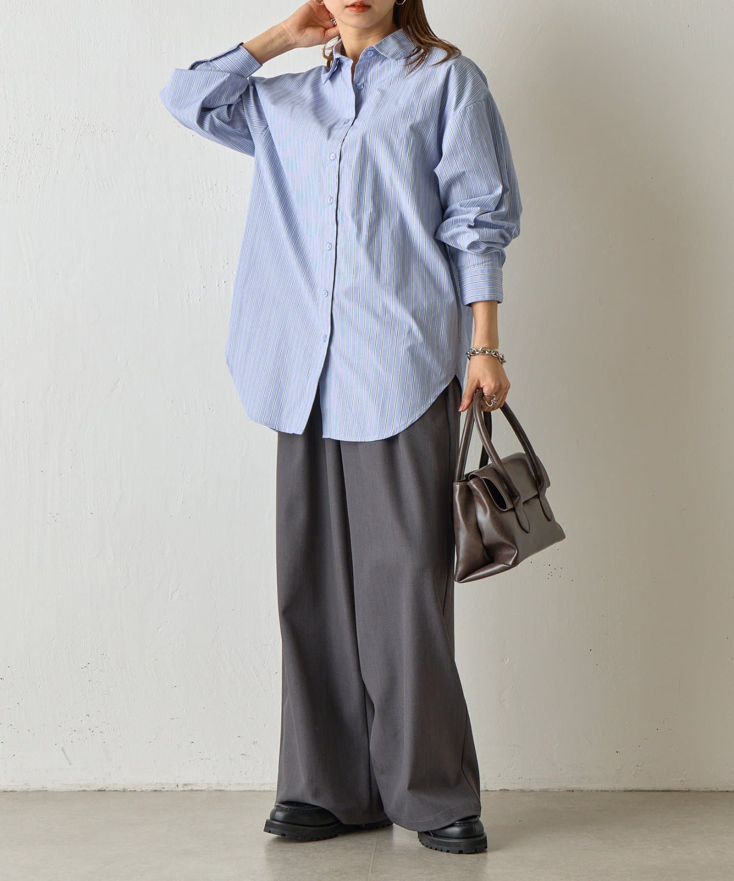 かっちりとしたイメージのストライプシャツですが、ゆったりしたシルエットになっているのでコーデに女性らしさをプラスします。