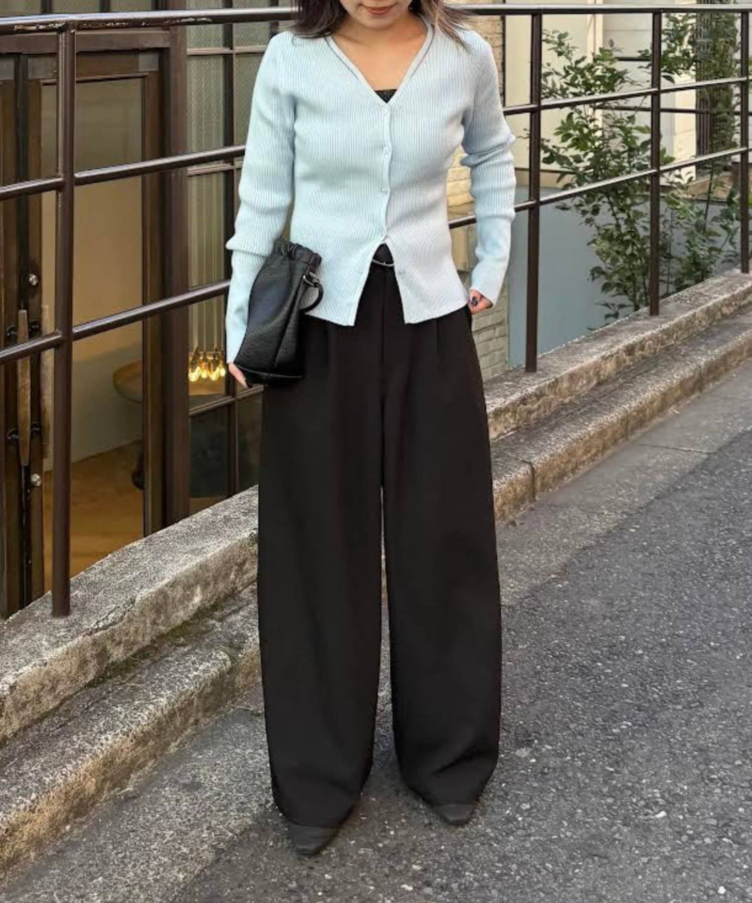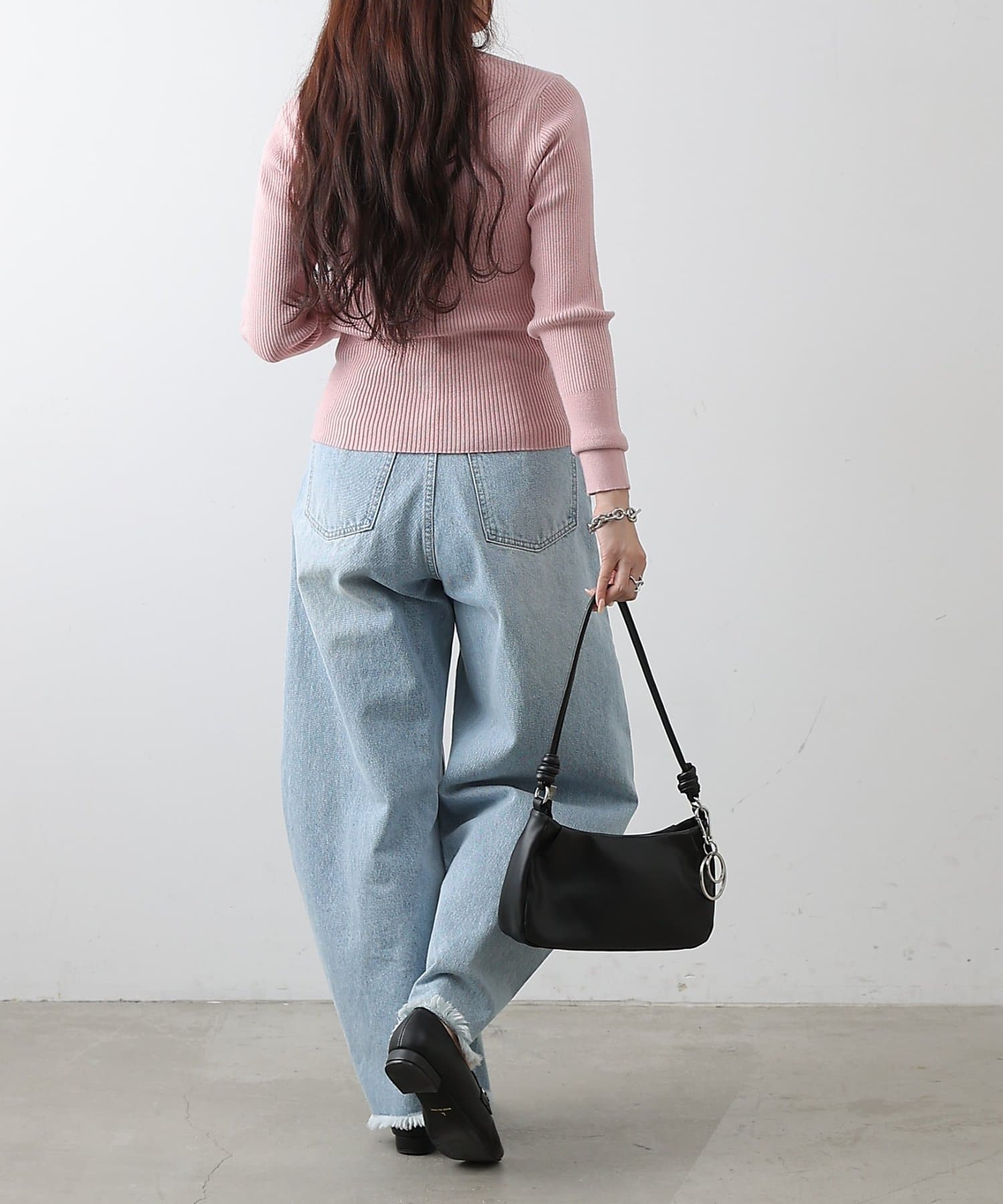 体のラインに沿うフィット感なので、ボトムスにはワイドパンツやフレアスカートを合わせるとメリハリのあるシルエットに。