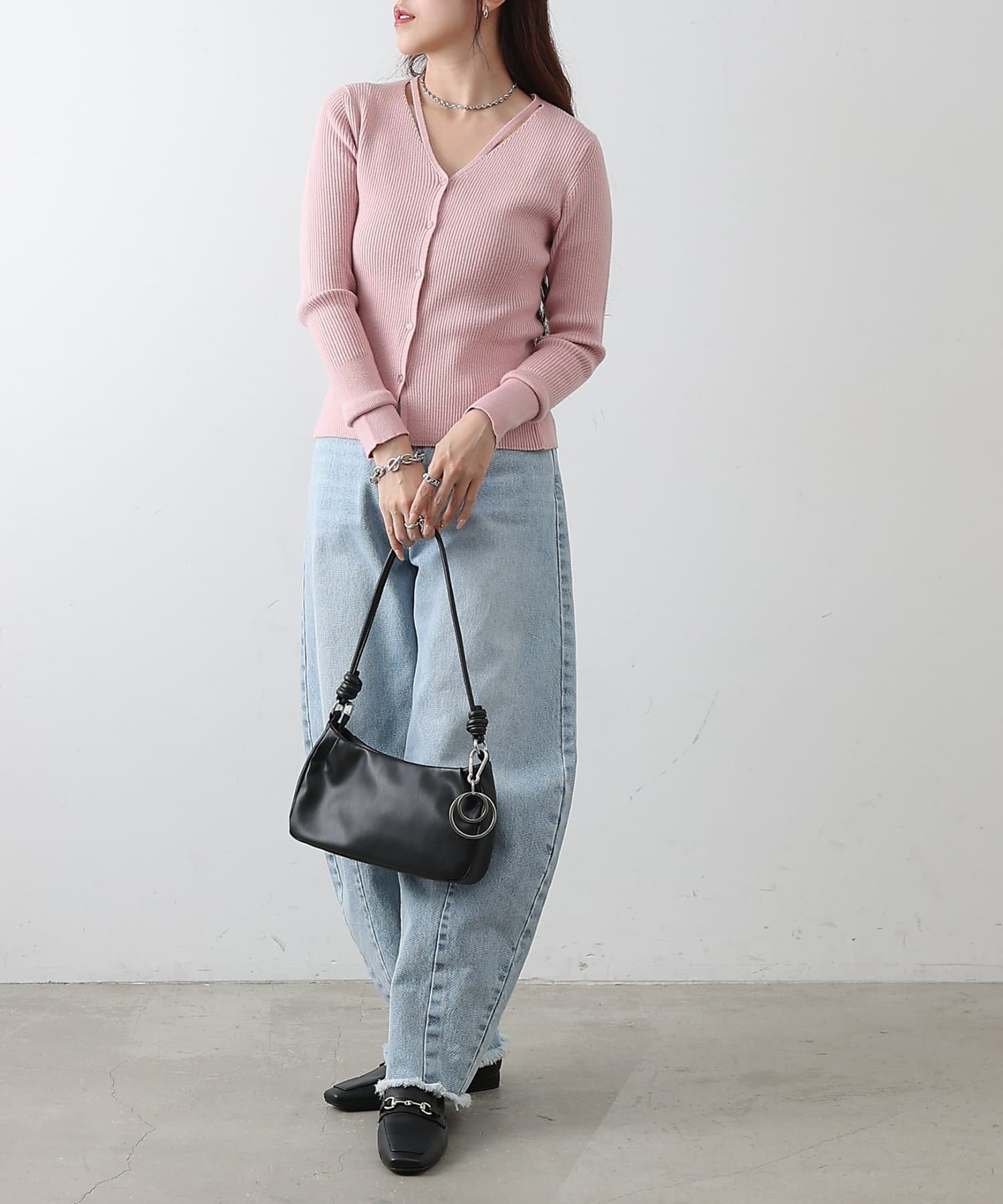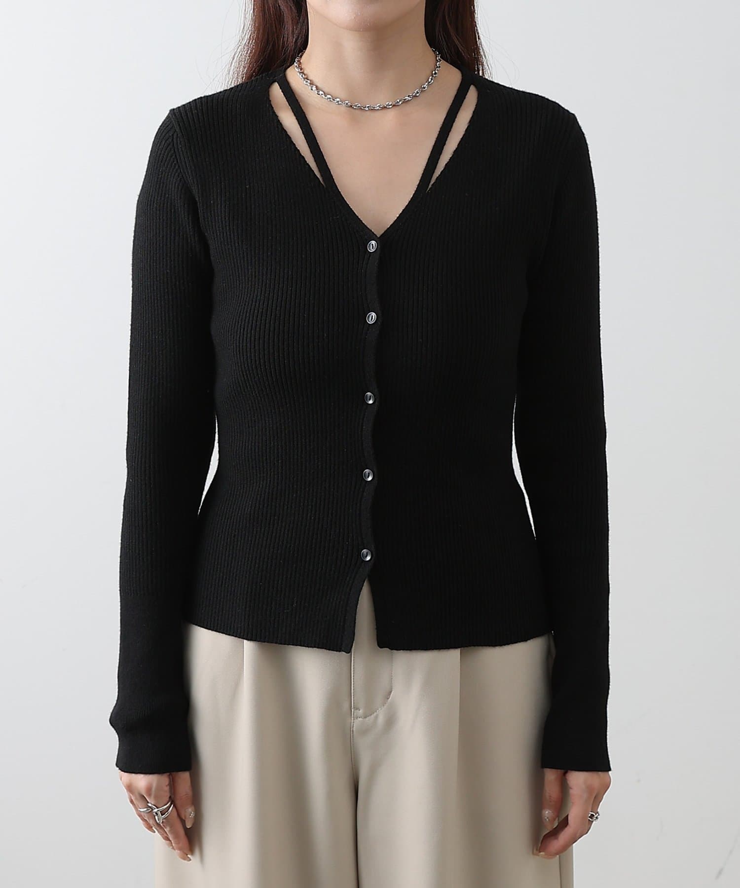 レイヤード風の紐デザインが周りと差をつけられる着映えニットカーディガン。