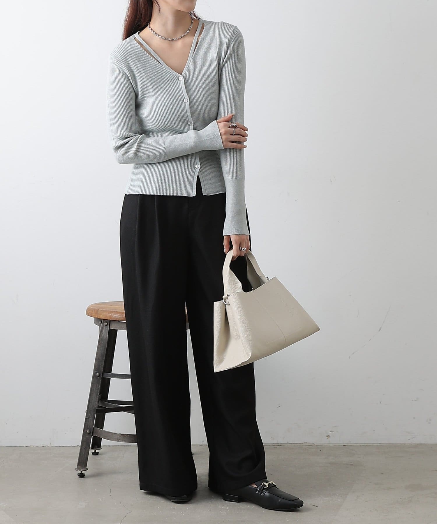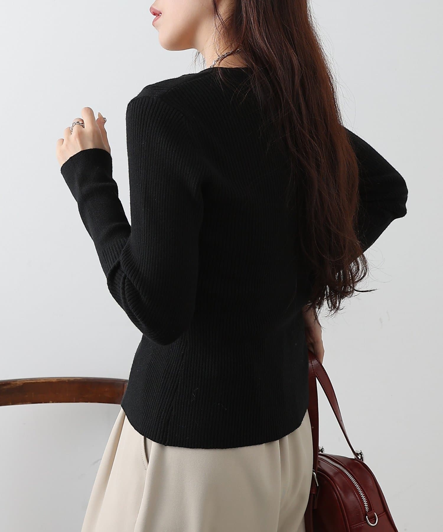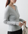 シャープなVネックが顔まわりをすっきりと見せ、女性らしい雰囲気と程よい抜け感を演出します。
