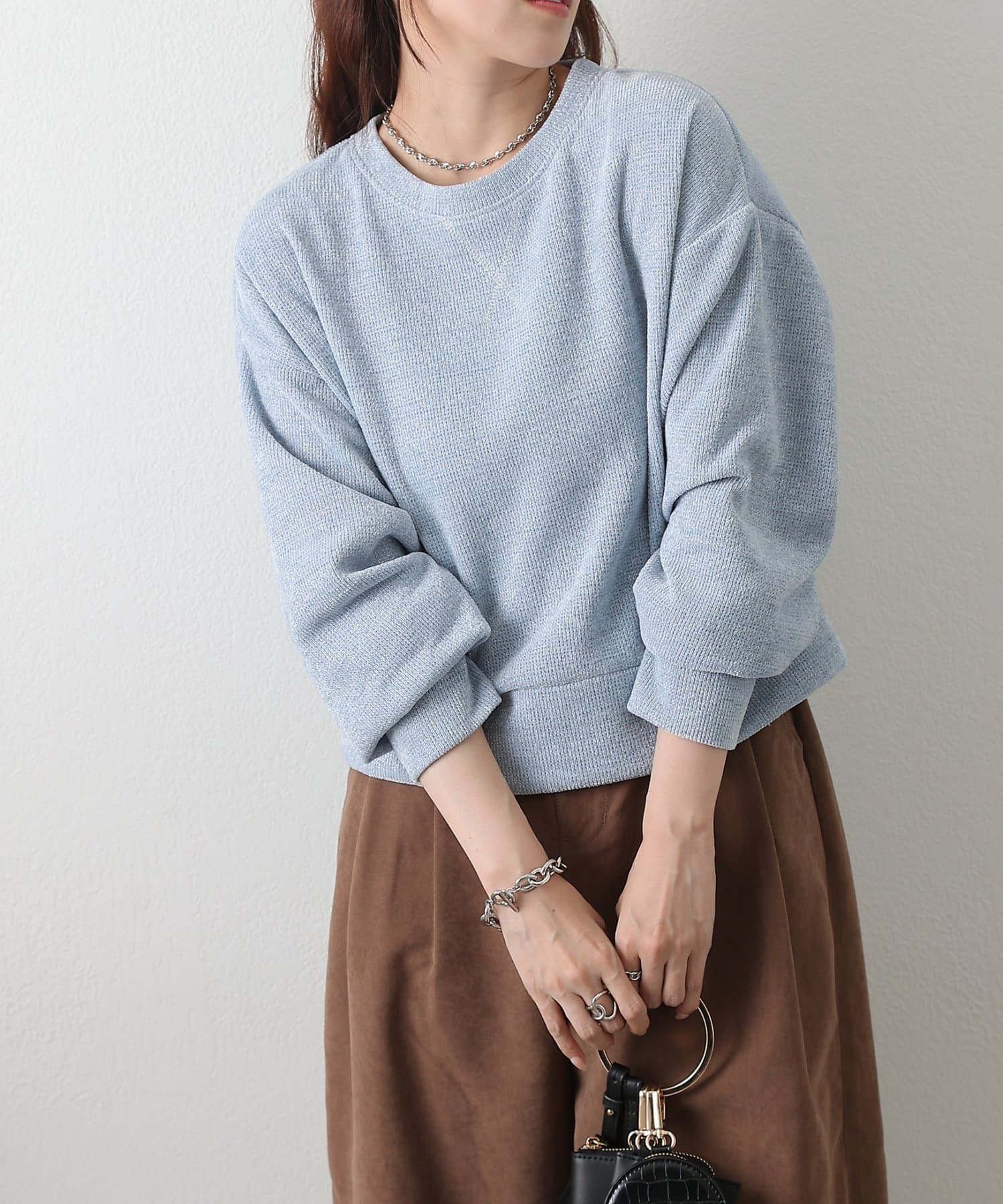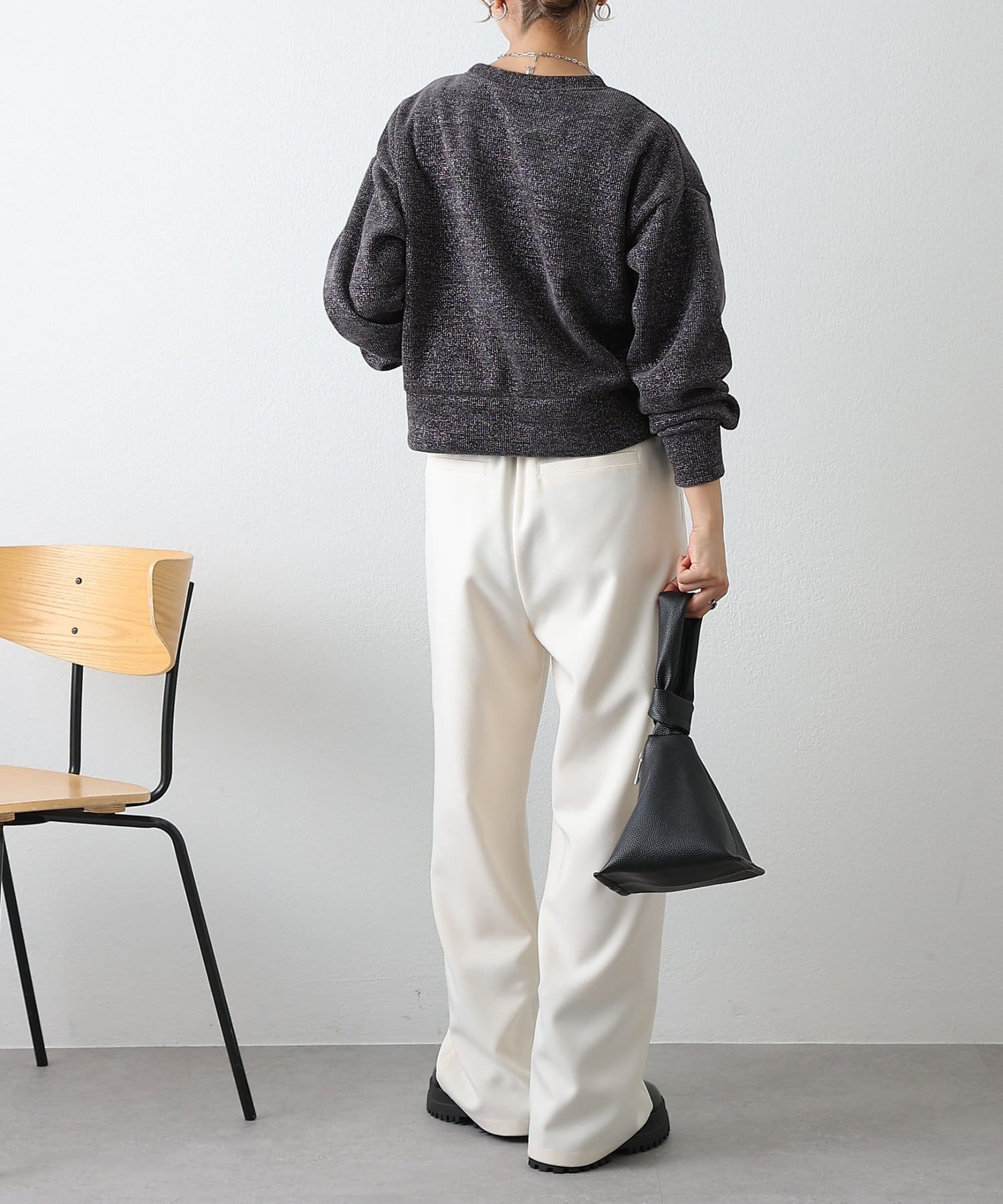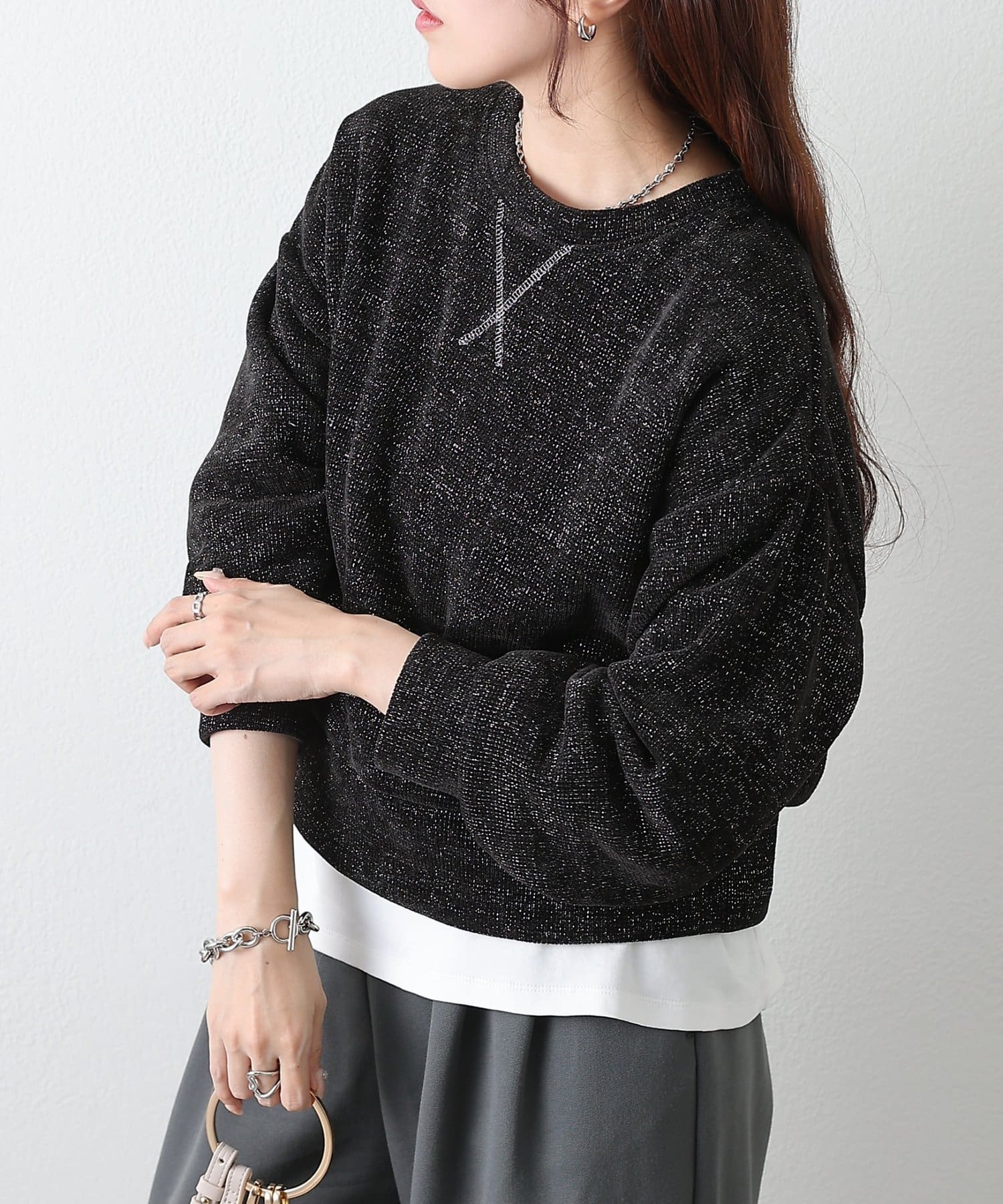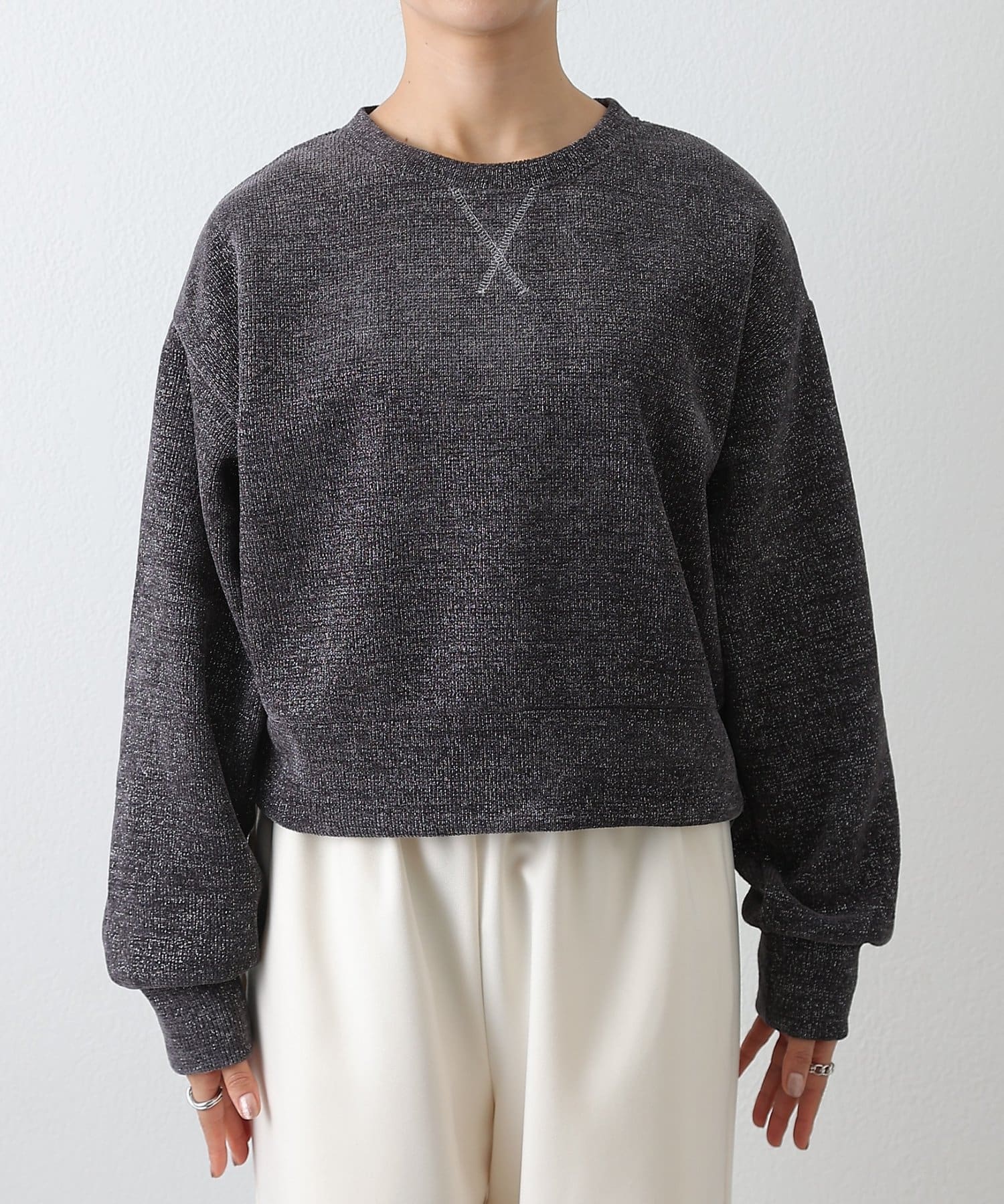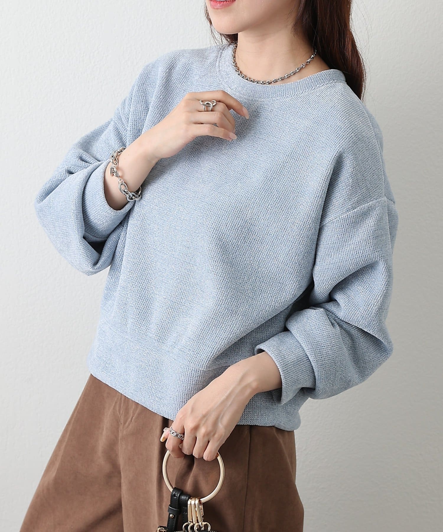 繊細に輝くラメを編み込んだモール素材が、柔らかな質感と華やかな存在感をあわせ持つクルーネックプルオーバーです。