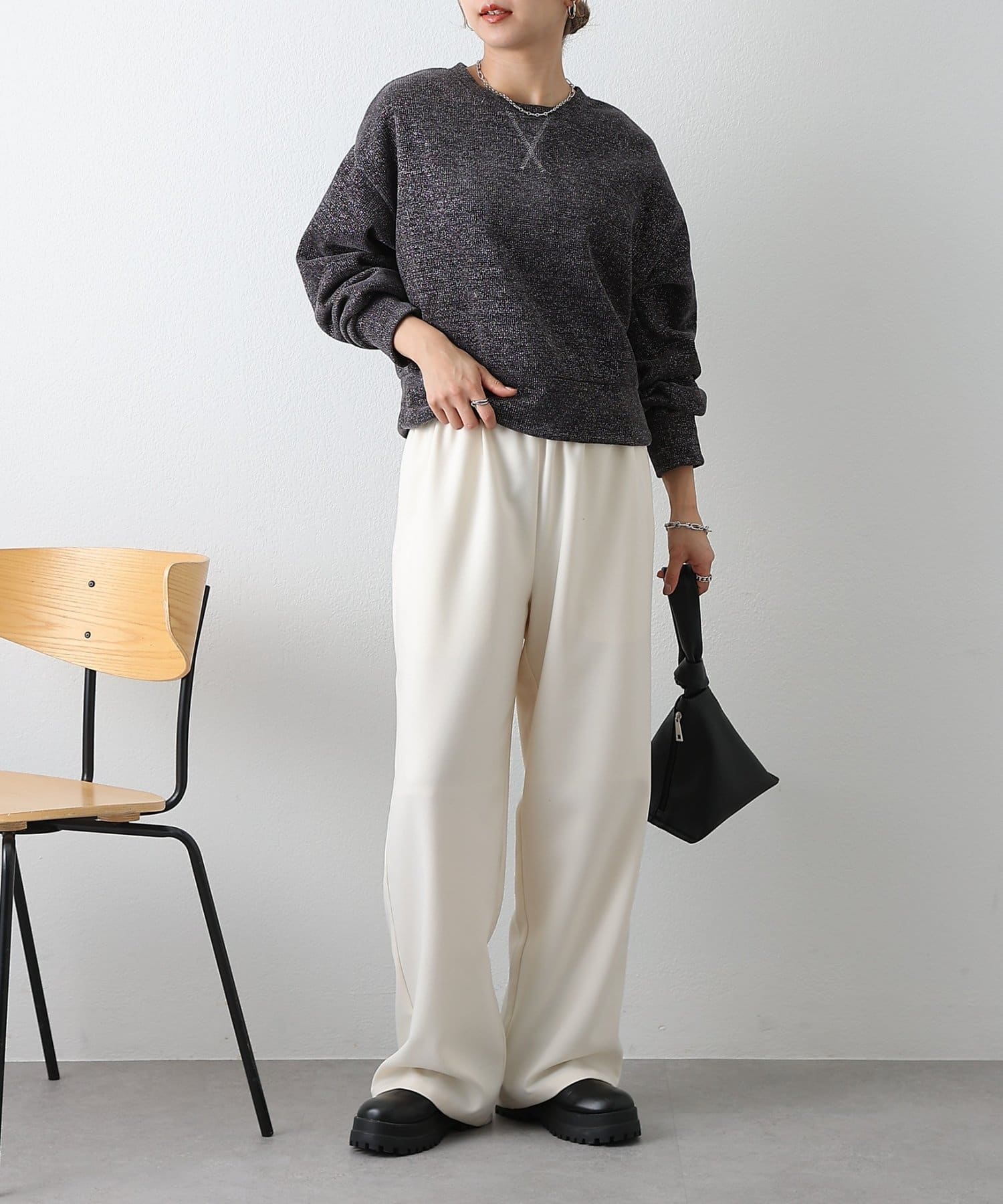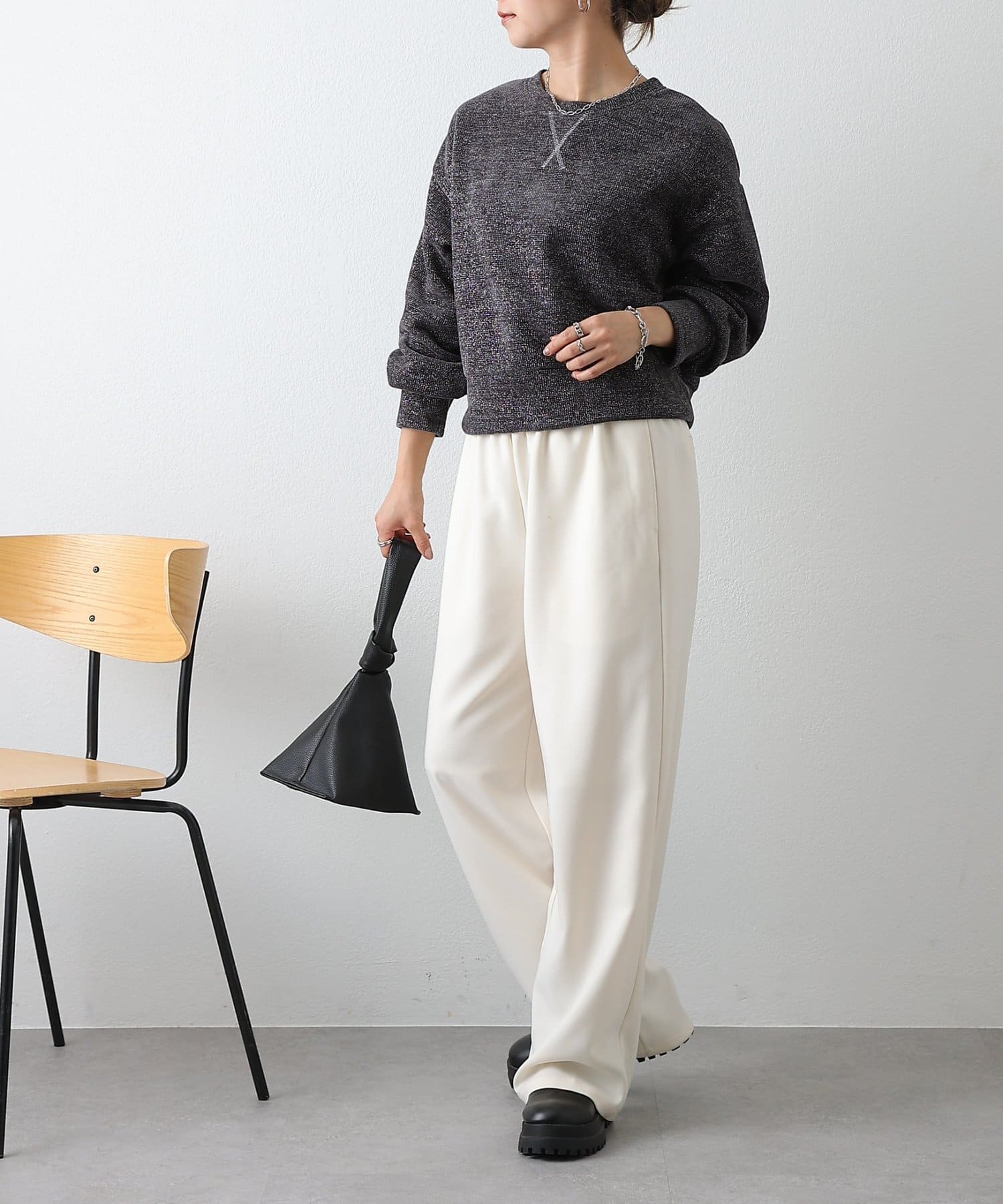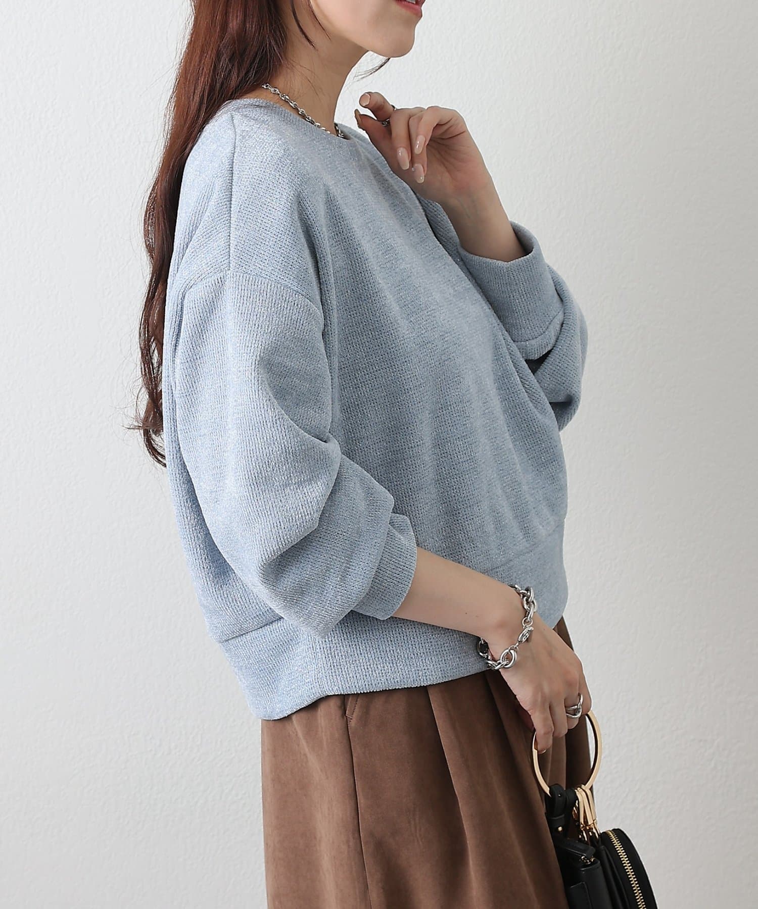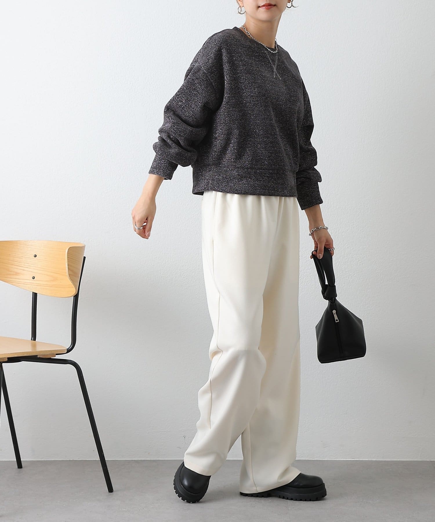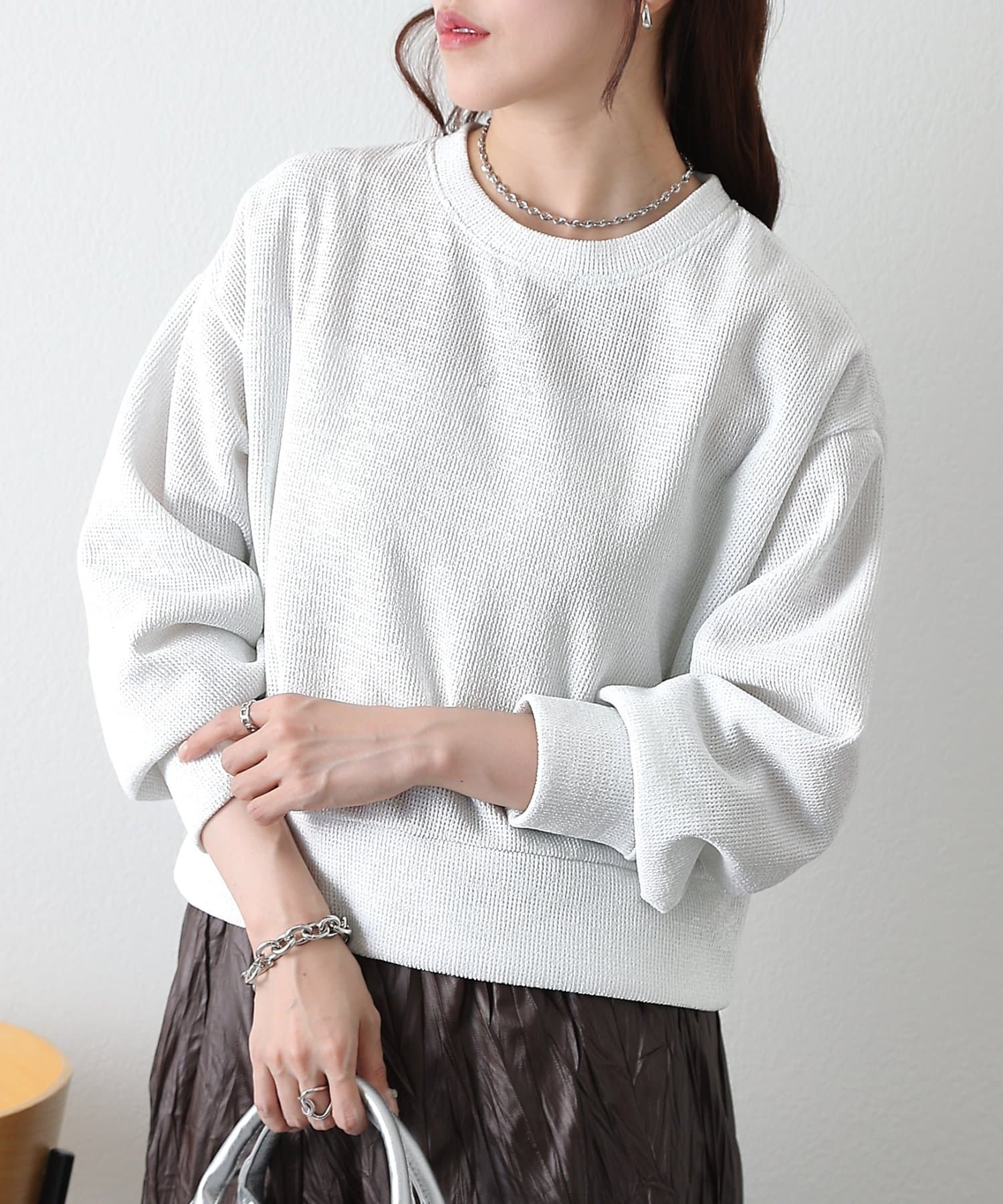 繊細に輝くラメを編み込んだモール素材が、柔らかな質感と華やかな存在感をあわせ持つクルーネックプルオーバーです。