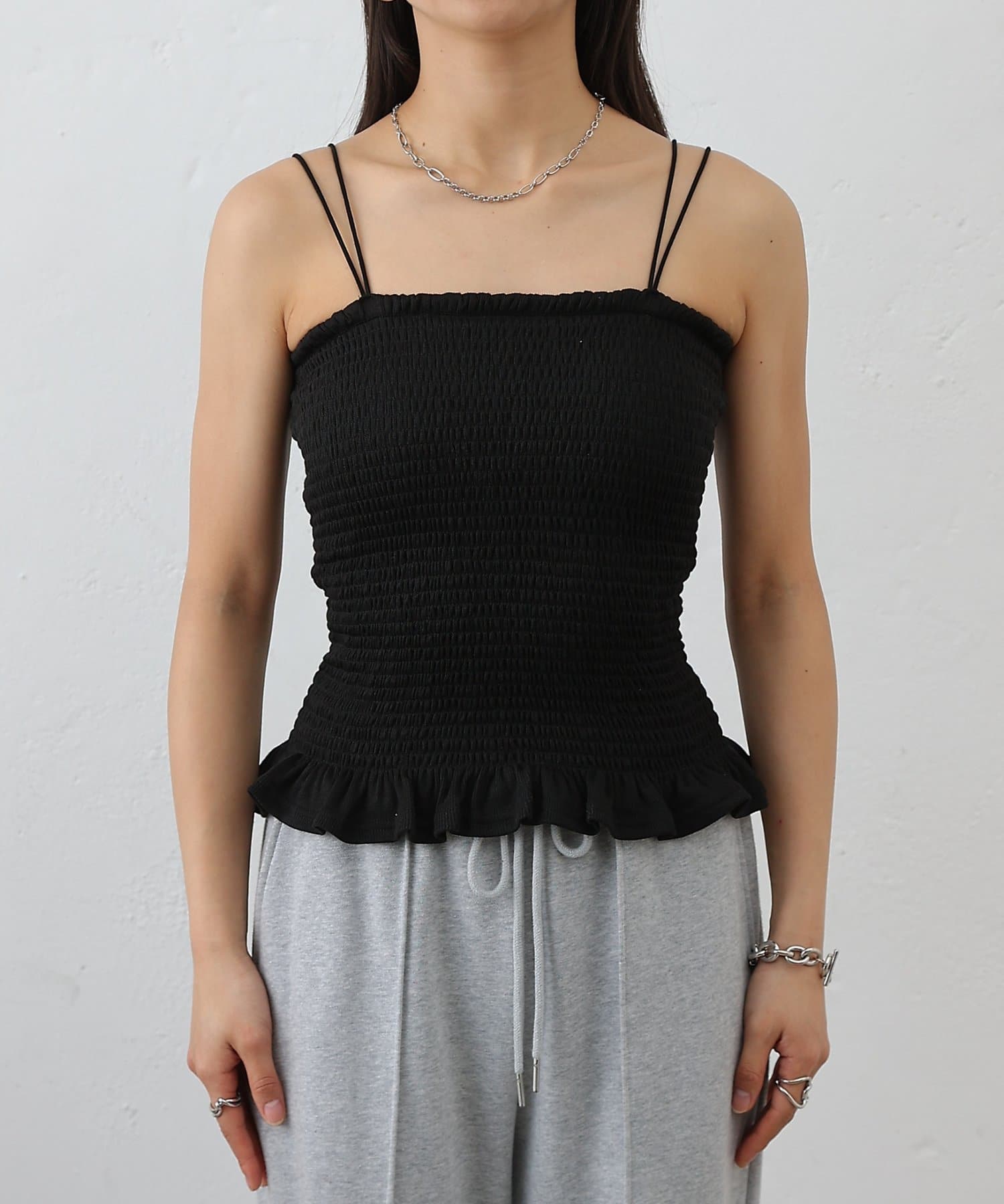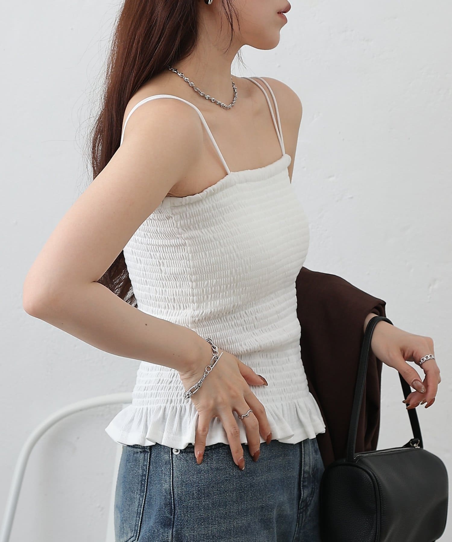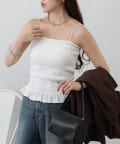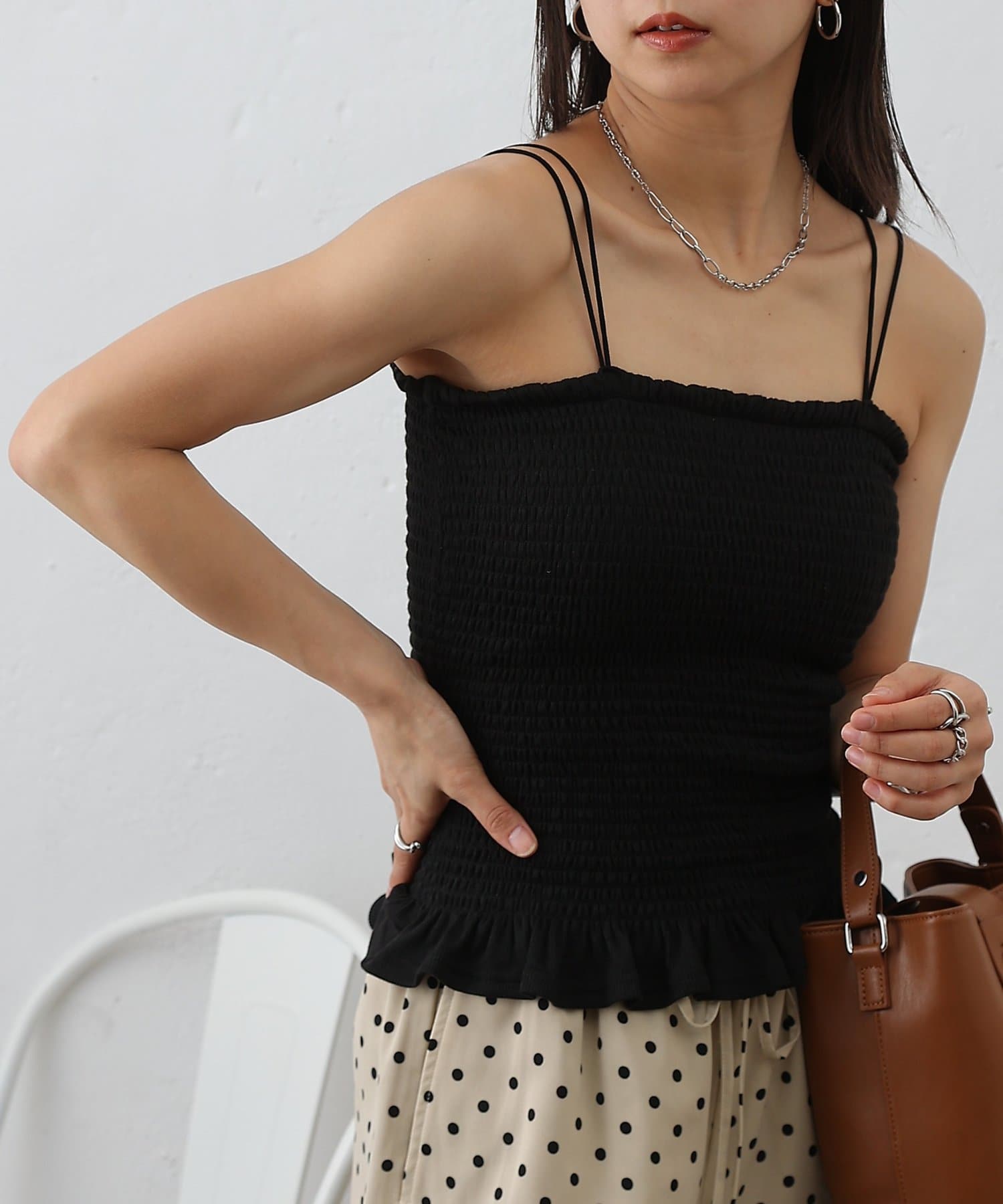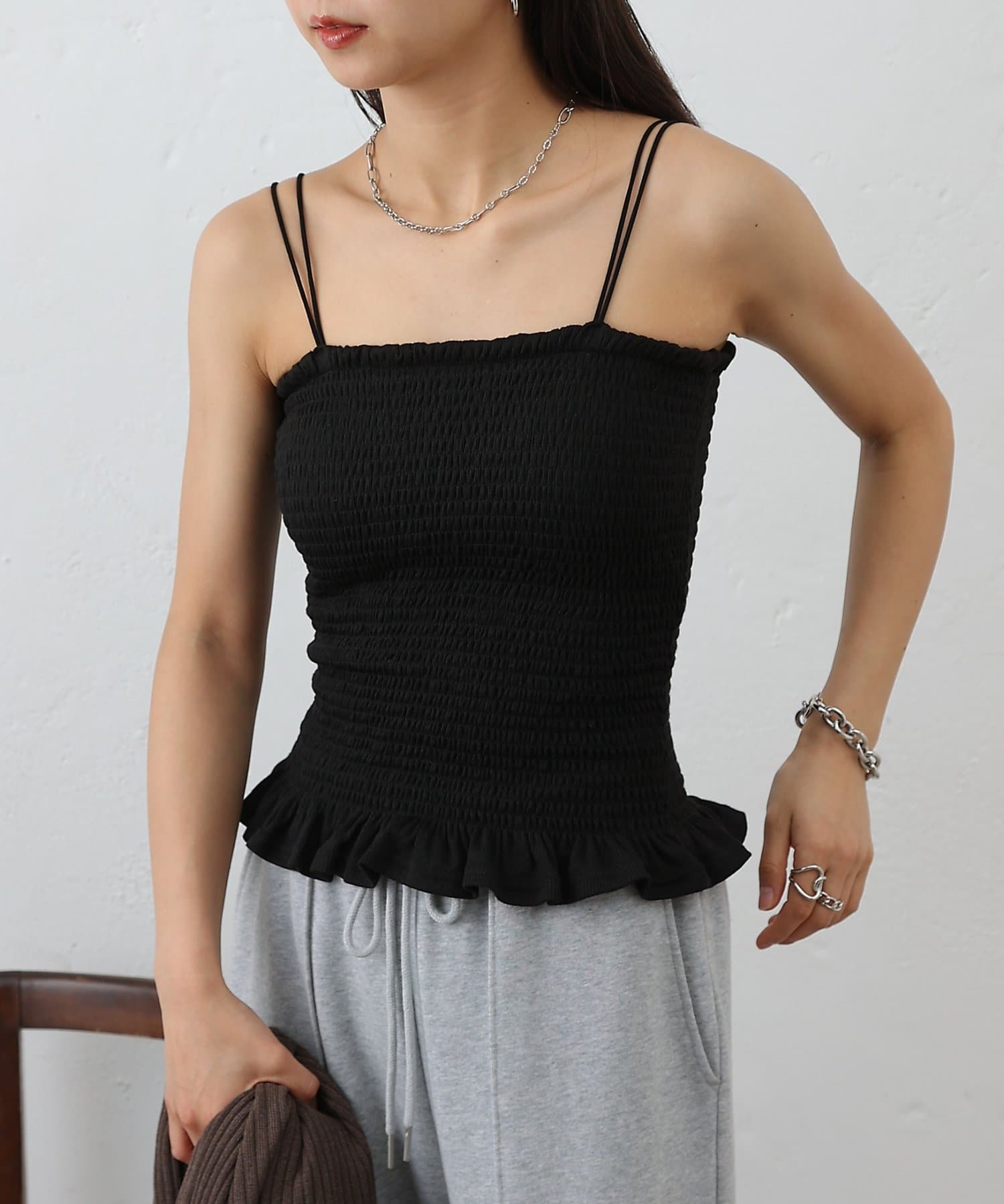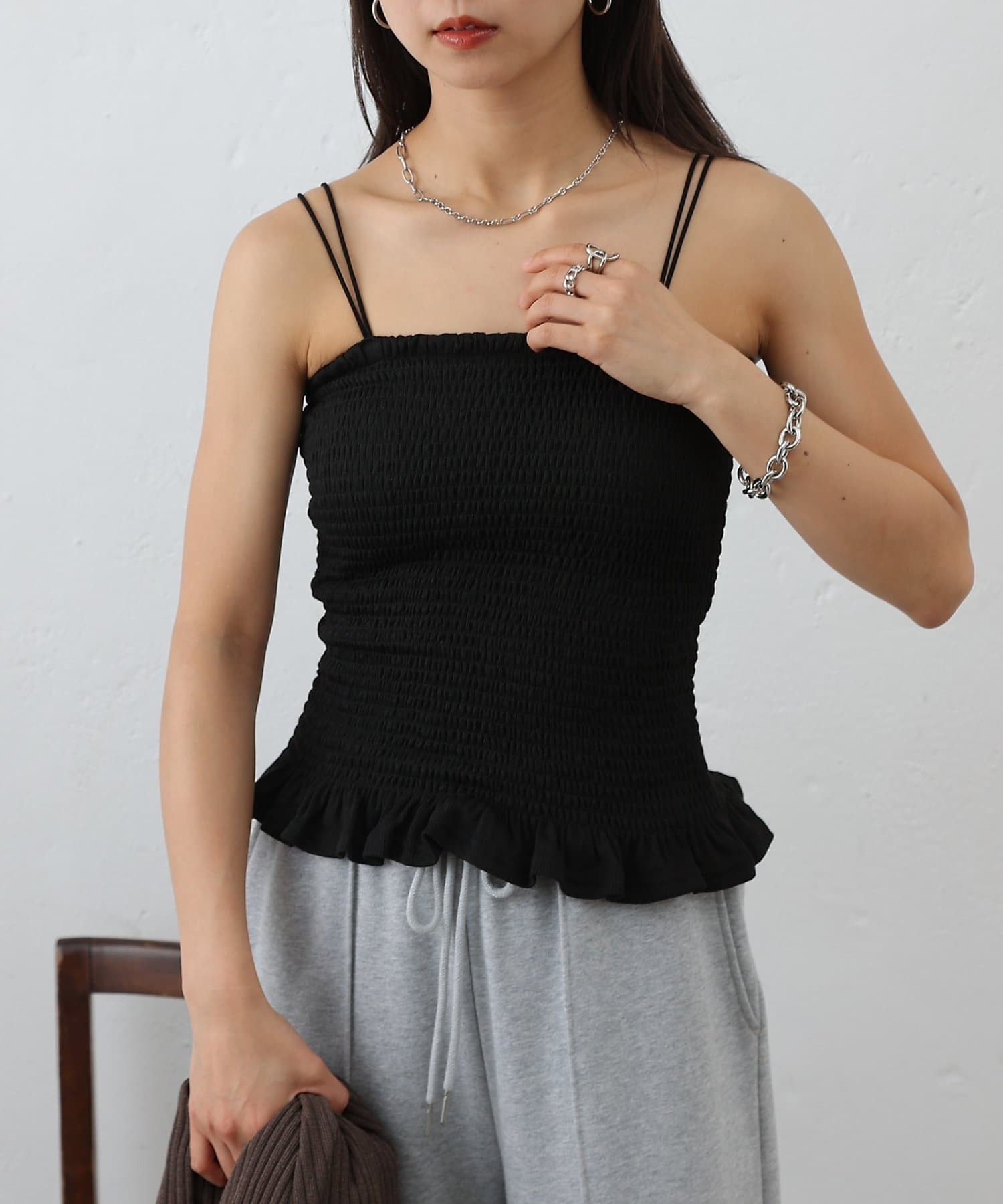 シャーリングデザインと裾のフリルがかわいいカップ付きキャミソールです。