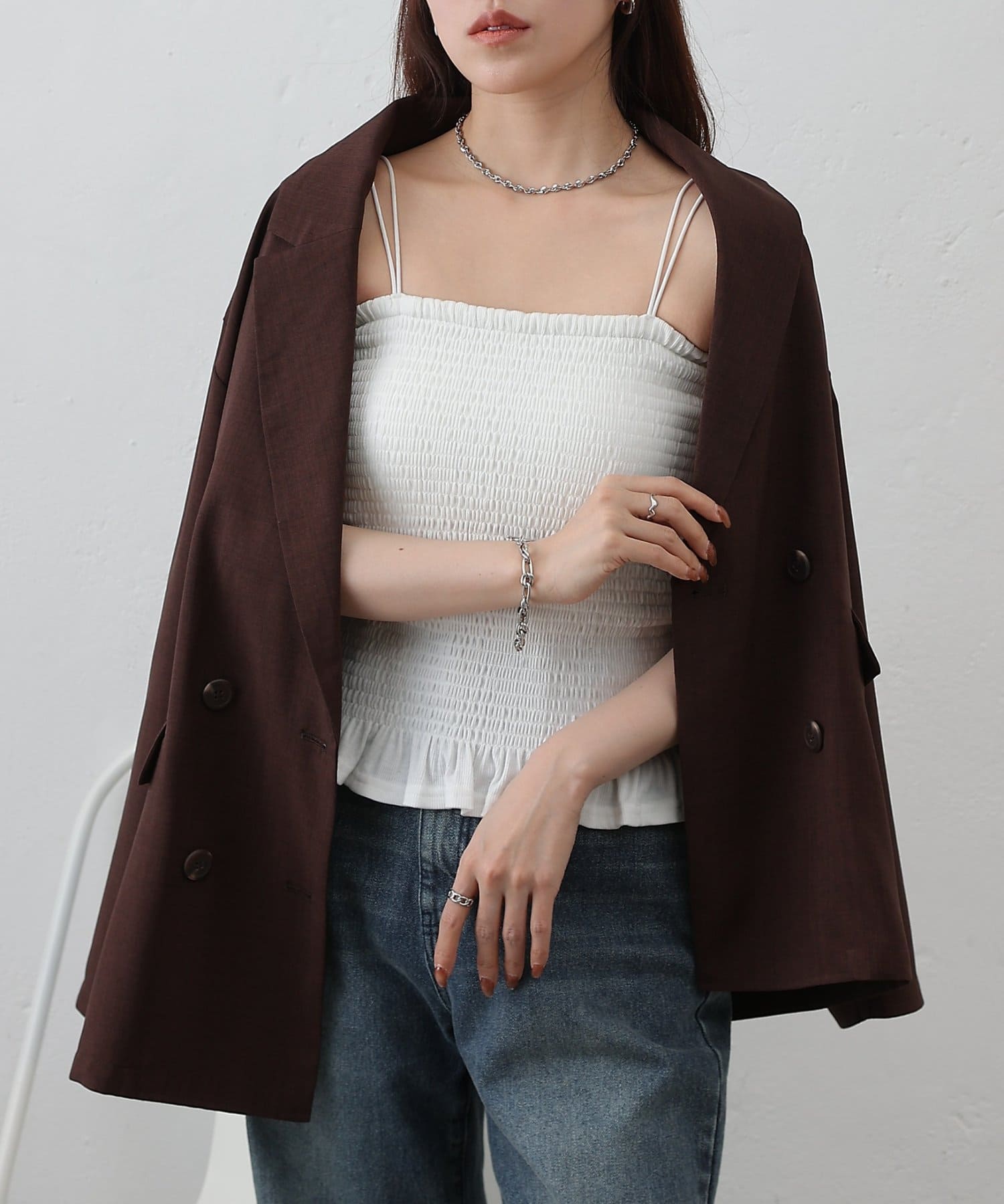 シャツやジャケットのインナーだけでなく、胸元などが開いている服のインナーとして合わせ、シャーリング部分を見せて着ると普段と違う着こなしになります。
