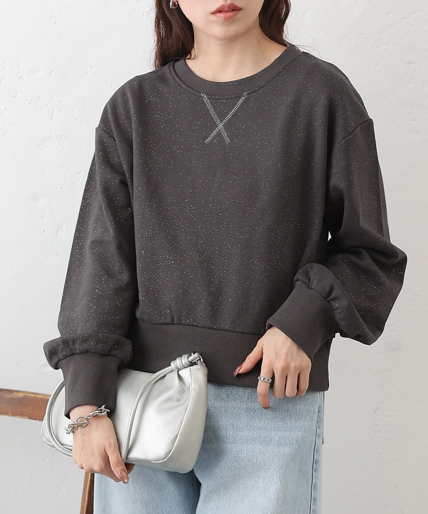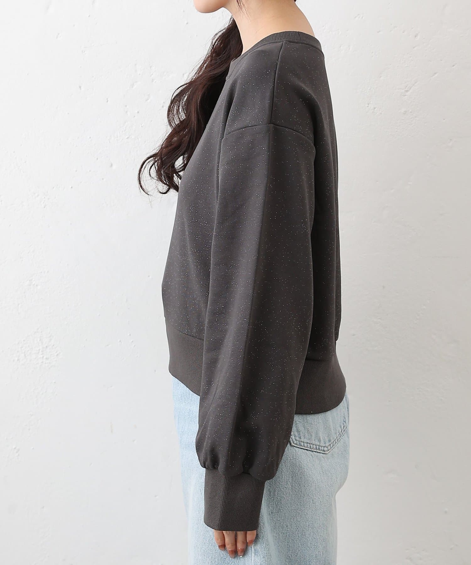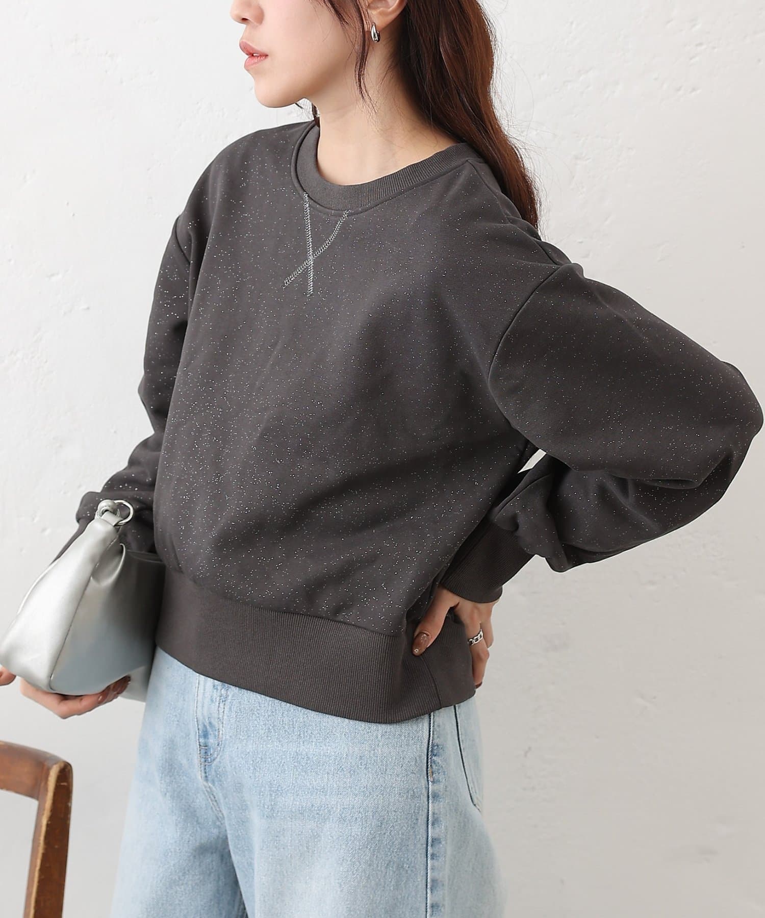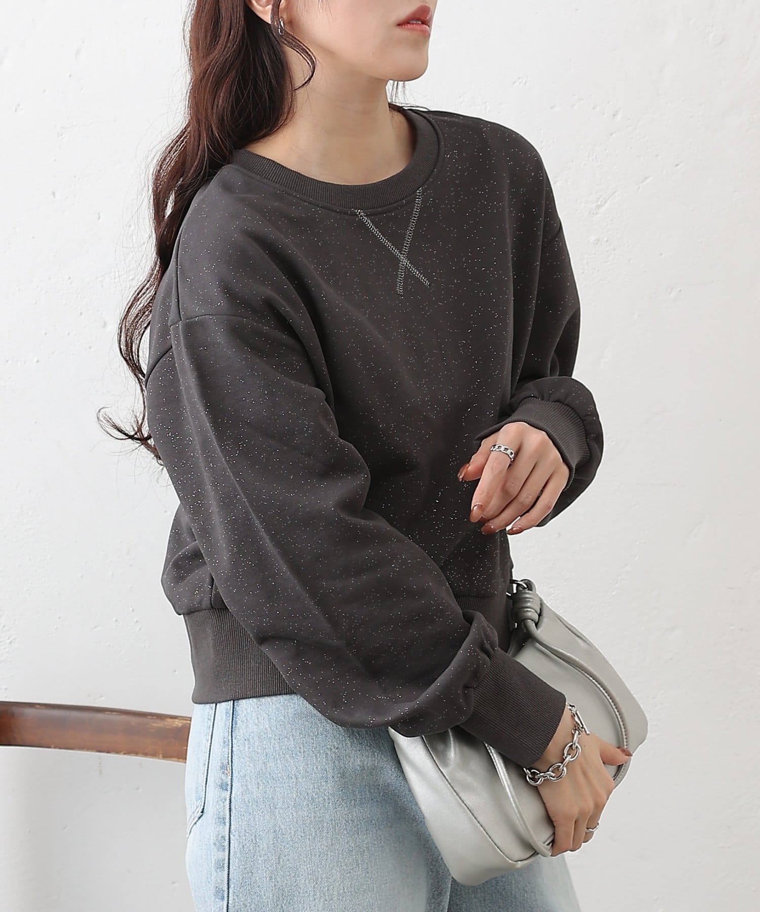主張しすぎない上品なラメを使用しているので、カジュアルなスウェットスタイルに女性らしさと華やかさをプラスします。