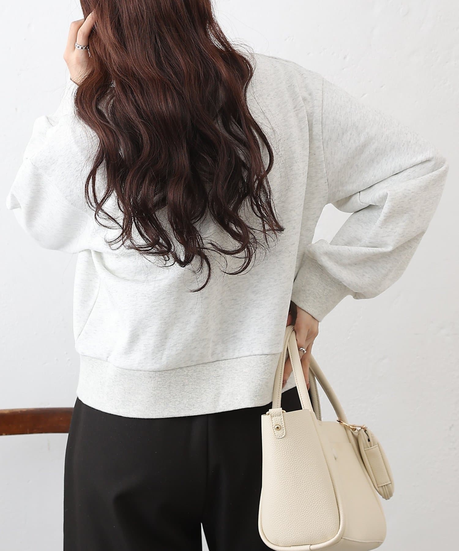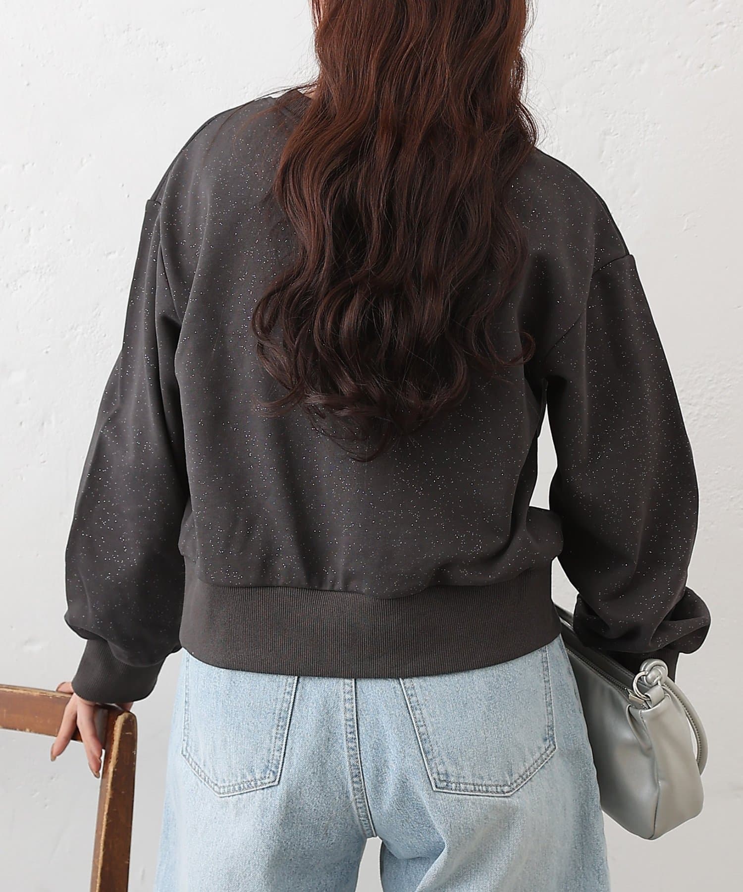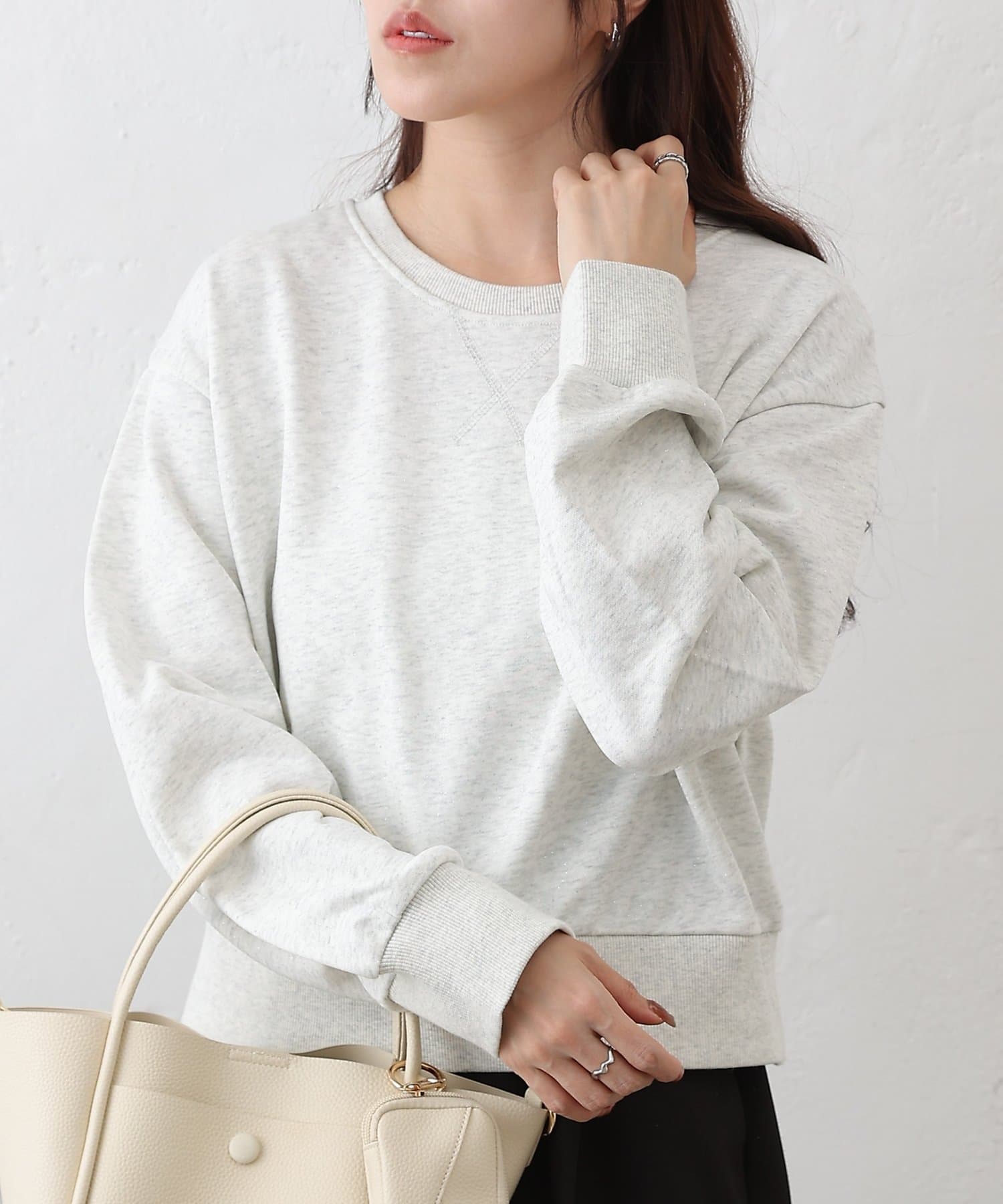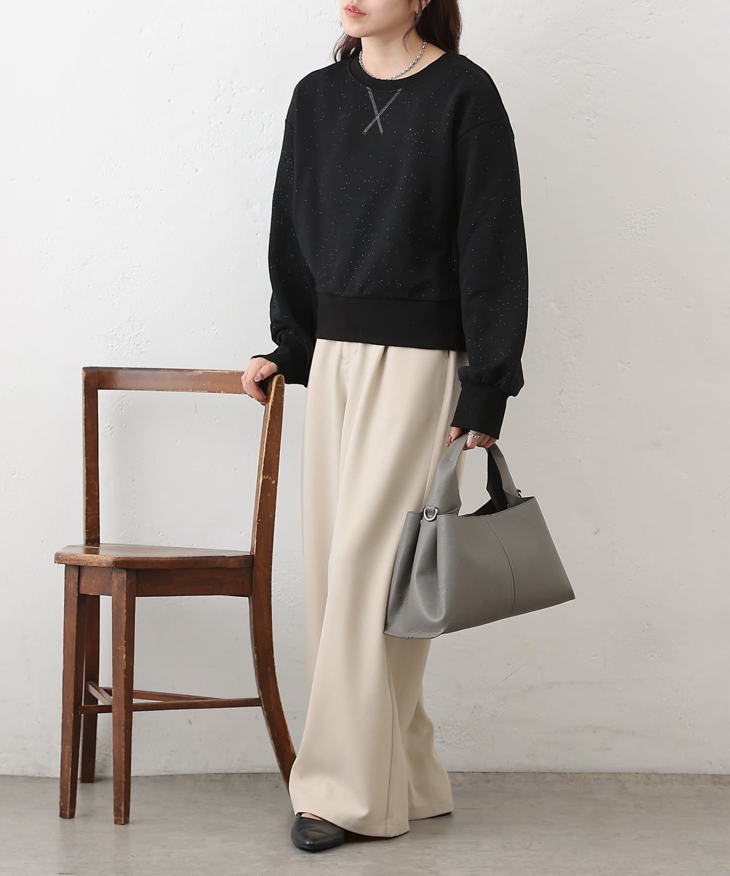 主張しすぎない上品なラメを使用しているので、カジュアルなスウェットスタイルに女性らしさと華やかさをプラスします。