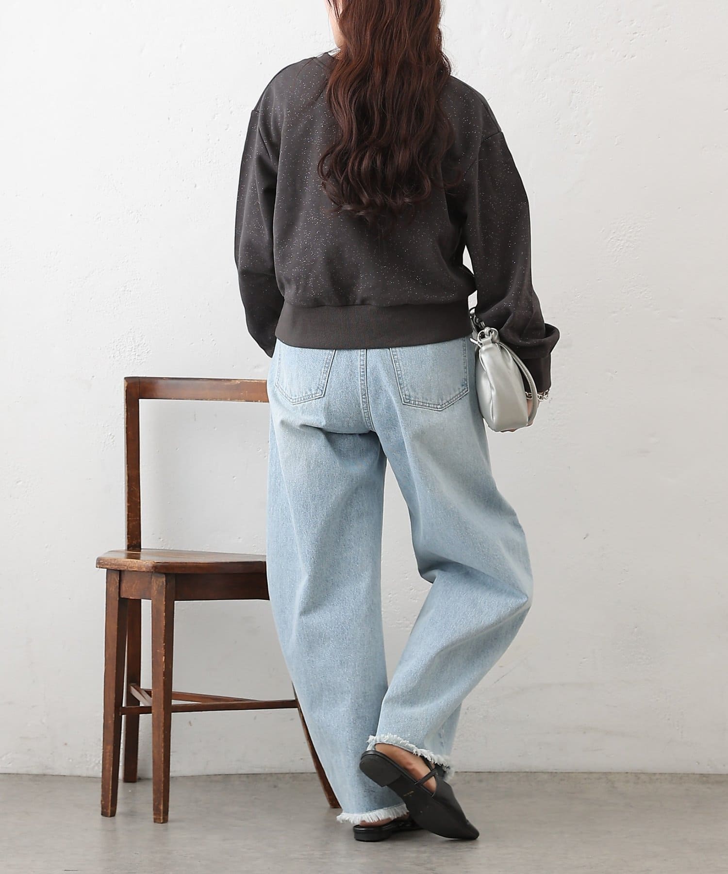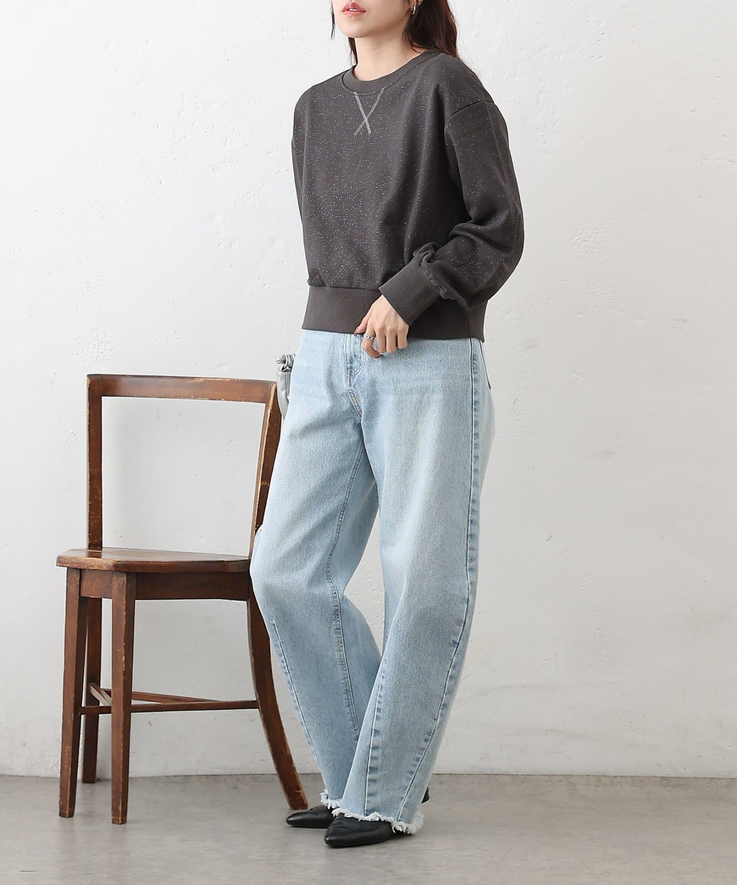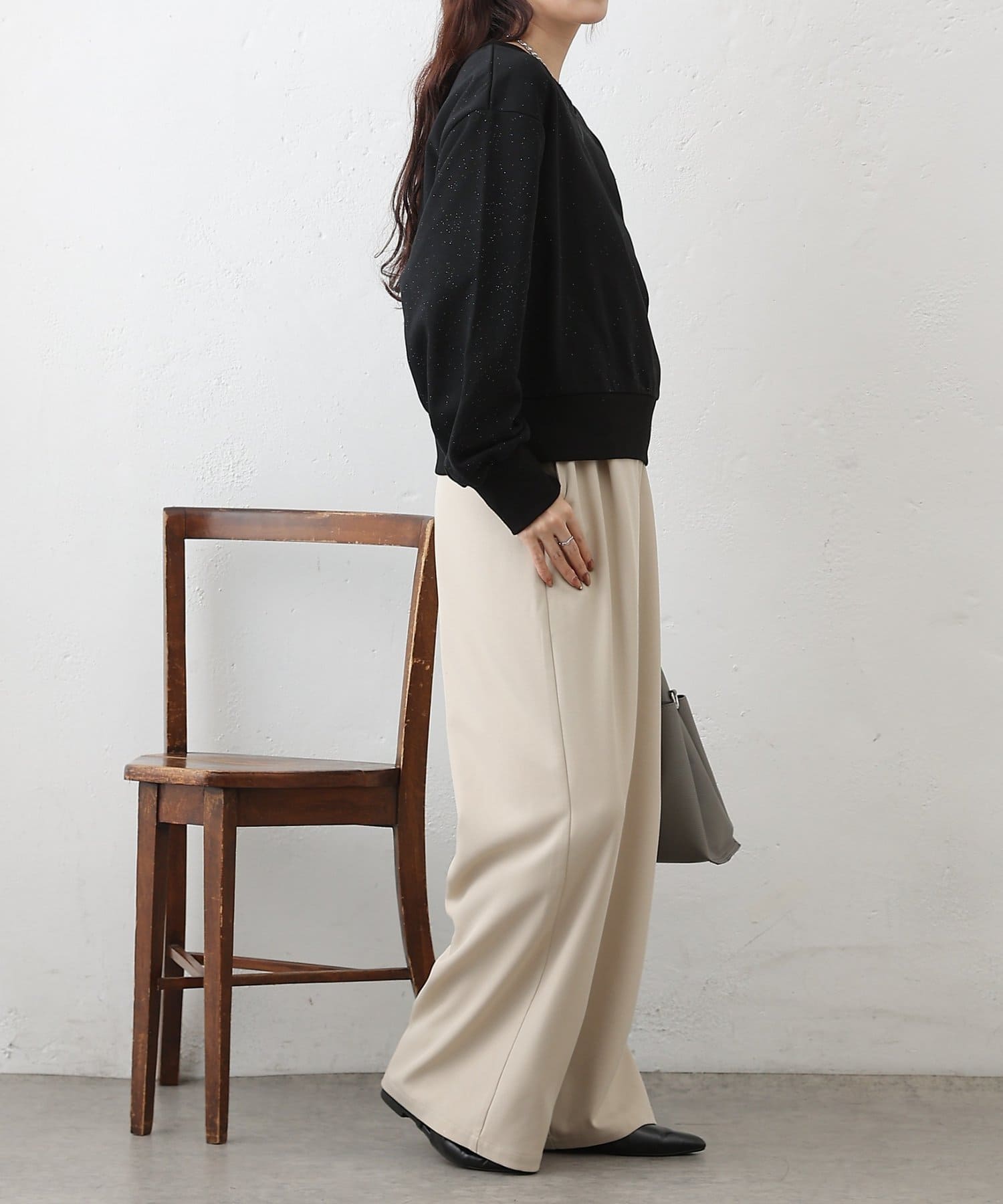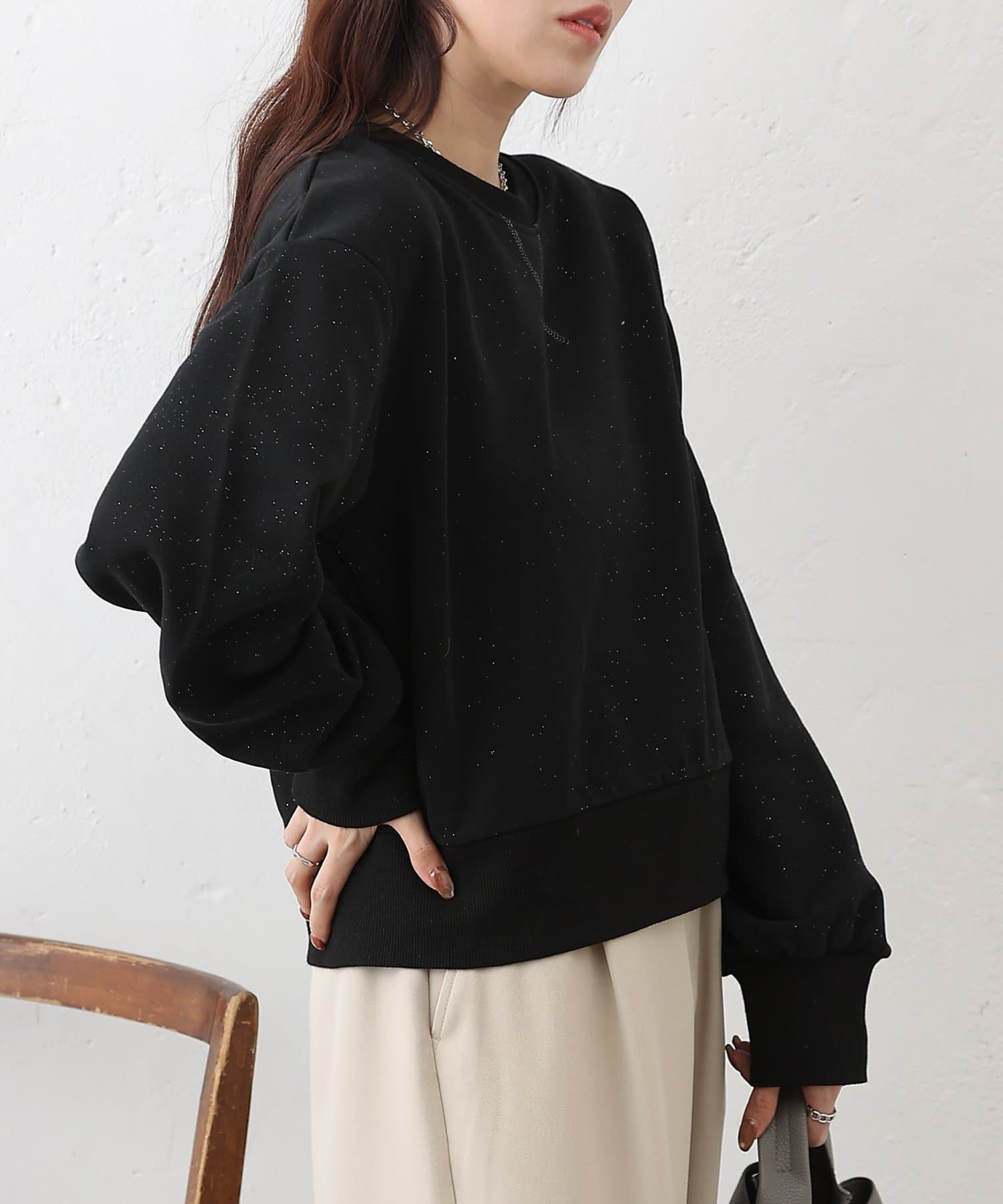 主張しすぎない上品なラメを使用しているので、カジュアルなスウェットスタイルに女性らしさと華やかさをプラスします。