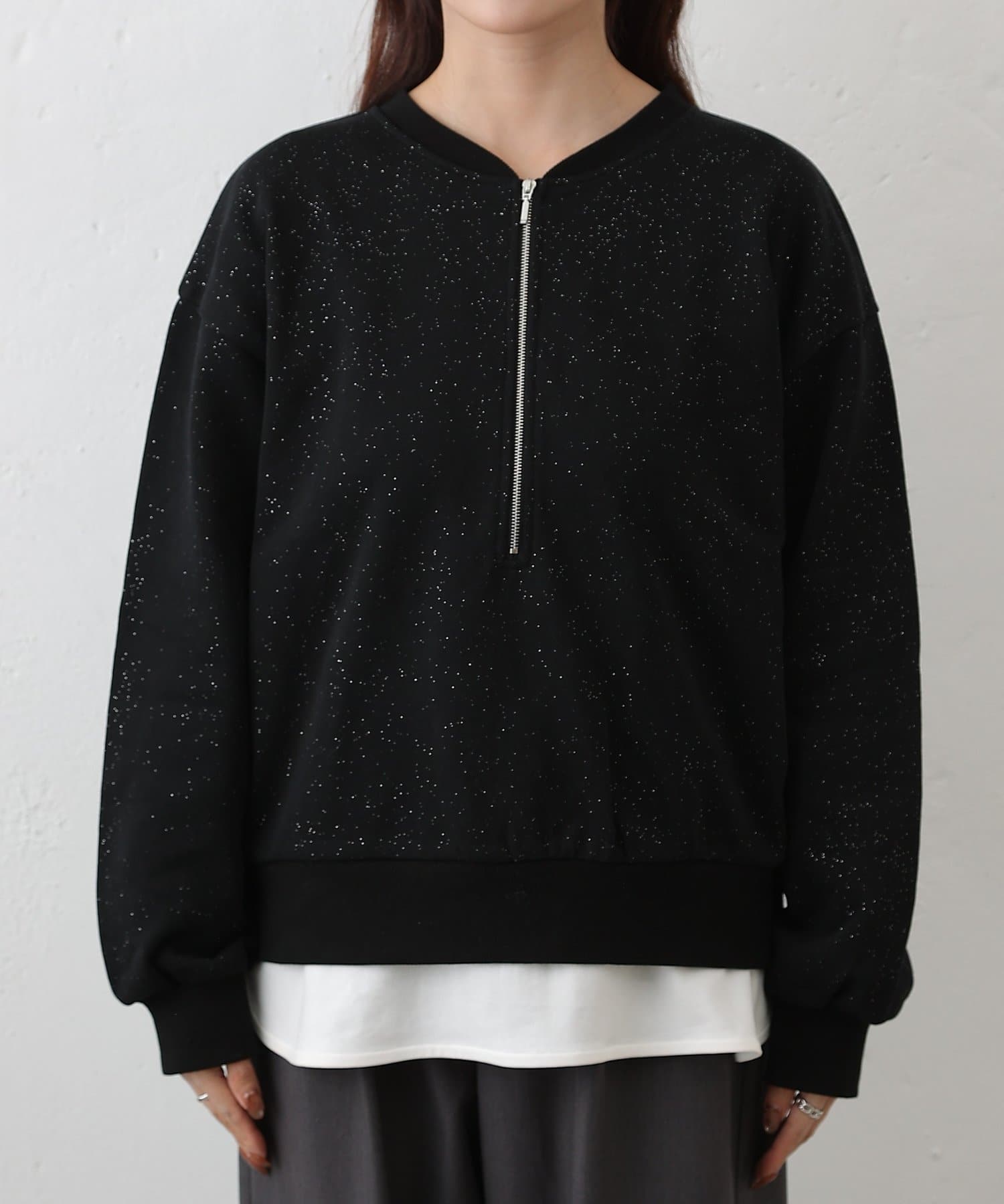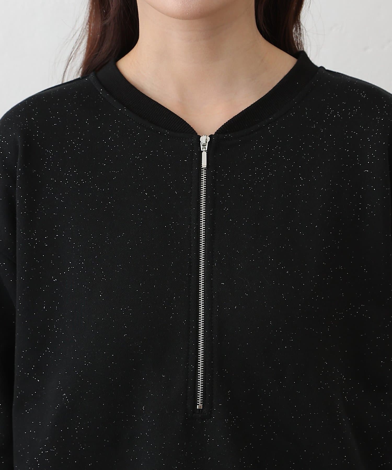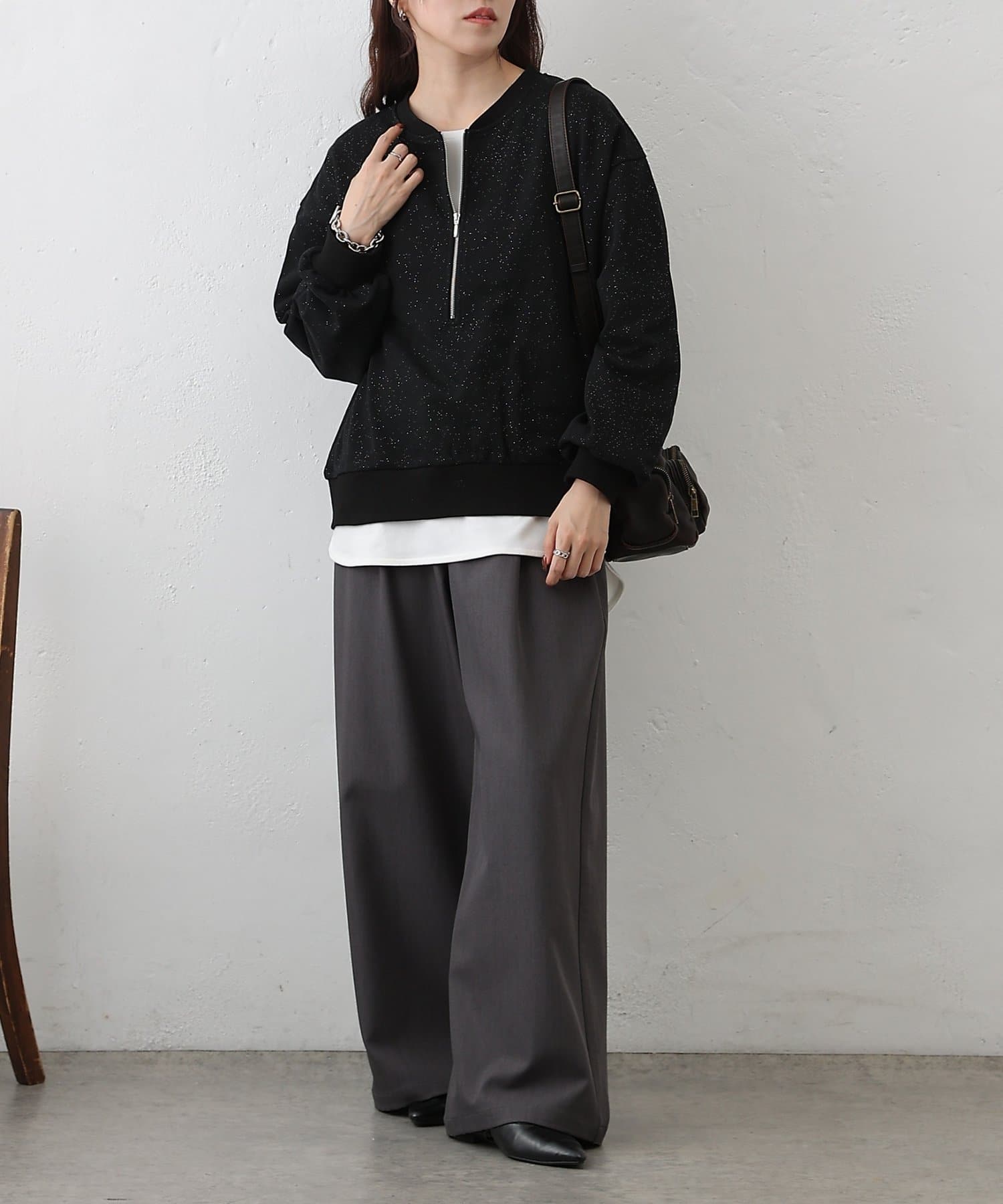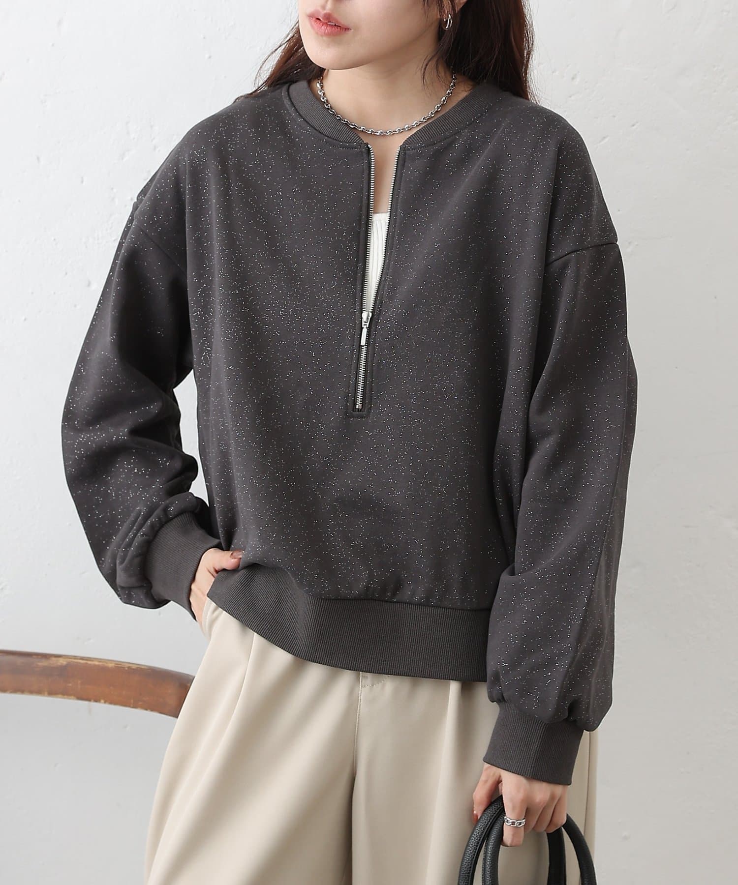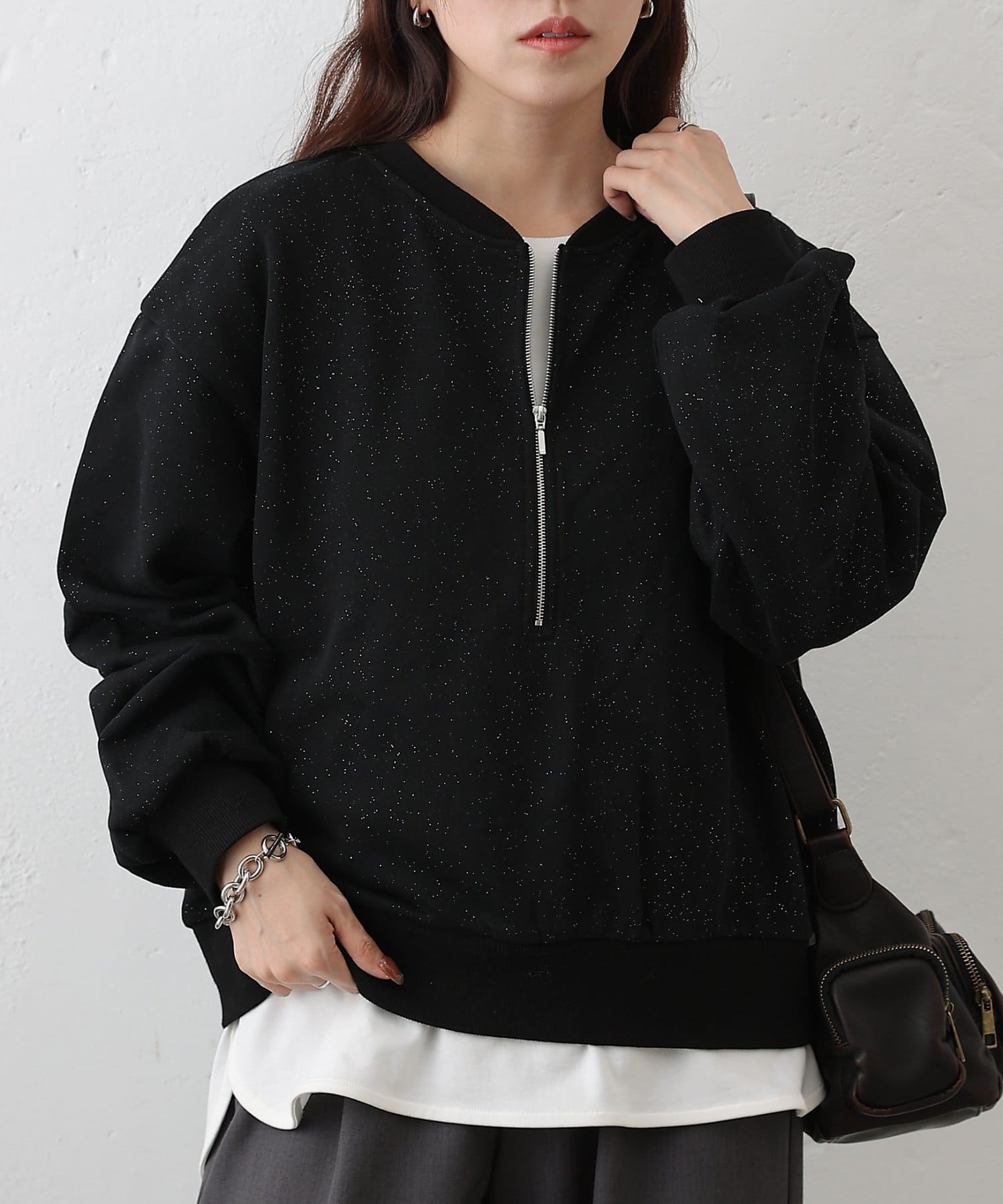 カジュアルな印象のハーフジップデザインですが、繊細なラメ感をプラスすることで大人っぽく着こなせるハーフジッププルオーバーになっています。