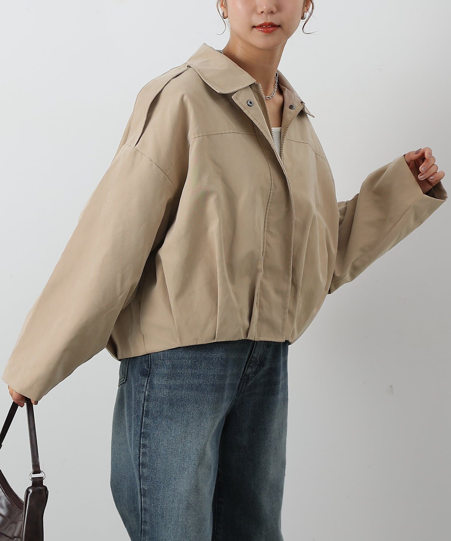 ほんのり起毛した表面が上品さを引き立て、カジュアルアウターながら女性らしく着こなせる一枚です。