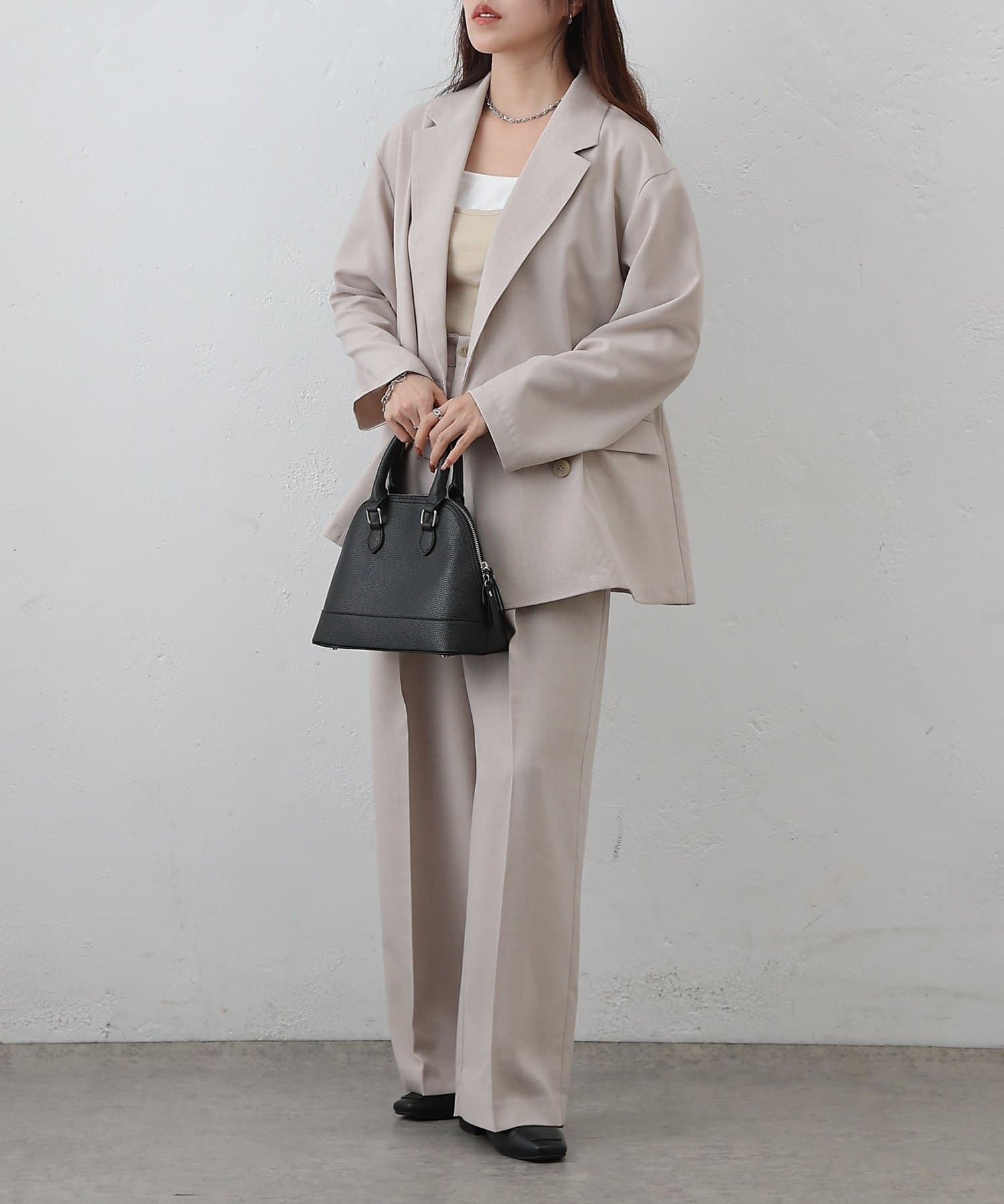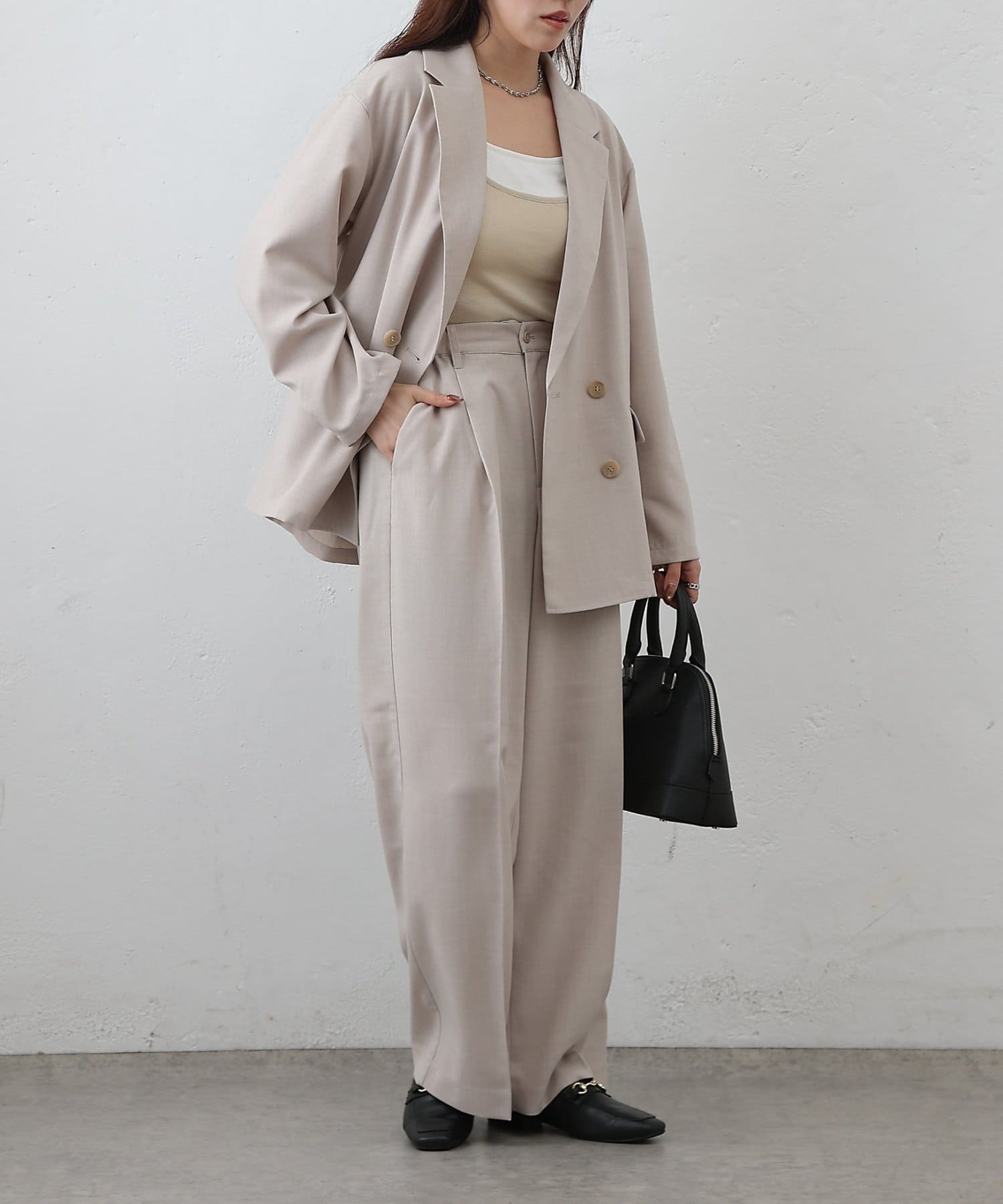 同素材のアイテムとセットアップで合わせるスタイルもかわいいです。