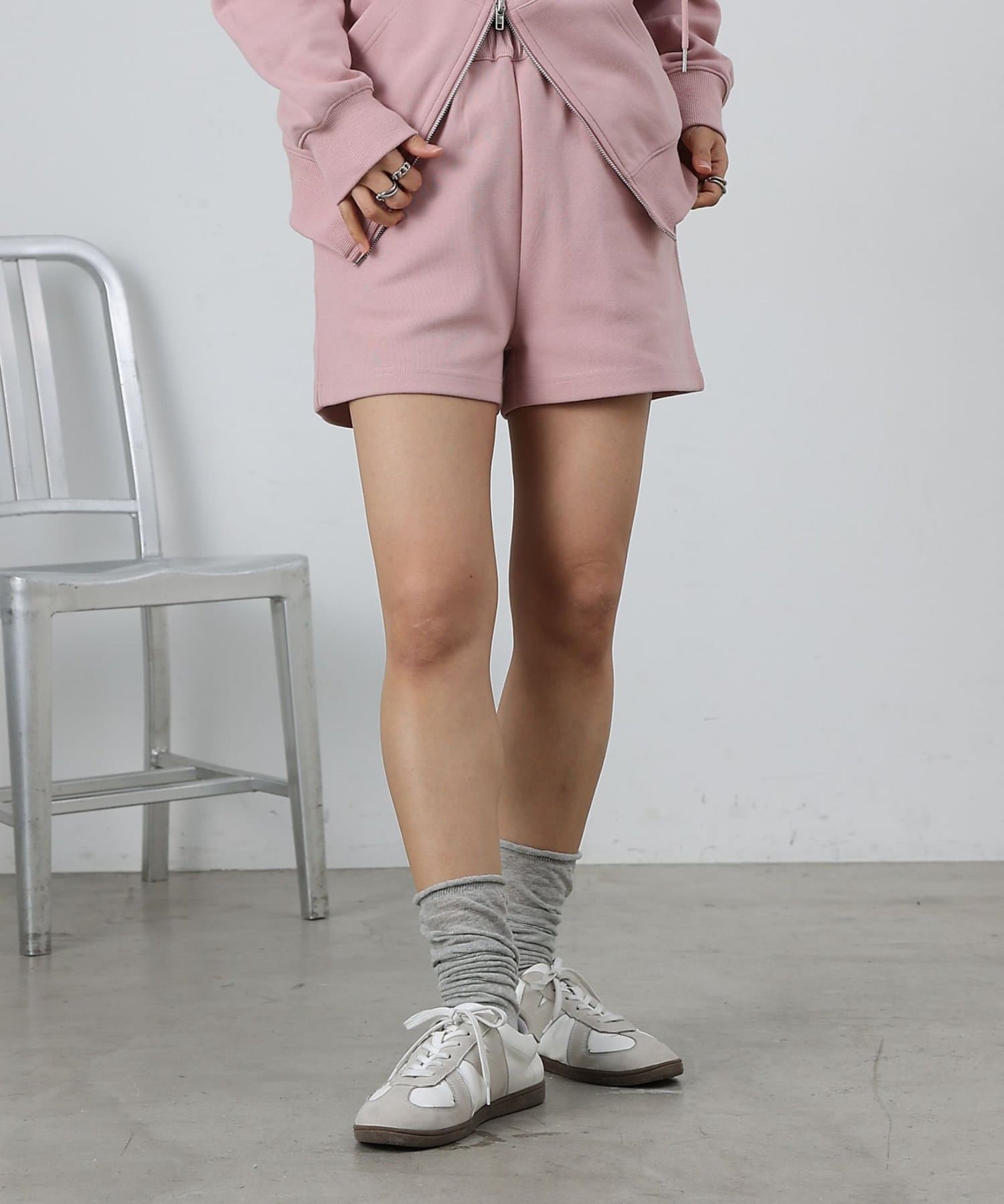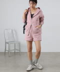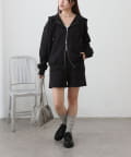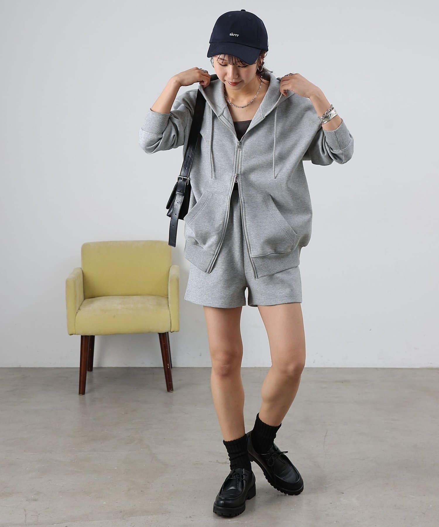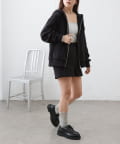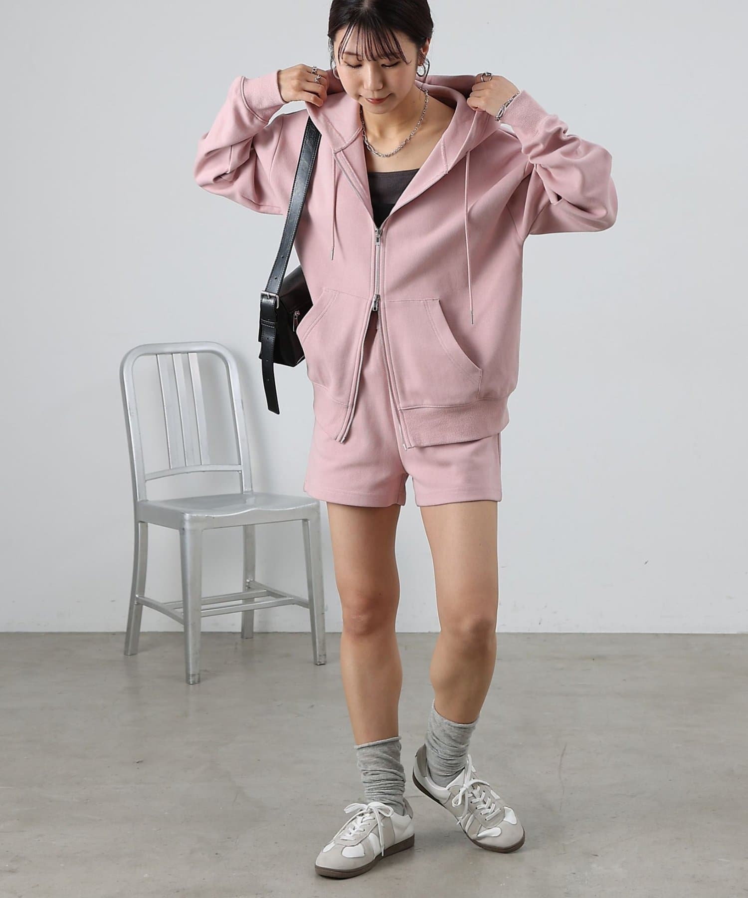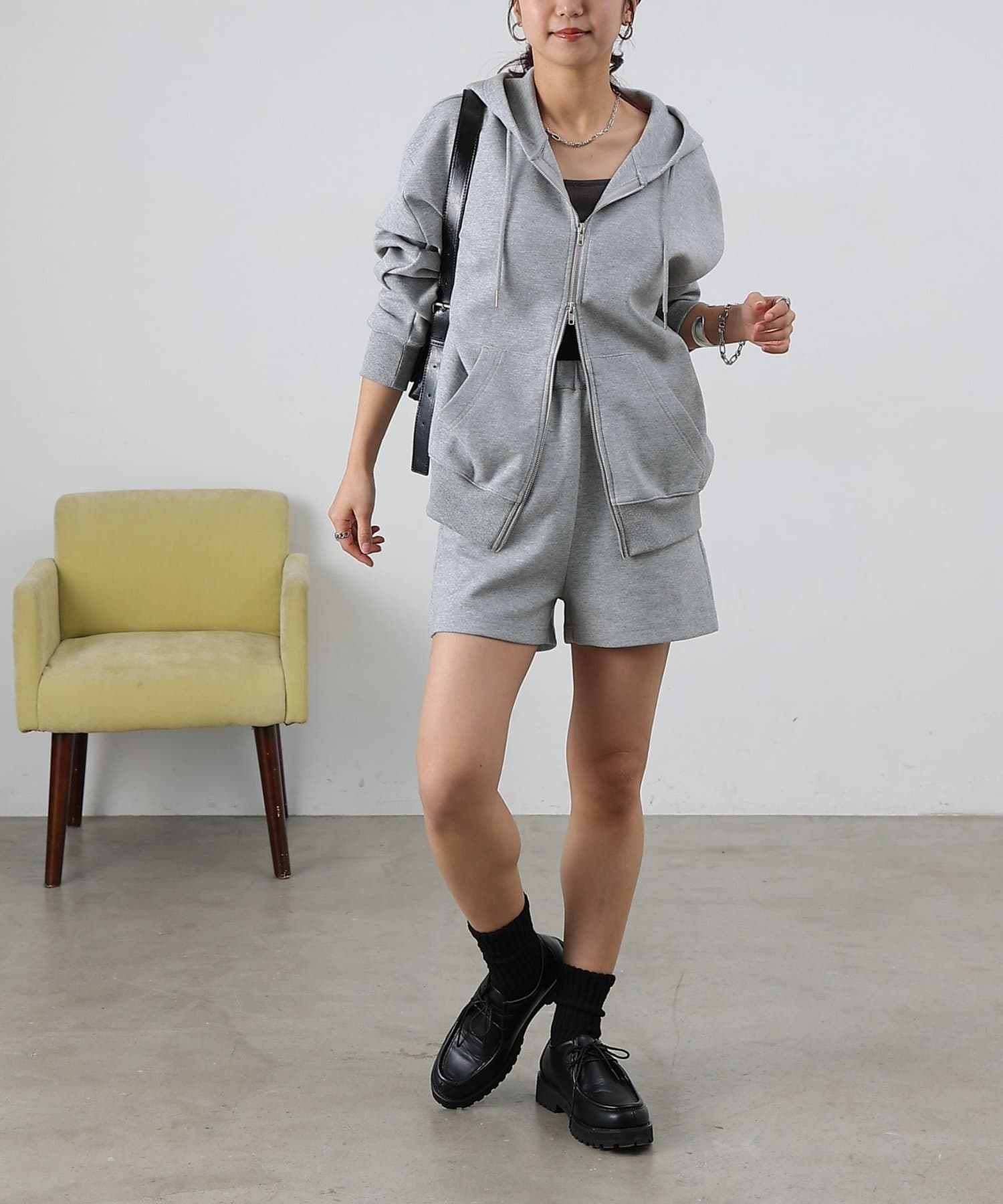 同素材のトップスとセットアップで合わせるスタイルもオススメです。