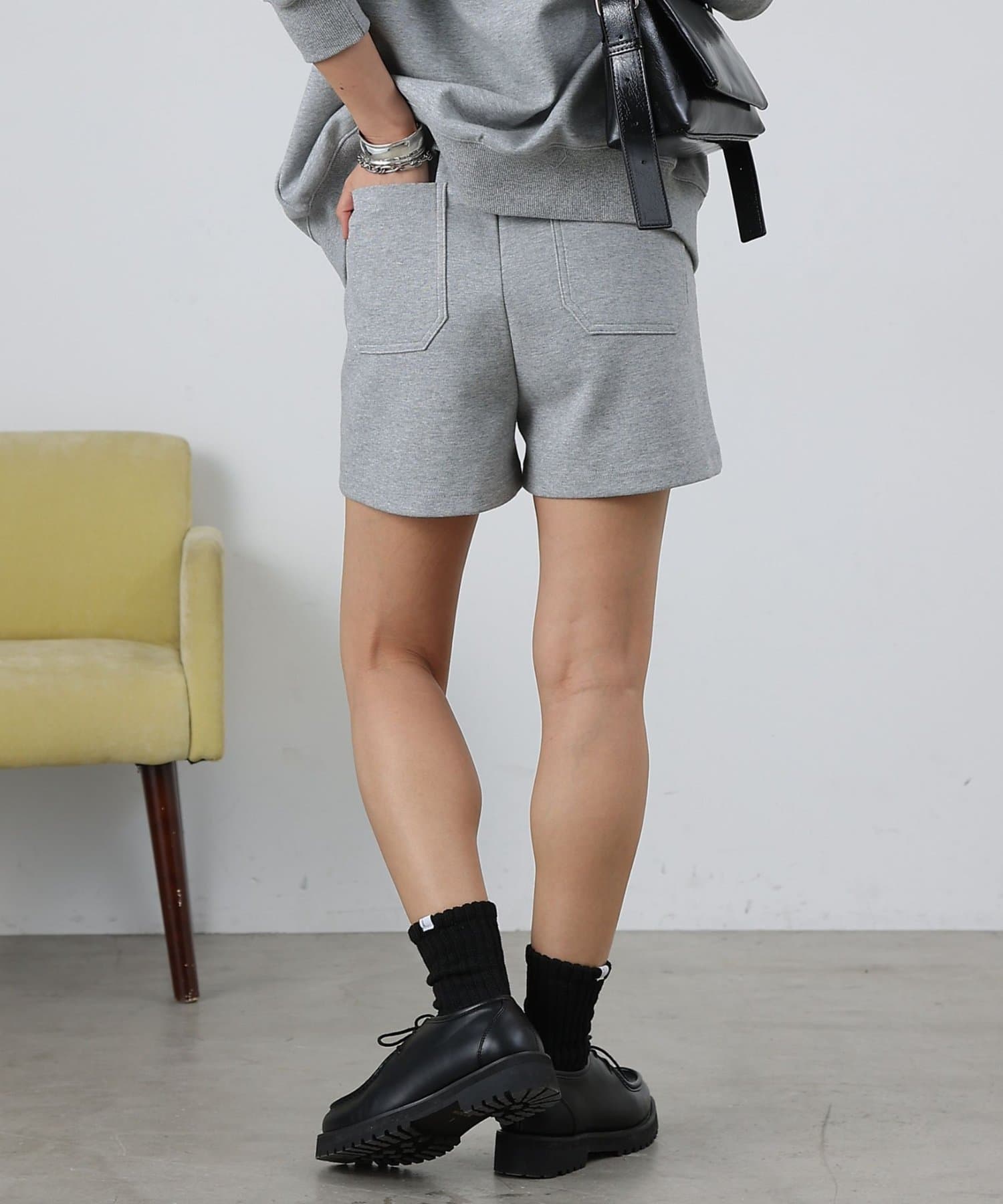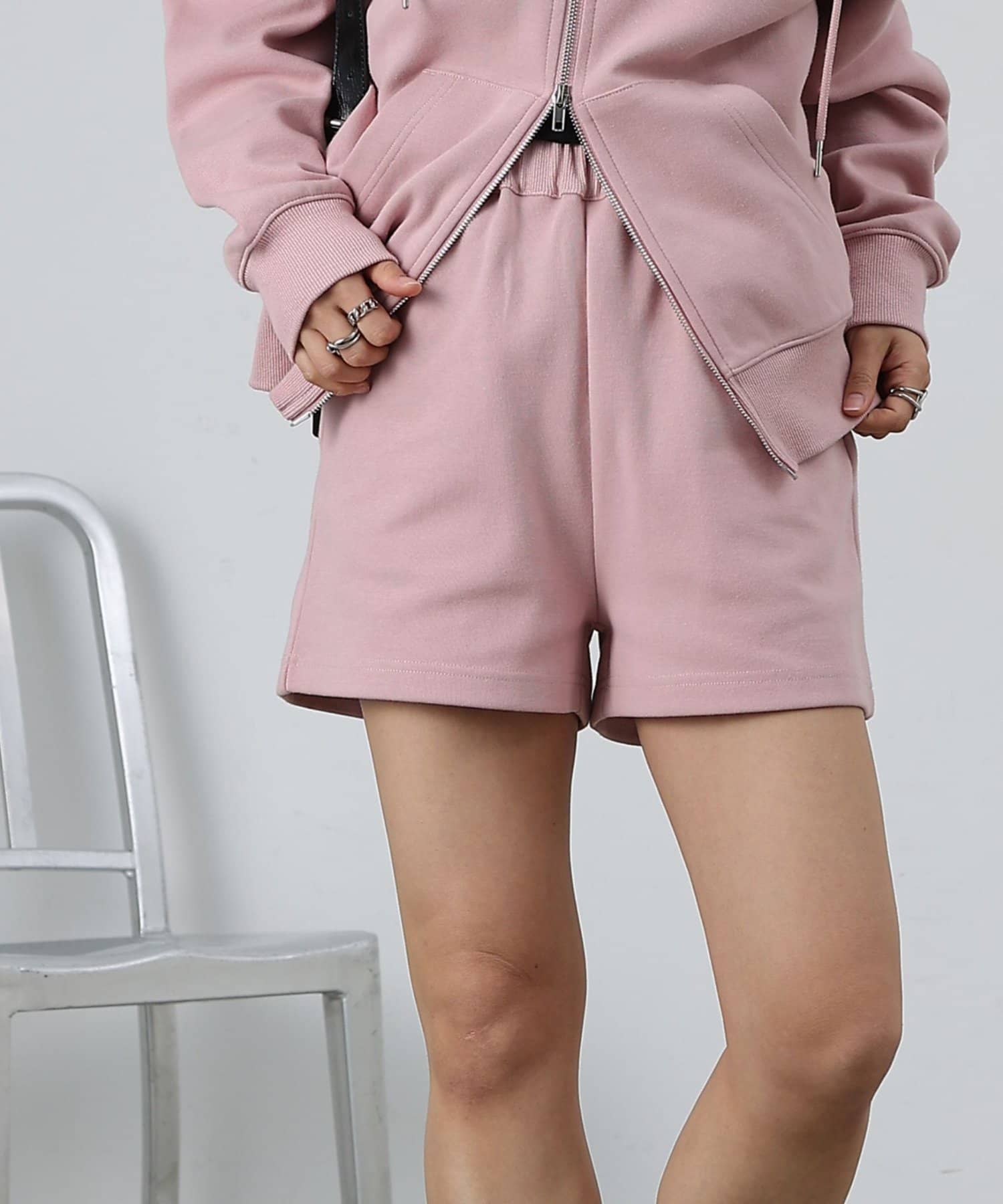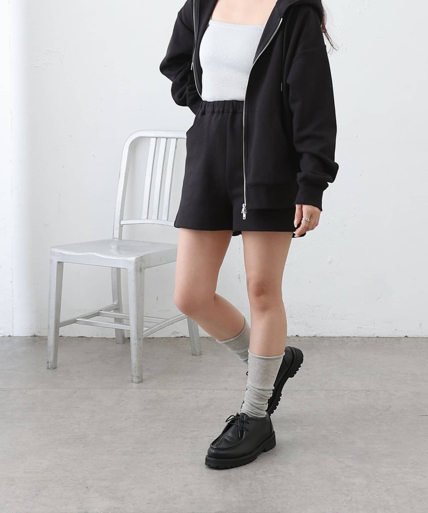同素材のトップスとセットアップで合わせるスタイルもオススメです。
