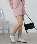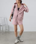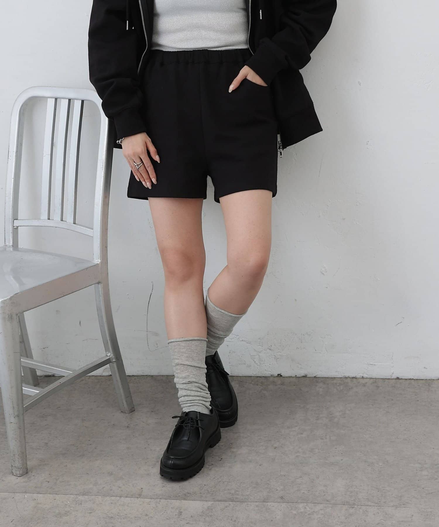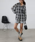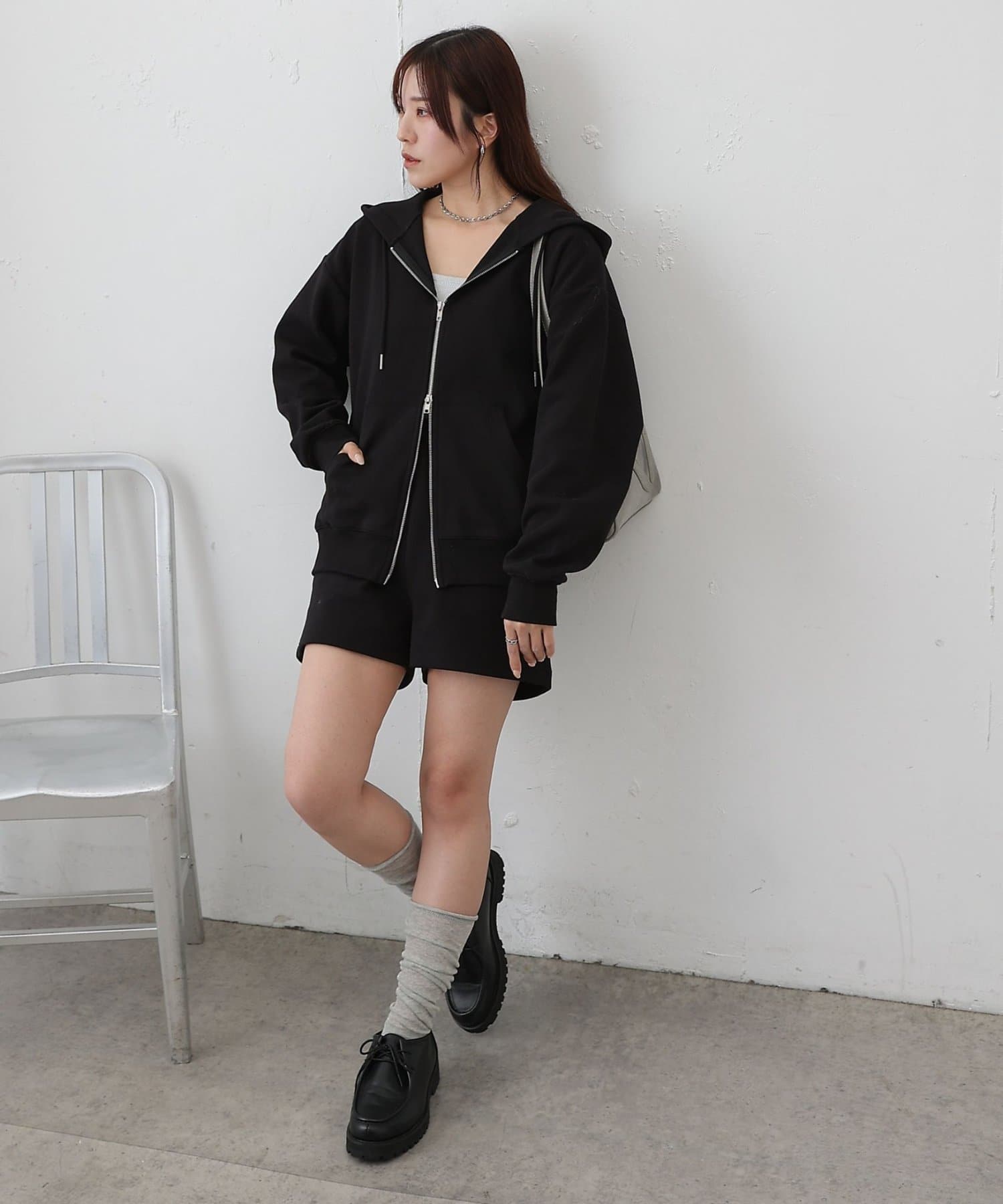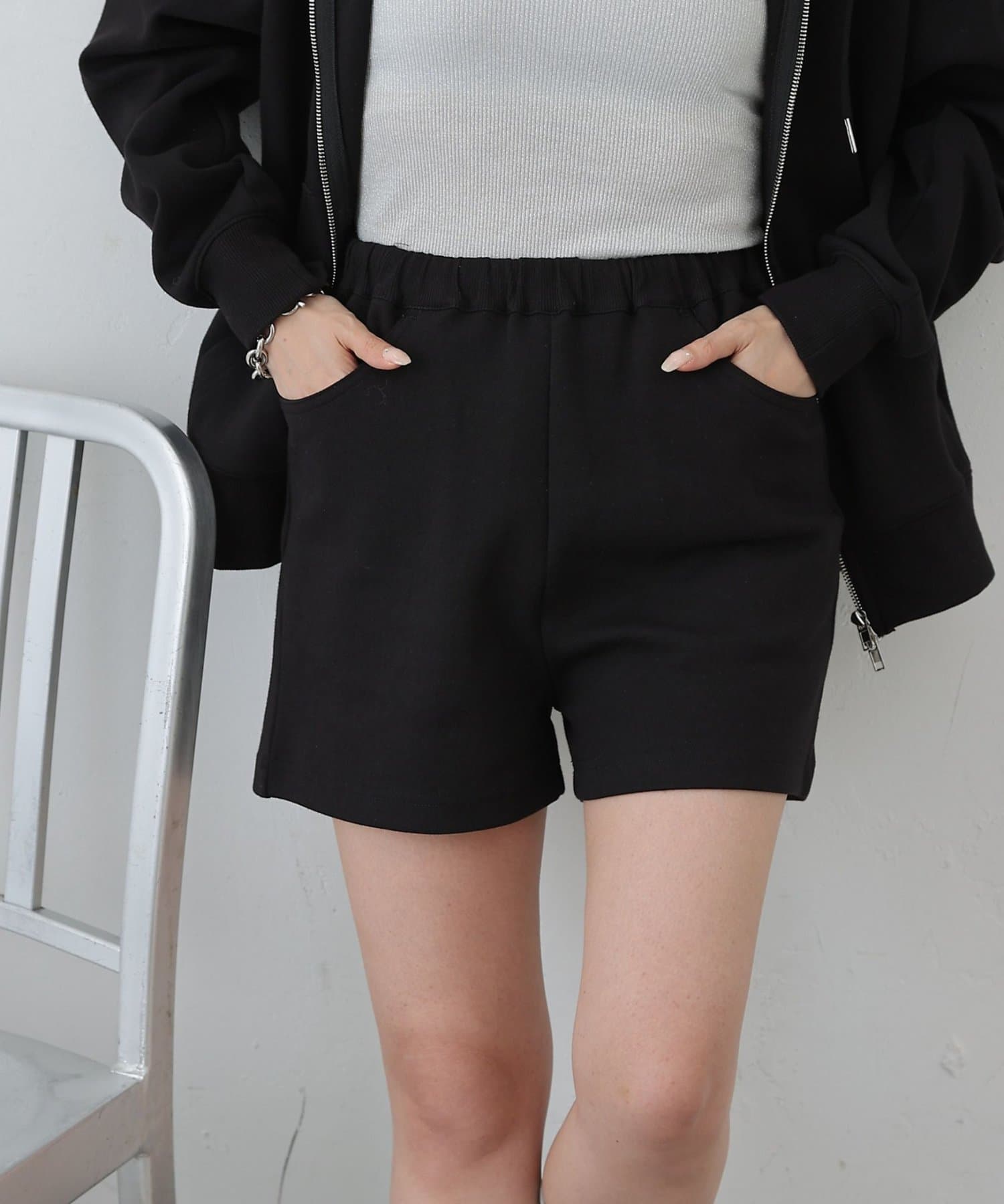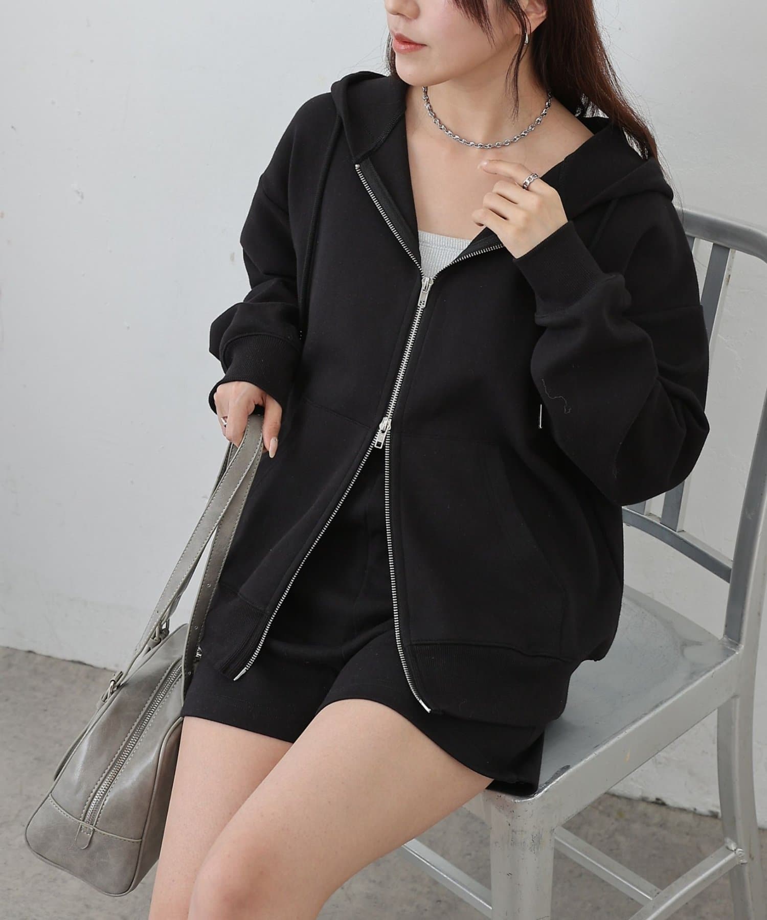 同素材のトップスとセットアップで合わせるスタイルもオススメです。
