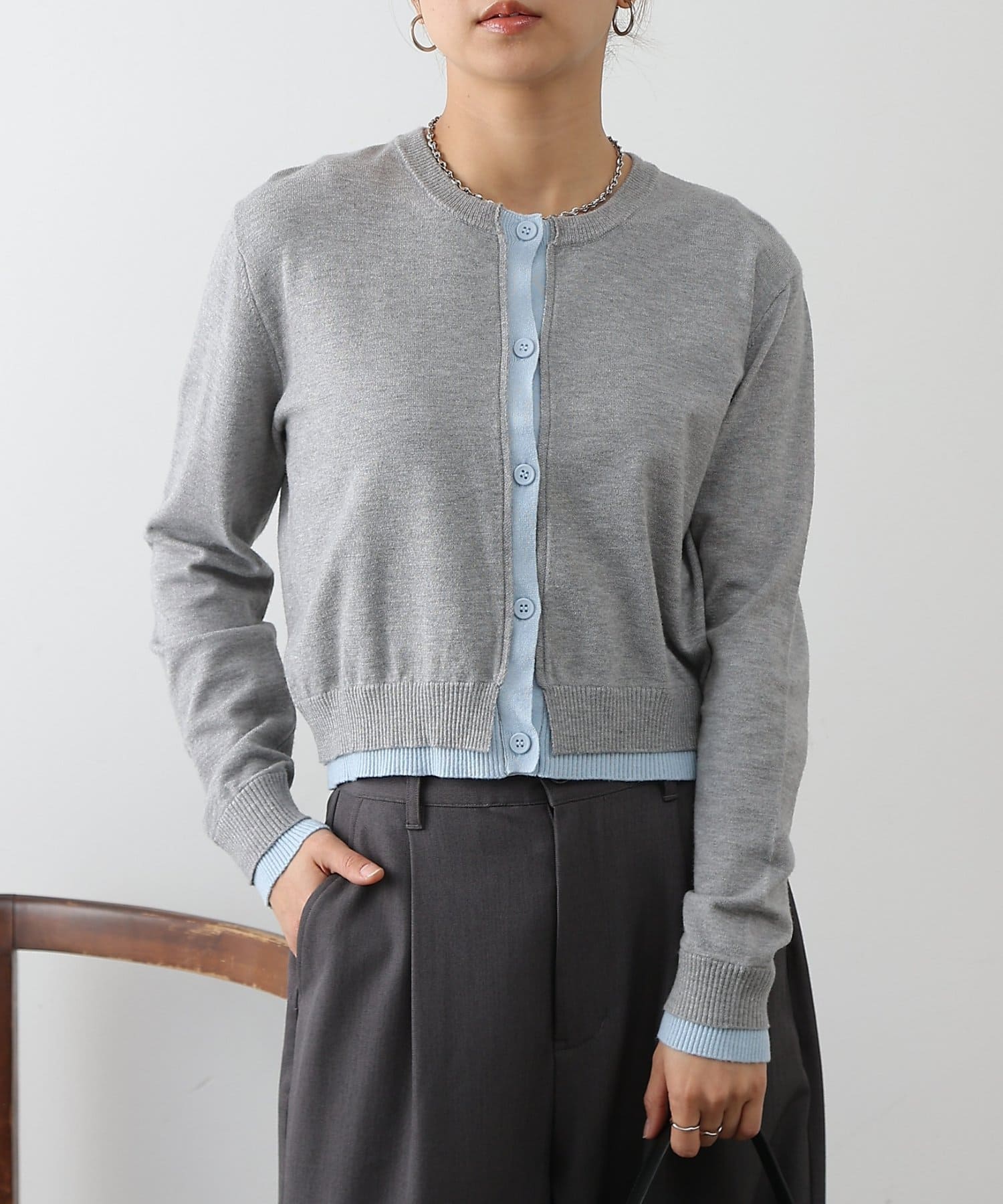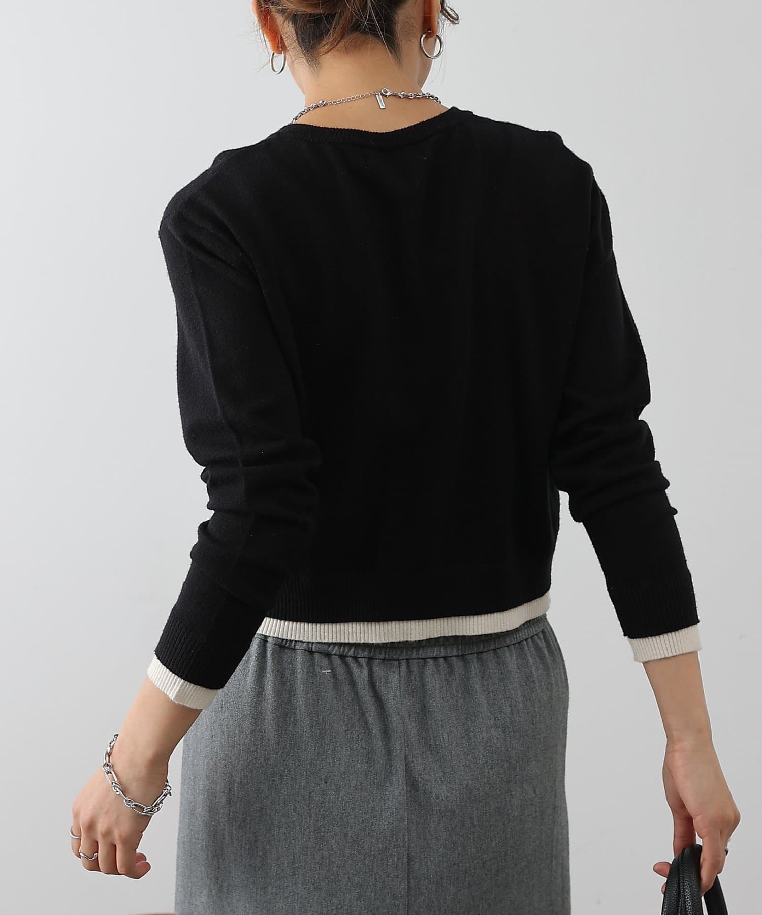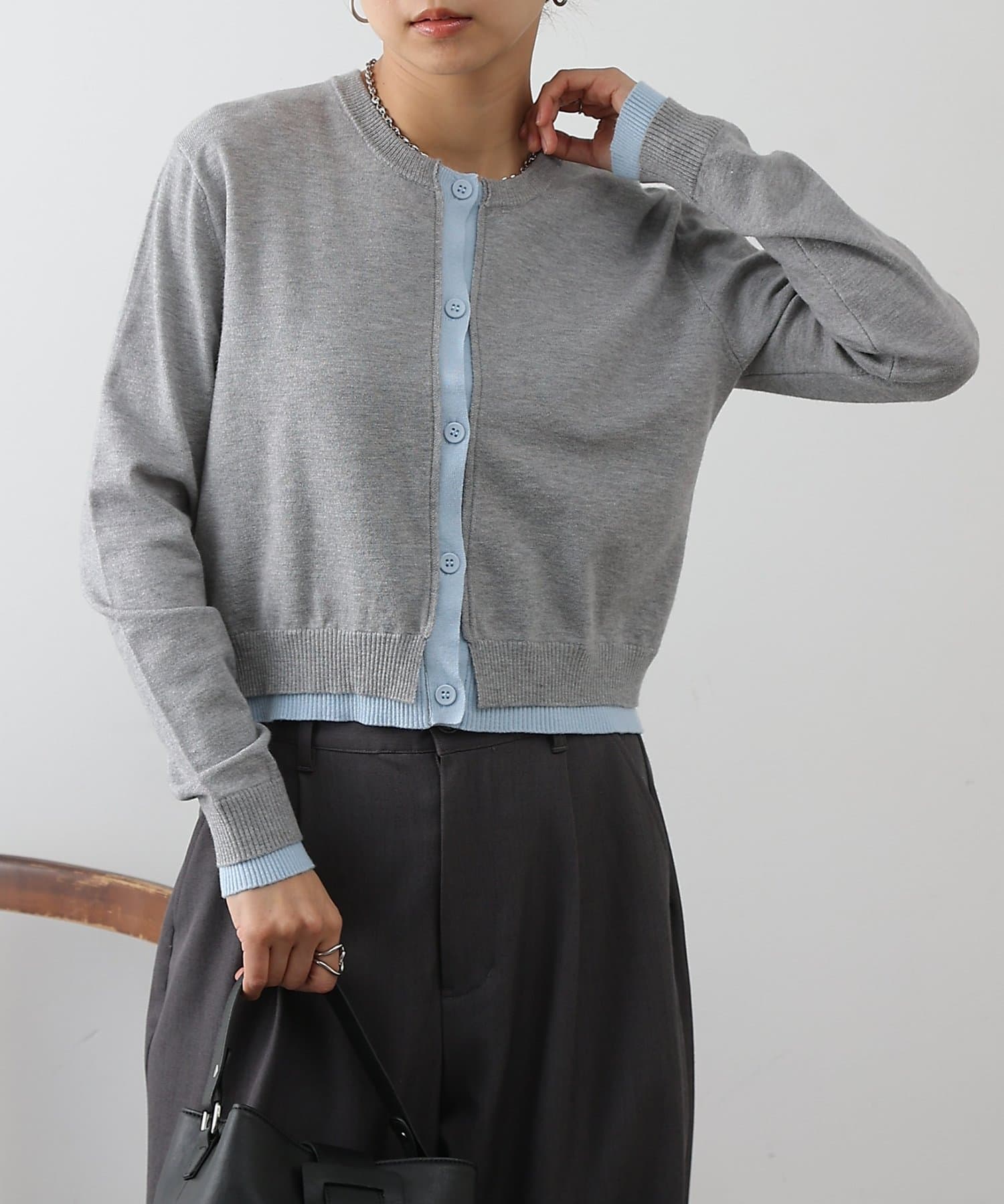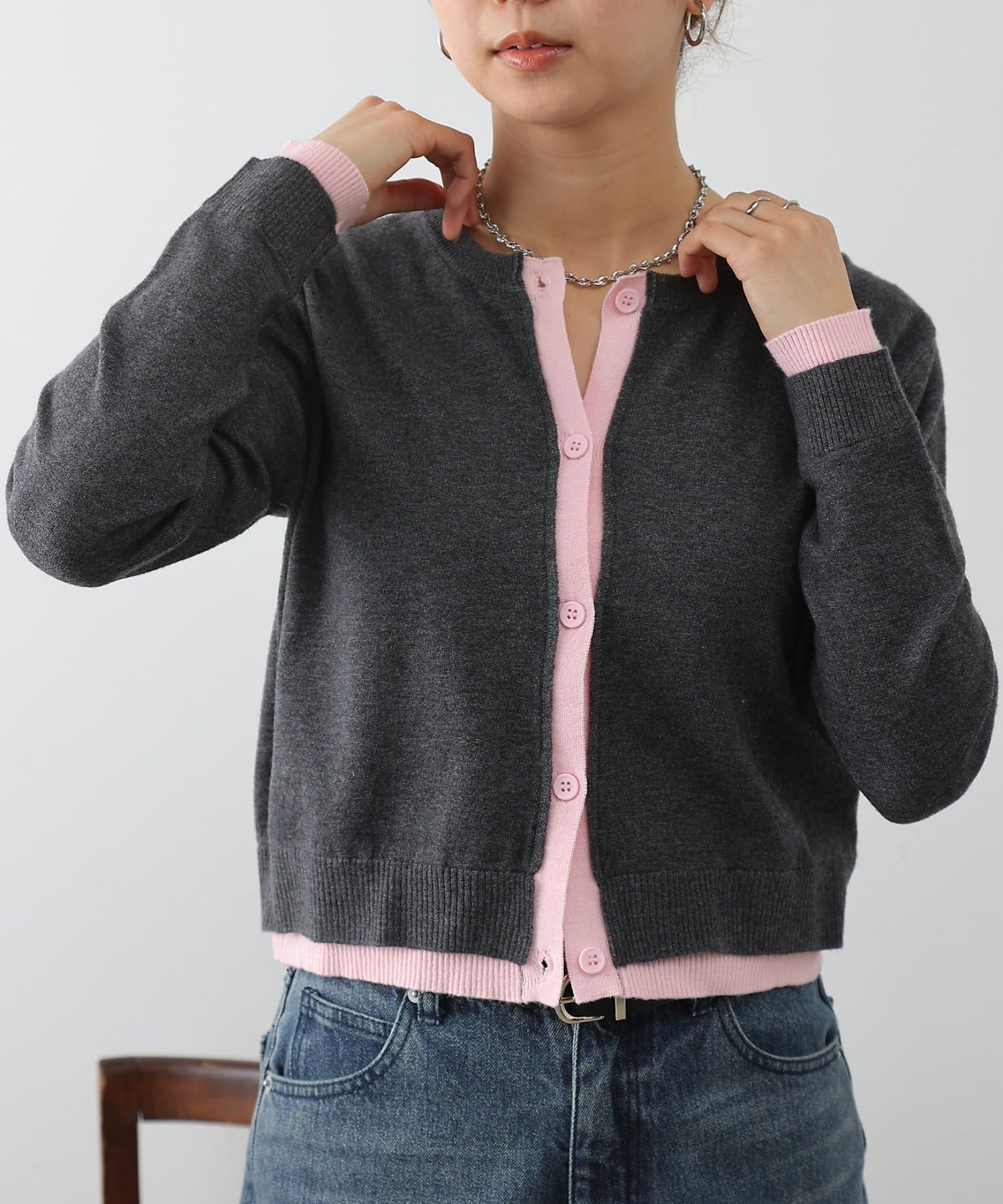 トレンド感のある配色デザインで、簡単にレイヤード風の着こなしが叶うカーディガン。