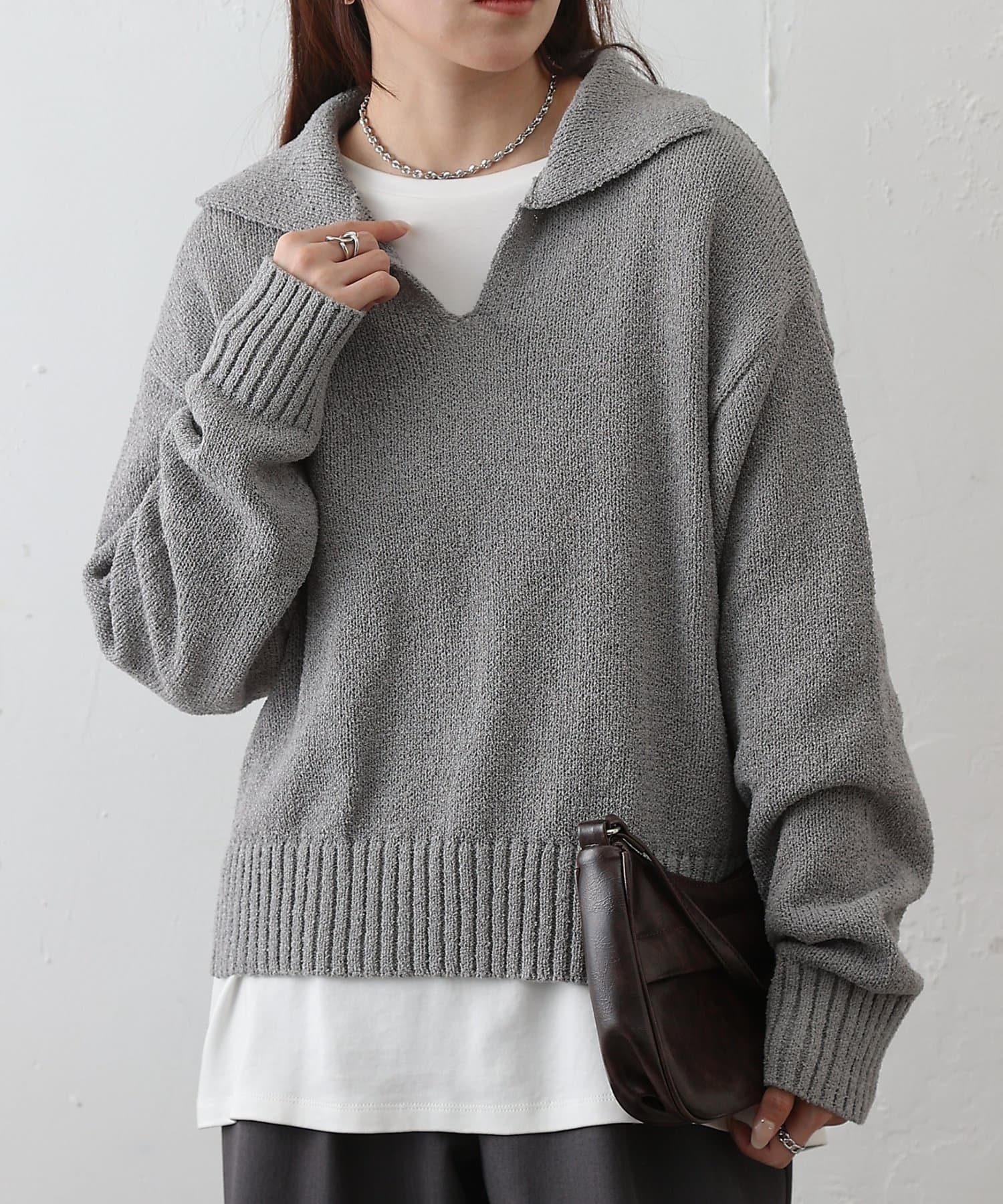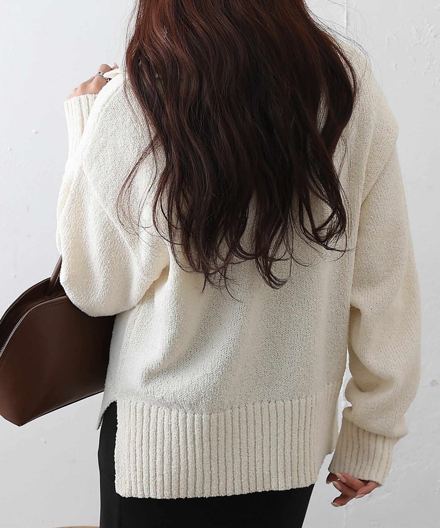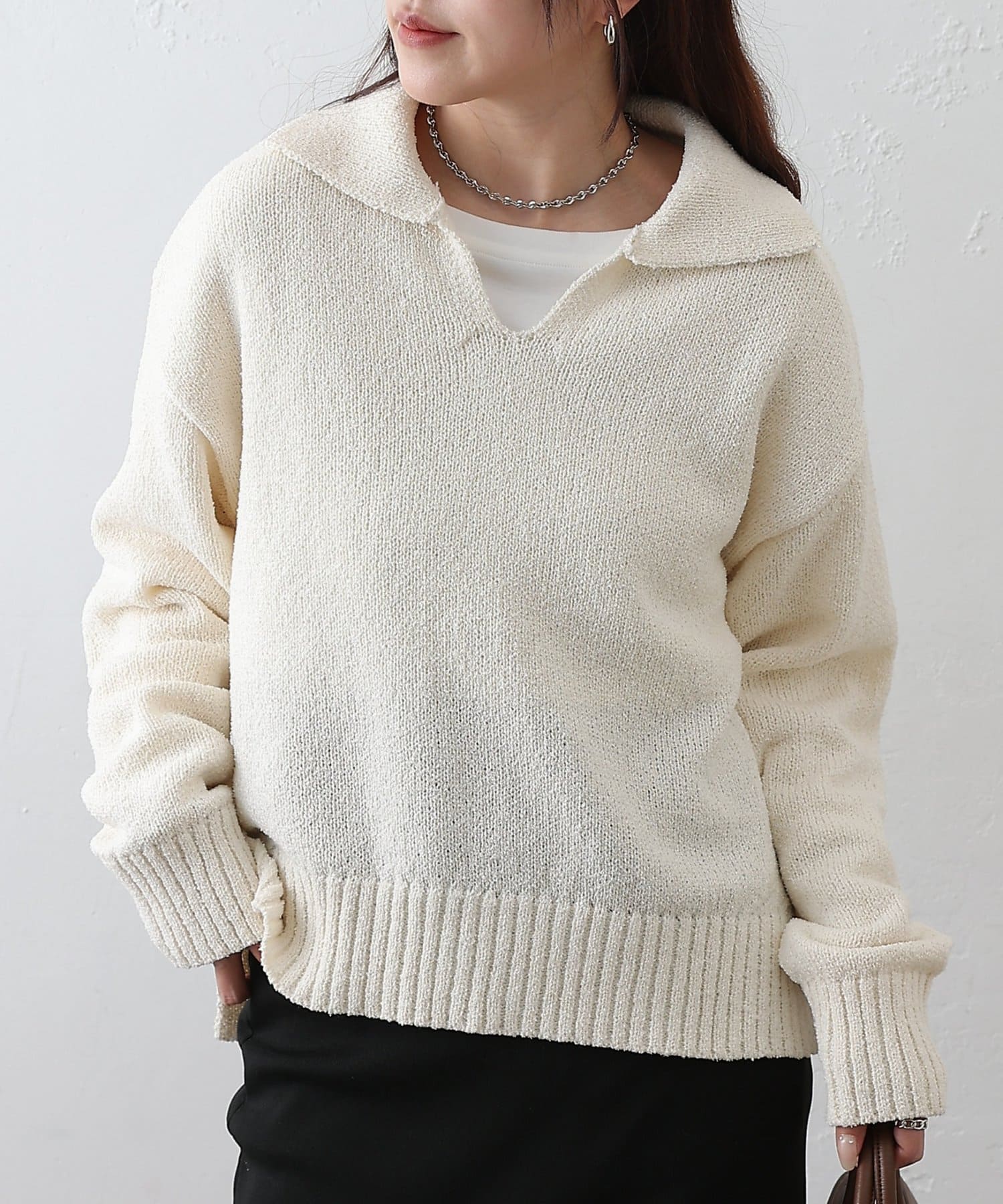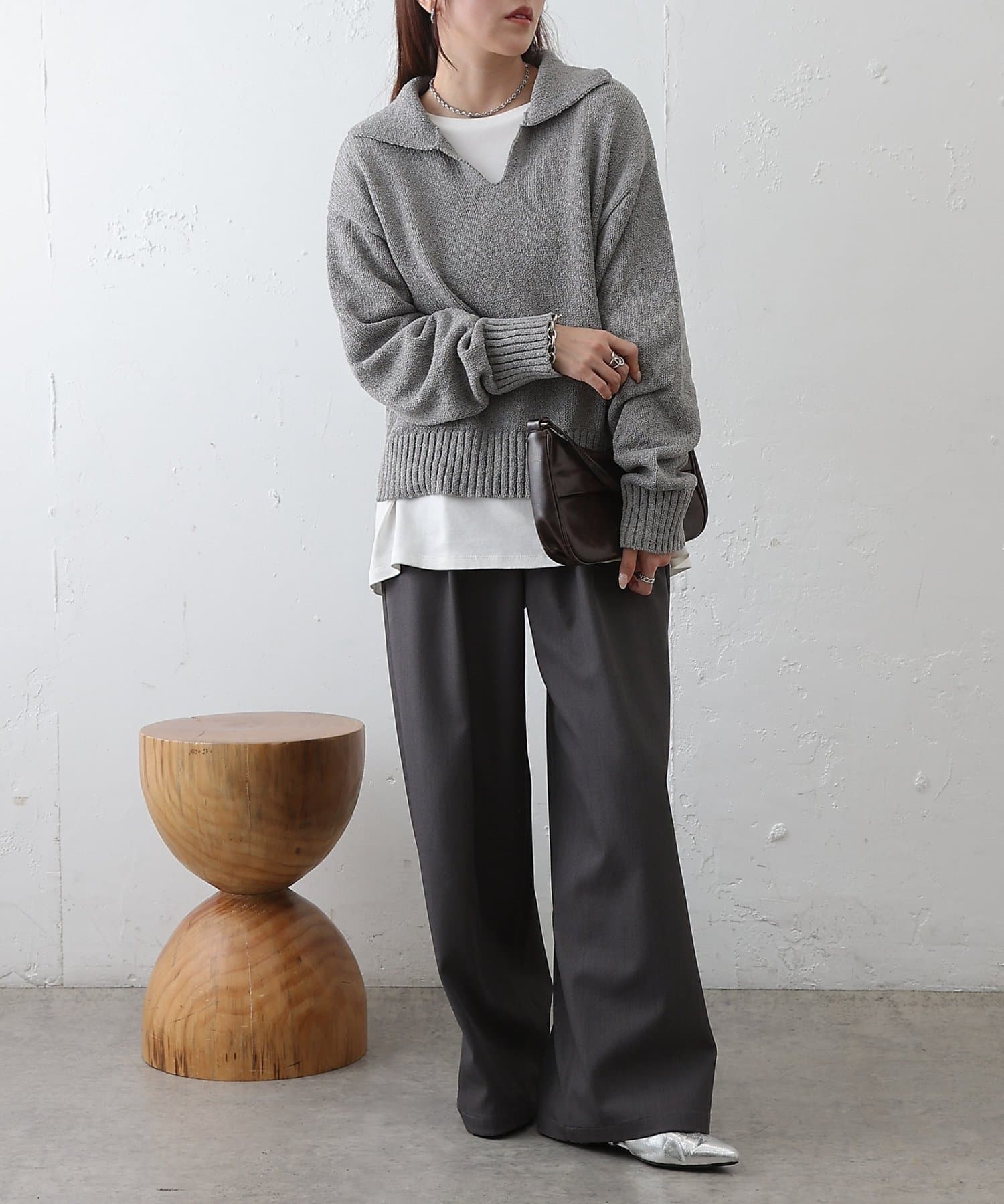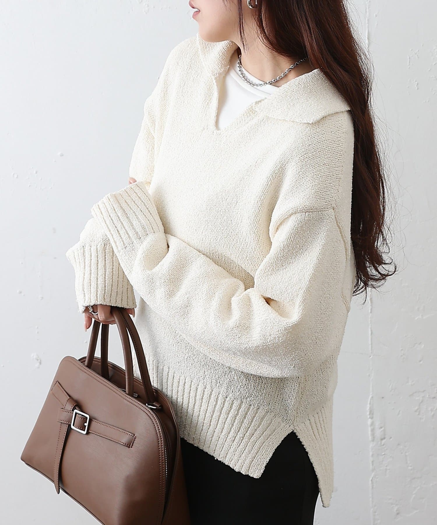 ミニブークレ素材を使用したスキッパーデザインのニットプルオーバーです。