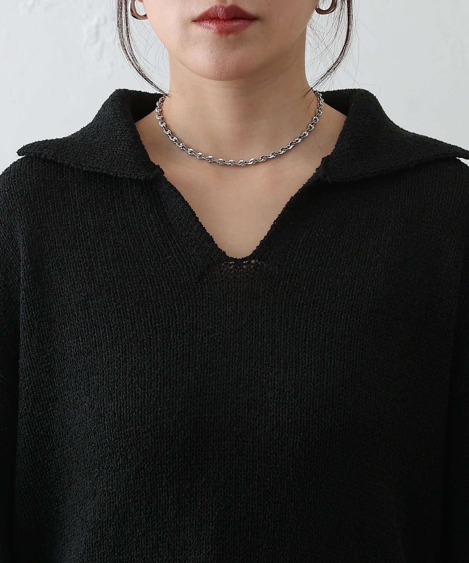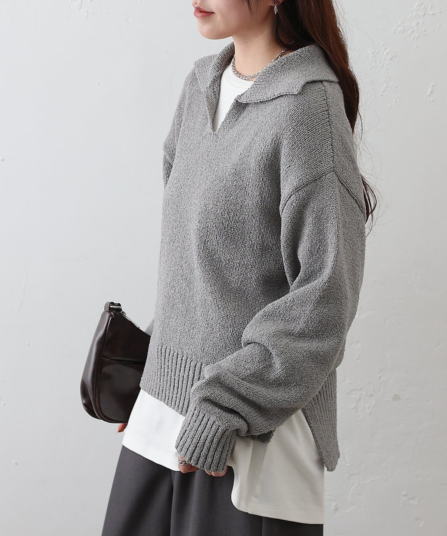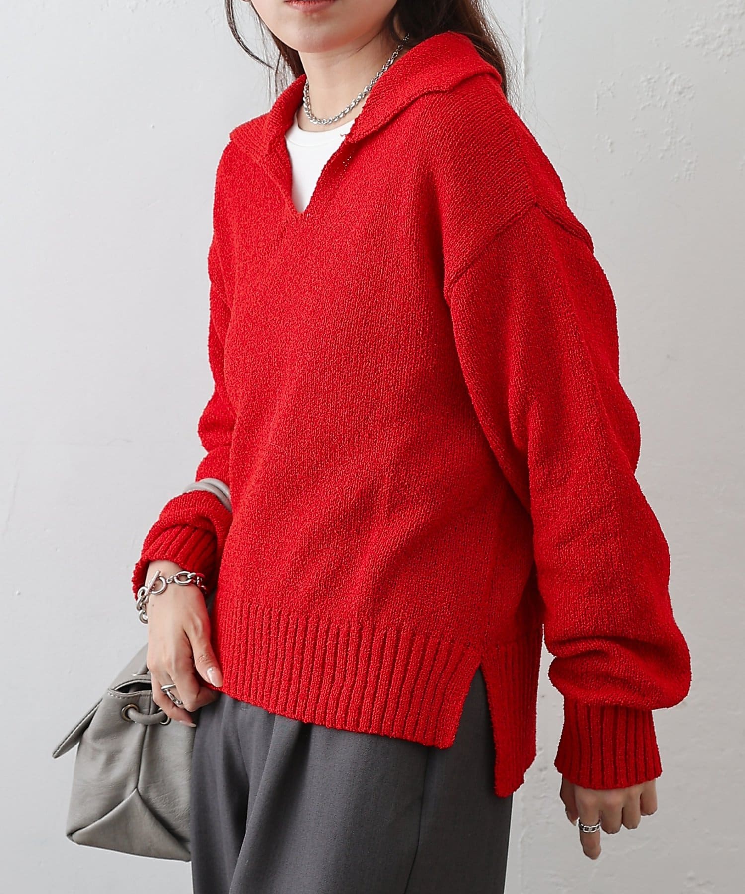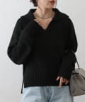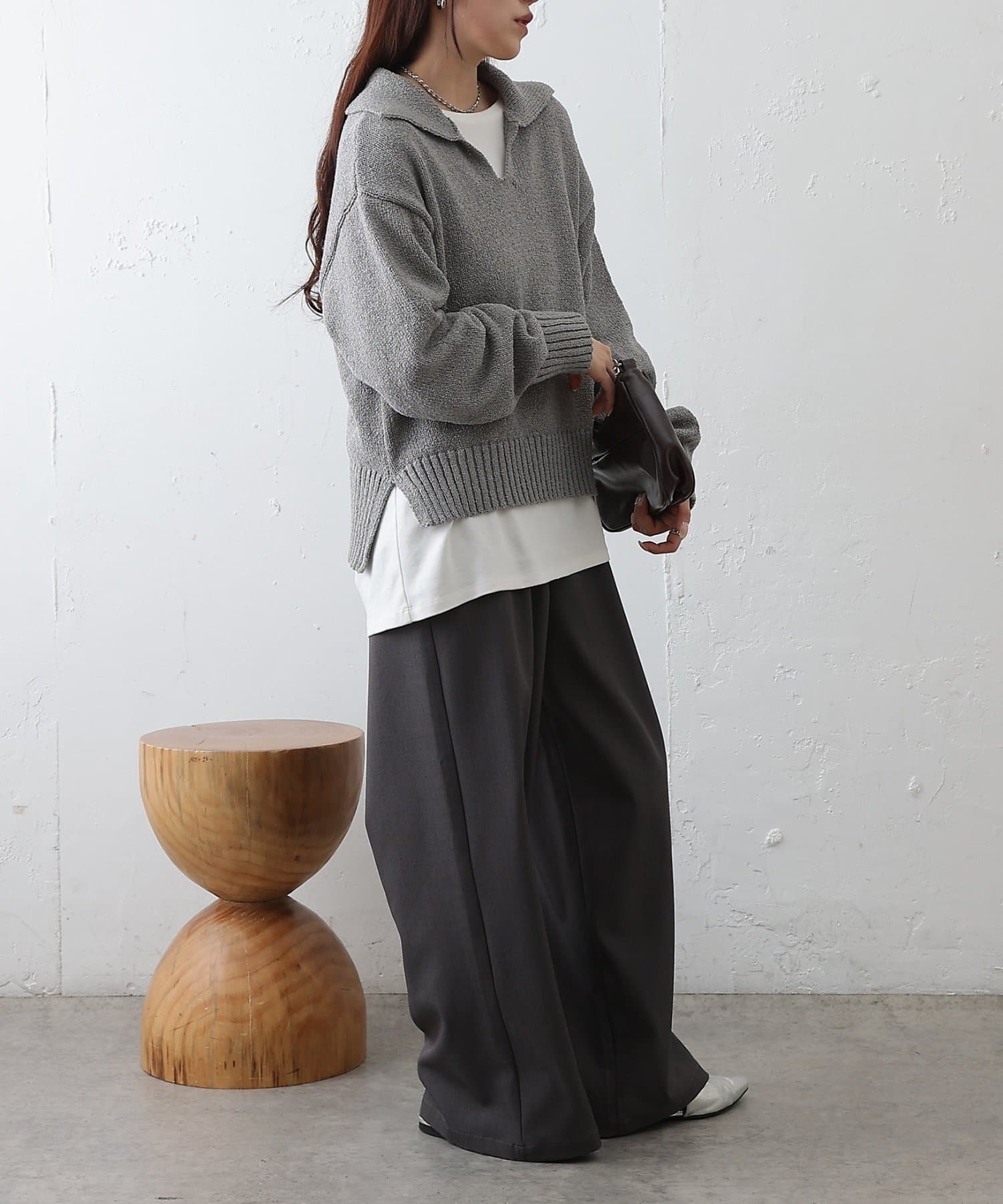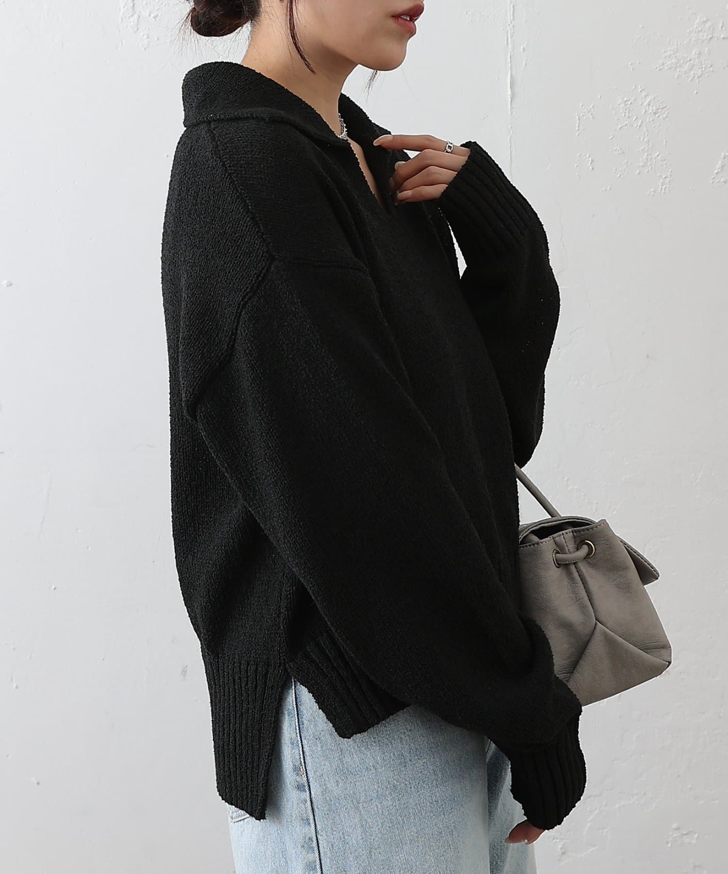 ミニブークレ素材を使用したスキッパーデザインのニットプルオーバーです。