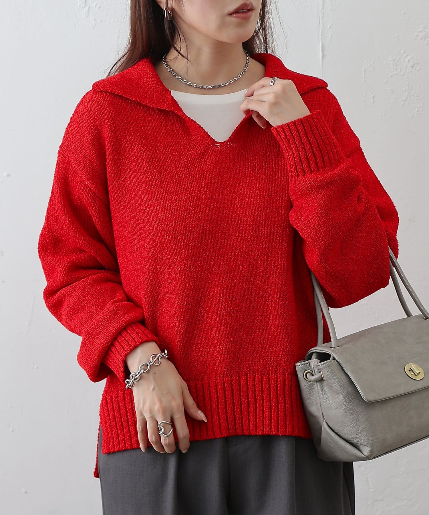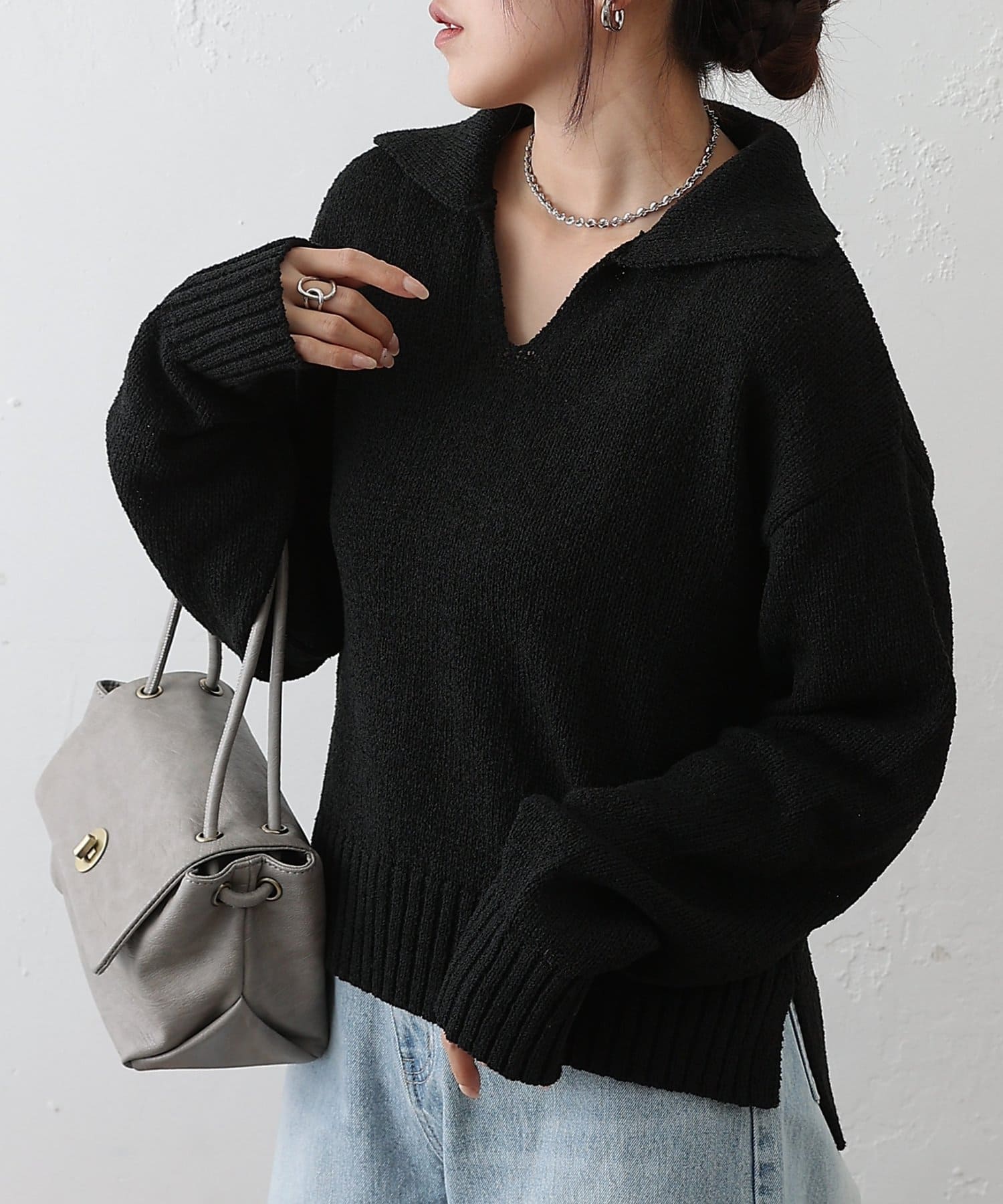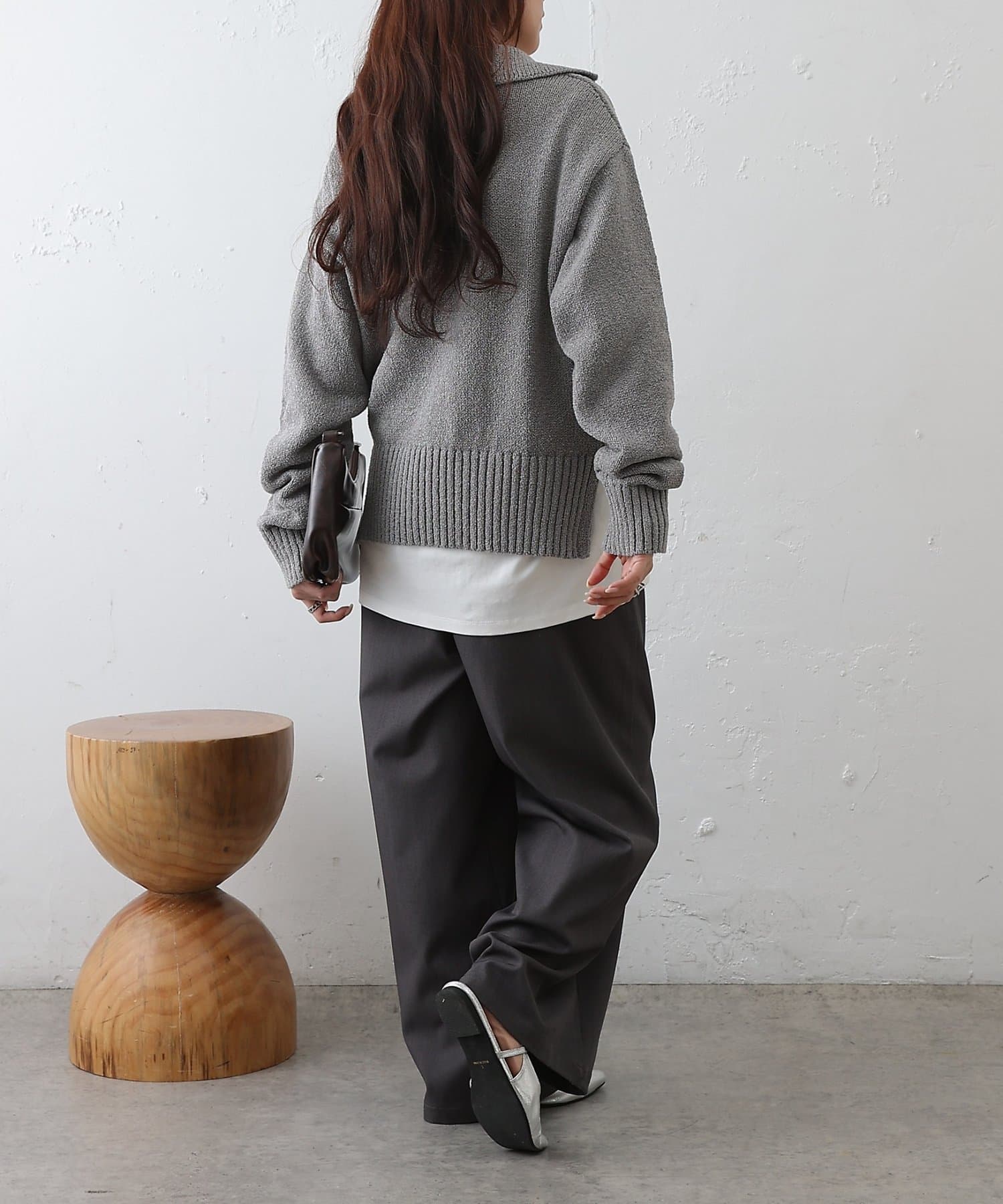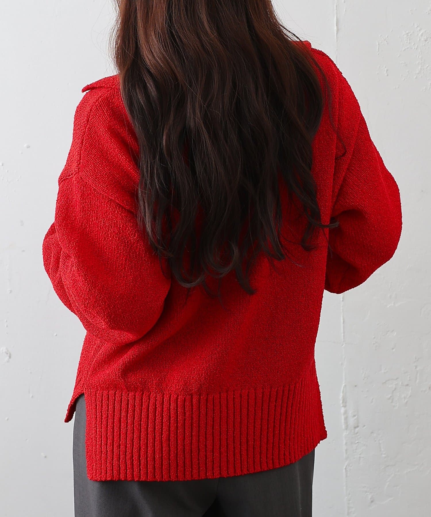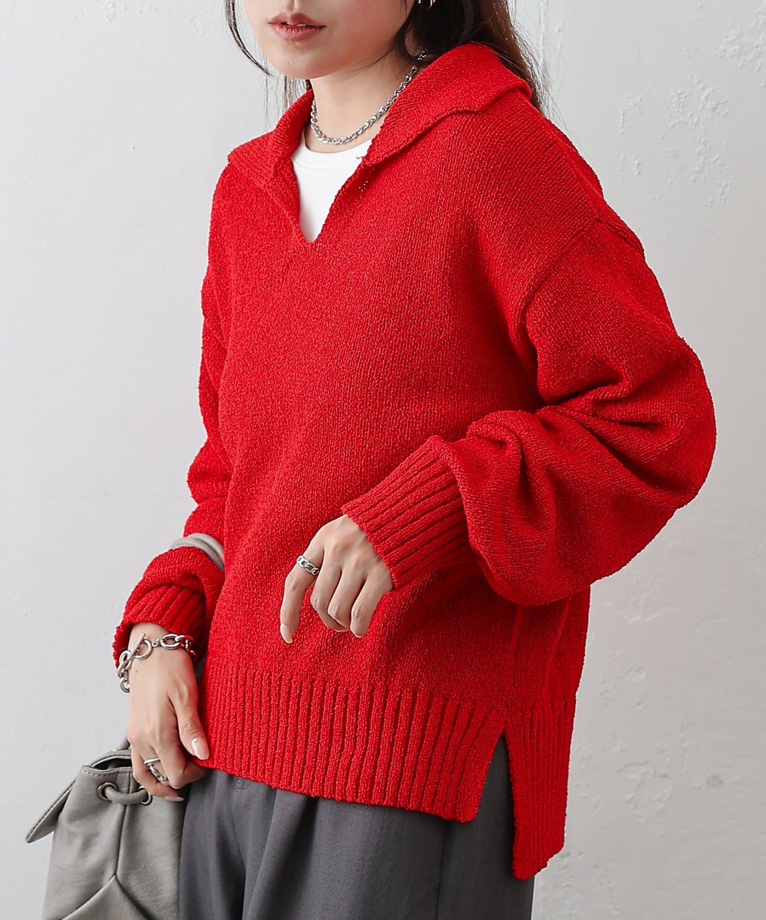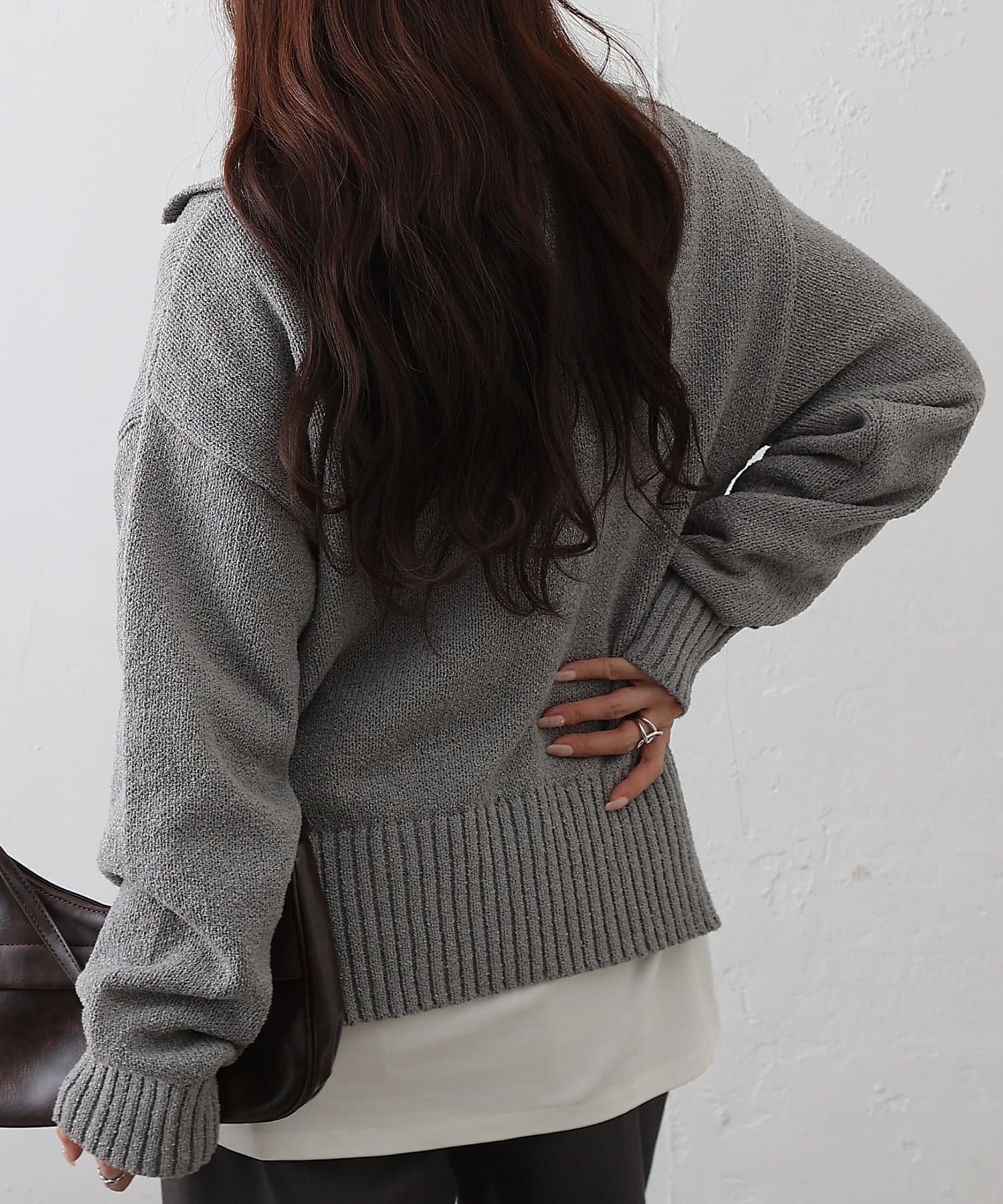 ミニブークレ素材を使用したスキッパーデザインのニットプルオーバーです。