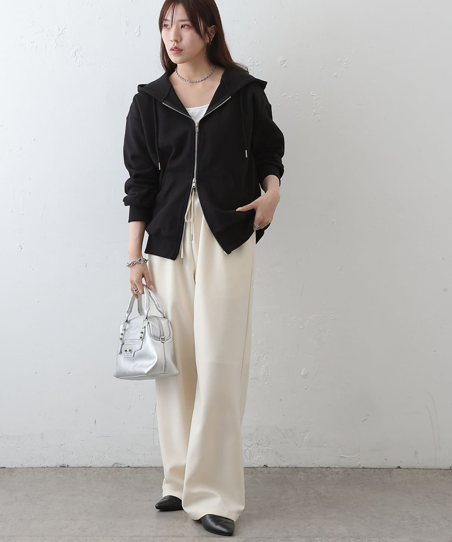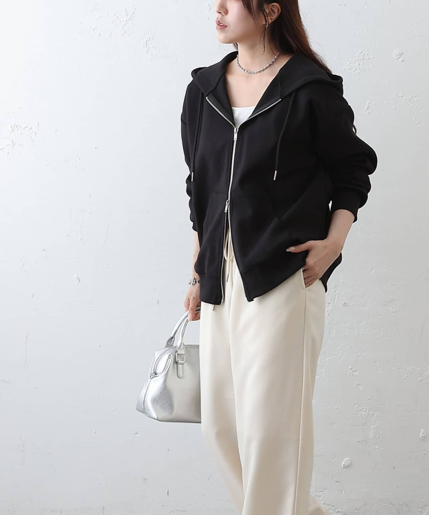 ジップを閉じるときは上下少しずつ開けてあげると寄り今年らしい抜け感のあるコーデになります◎