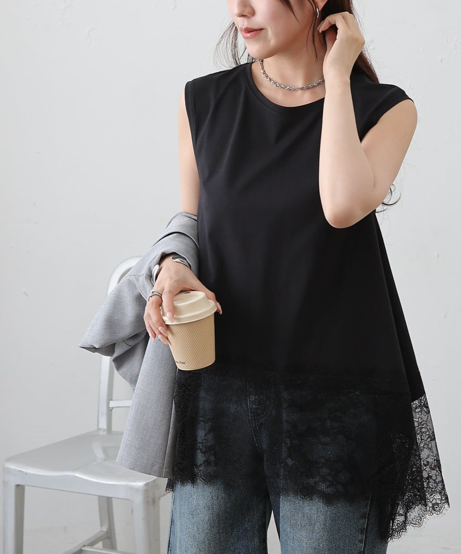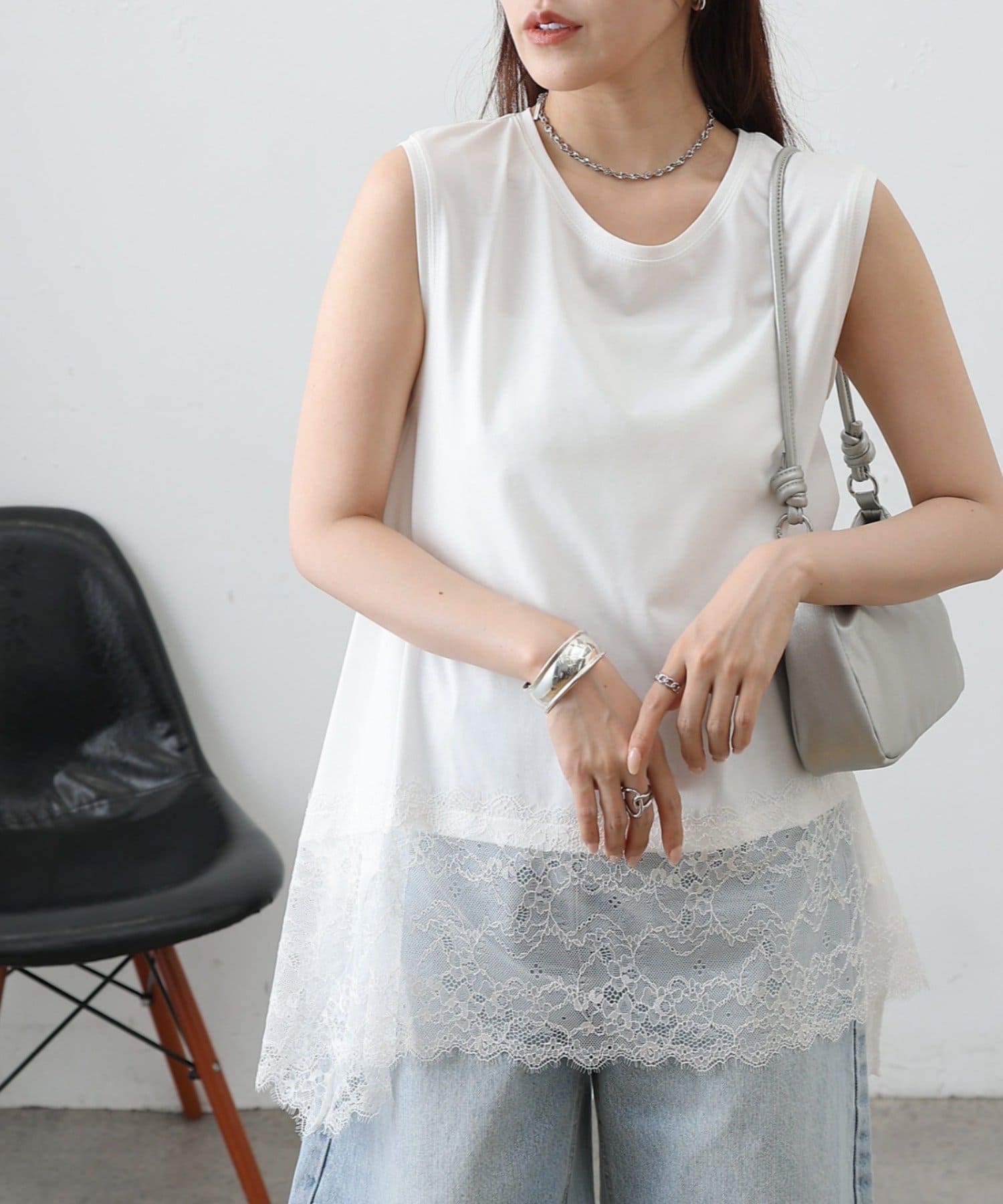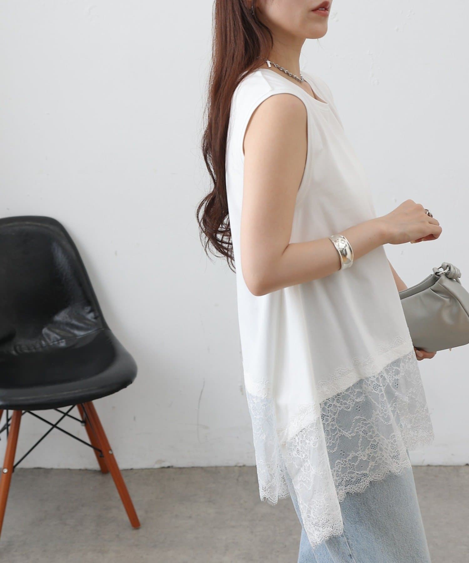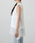 裾にあしらった繊細なレースと、動きのあるイレギュラーヘムが目を引くノースリーブプルオーバーです。