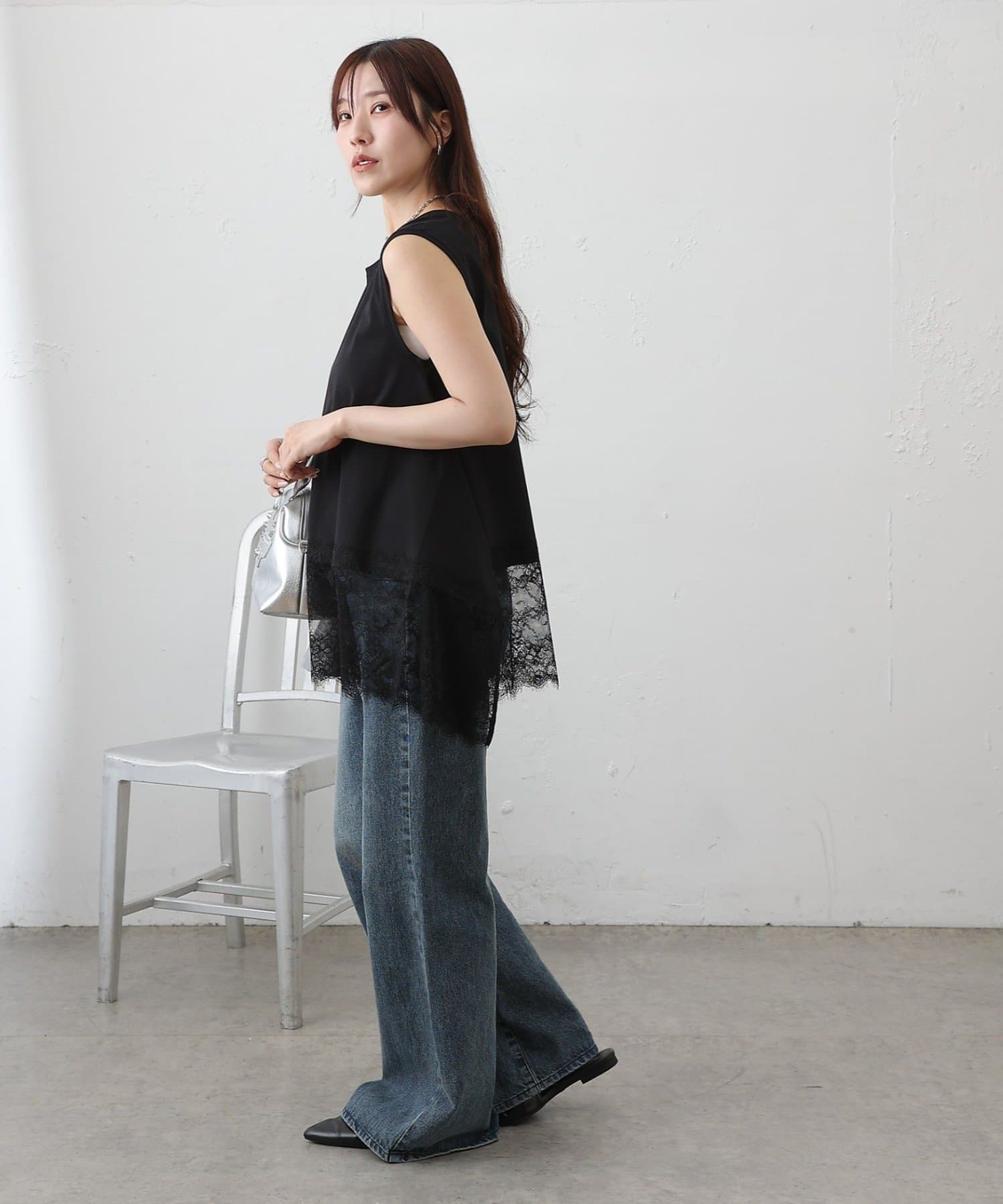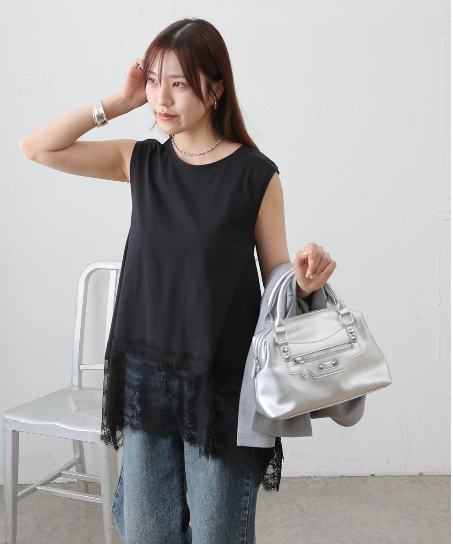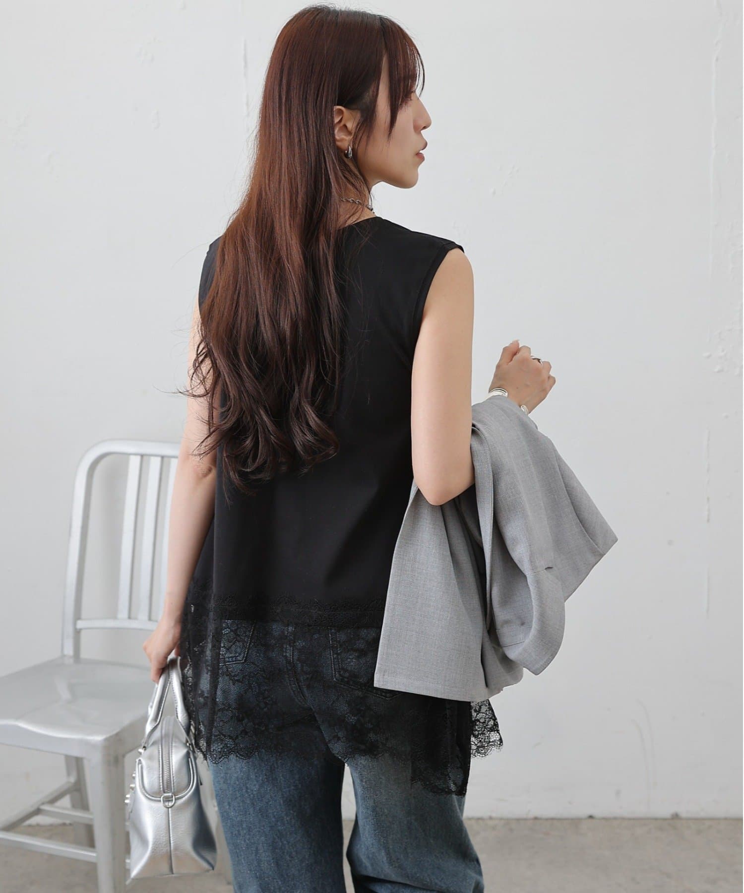 裾にあしらった繊細なレースと、動きのあるイレギュラーヘムが目を引くノースリーブプルオーバーです。