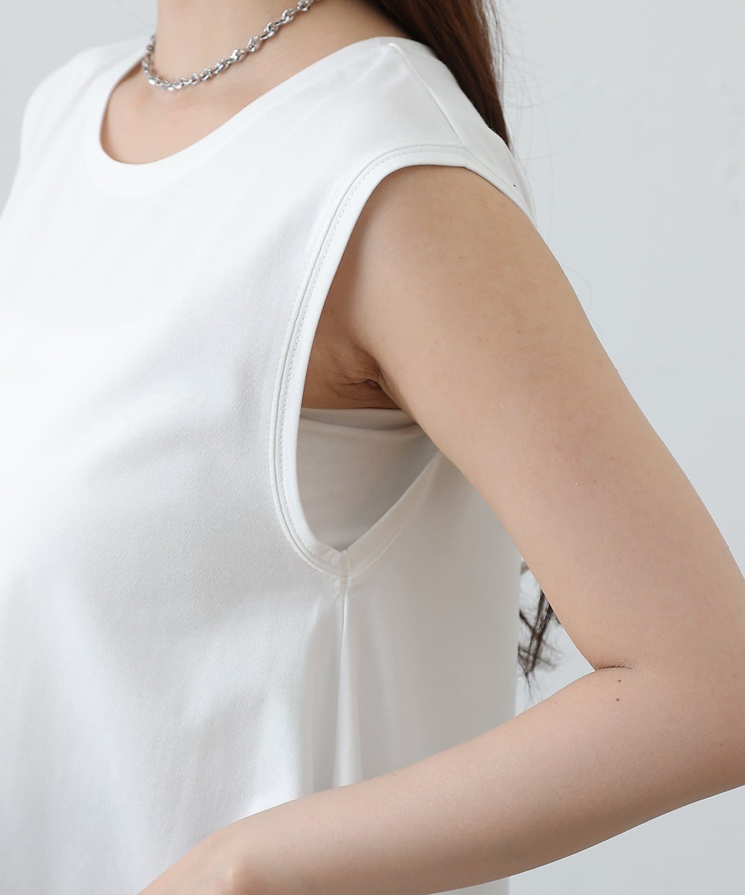 ノースリーブでも肌見せが控えめで、1枚着はもちろんジャケットやカーディガンのインナーとしても着回しやすいのがポイントです。