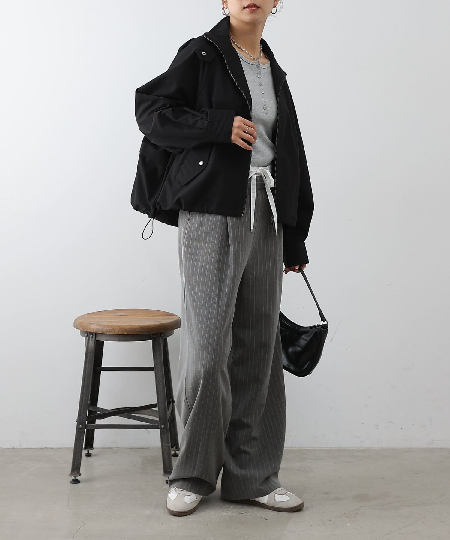 ドローコードをすべて伸ばした状態だと三角形のシルエットになるので、ショート丈と相まって脚長効果抜群のアイテムです。