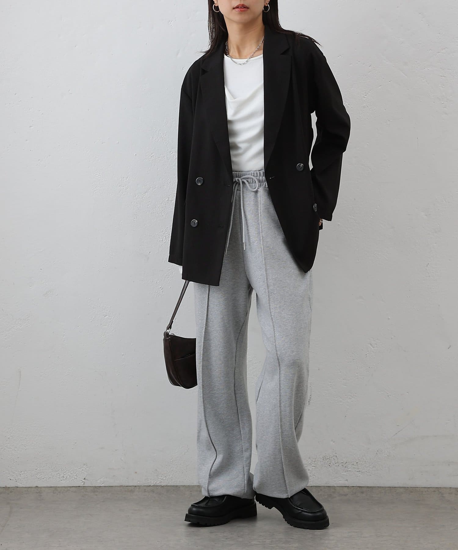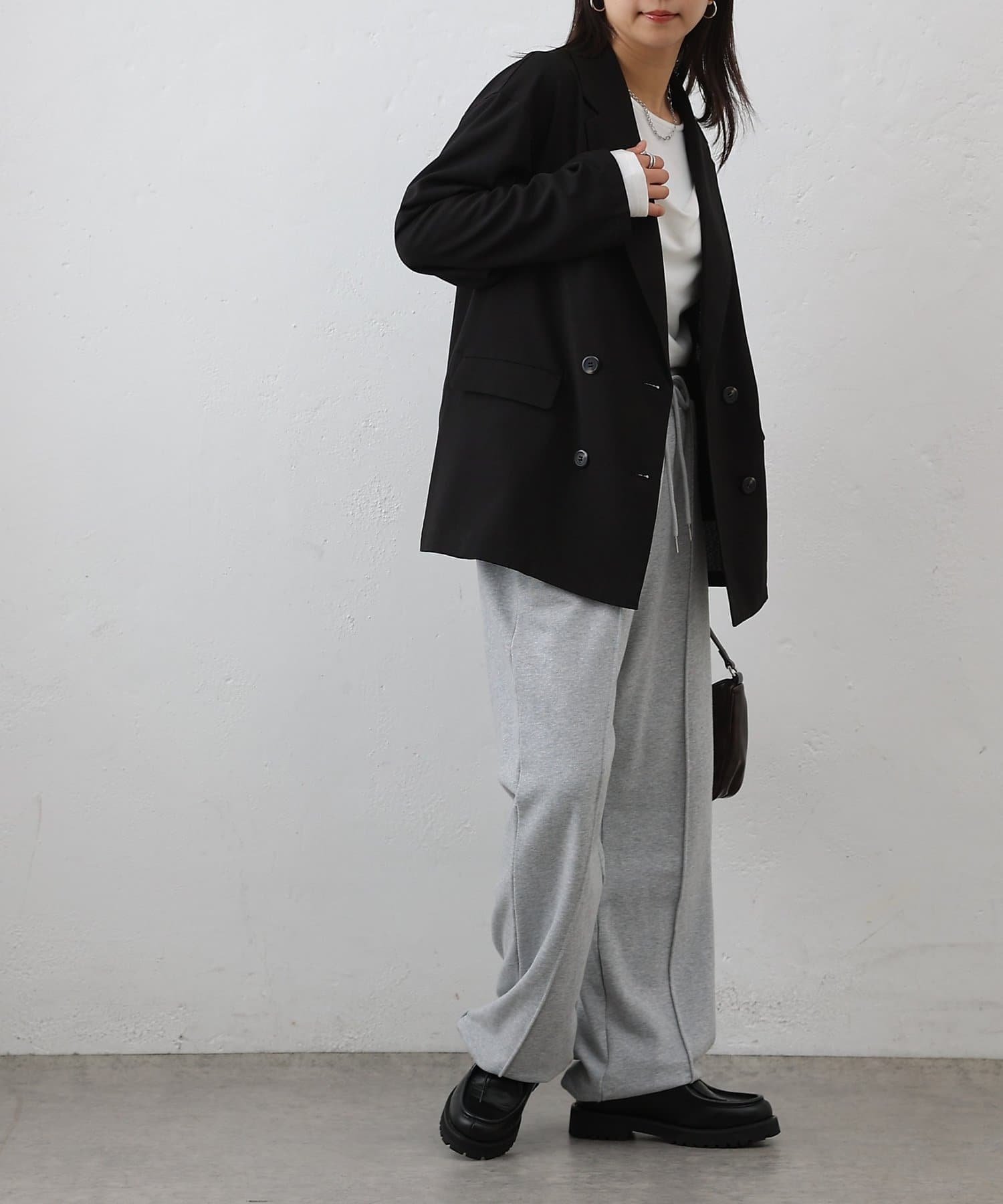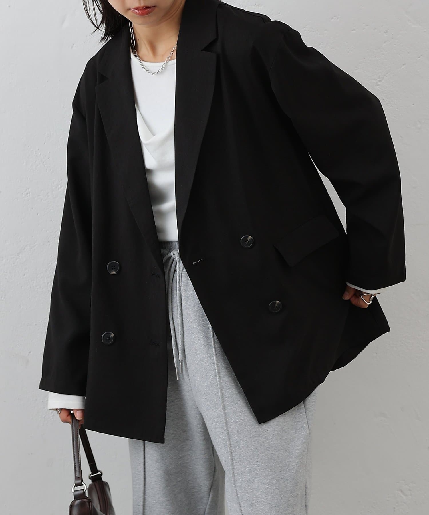 ダブルブレスト仕様が程よくマニッシュな印象を演出し、縦のラインを強調することでスタイルアップ効果も期待できます◎