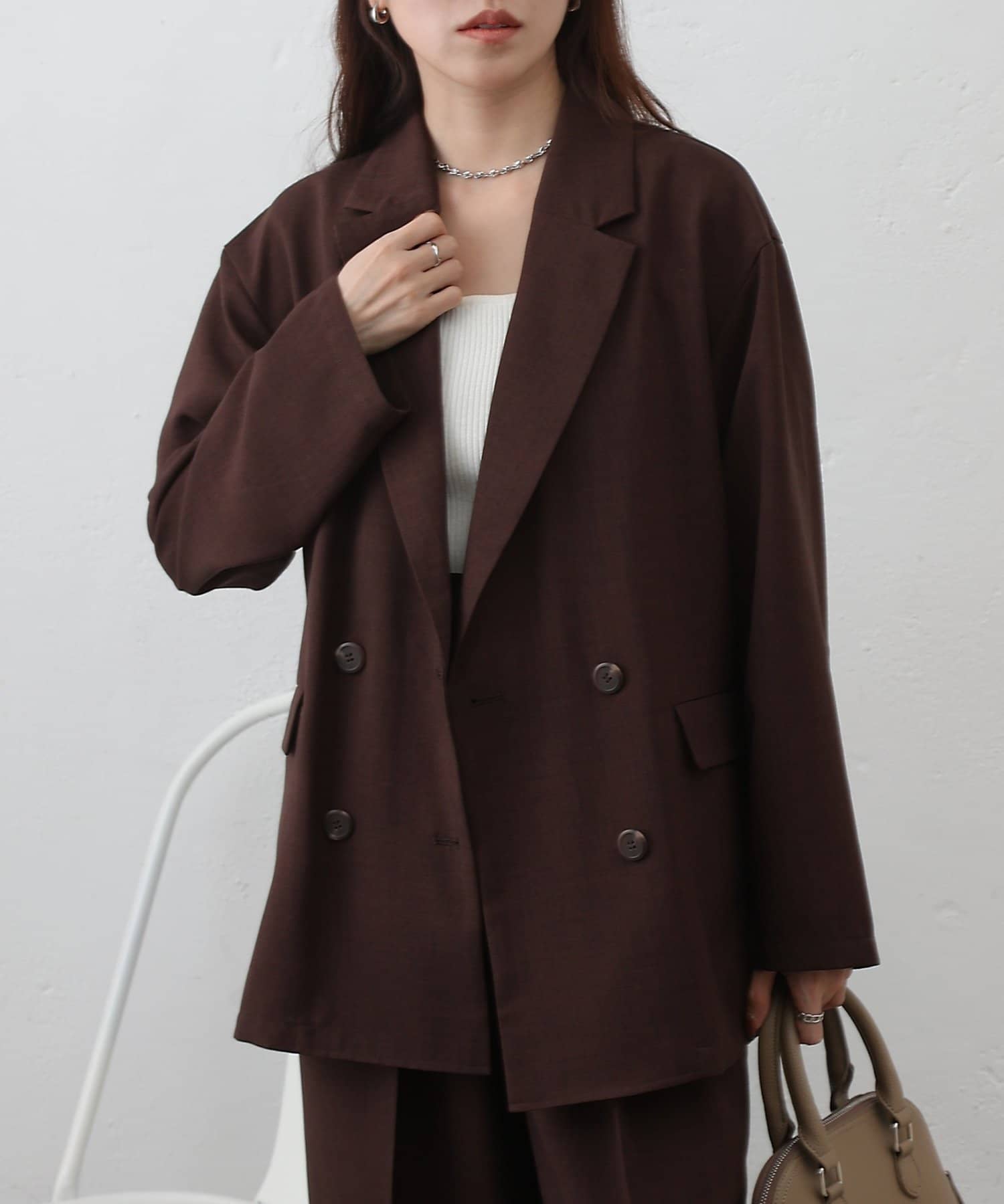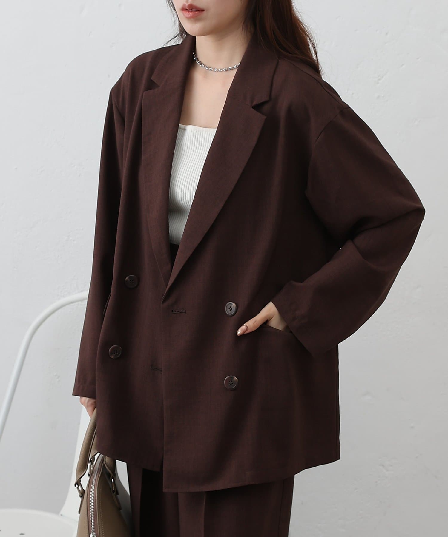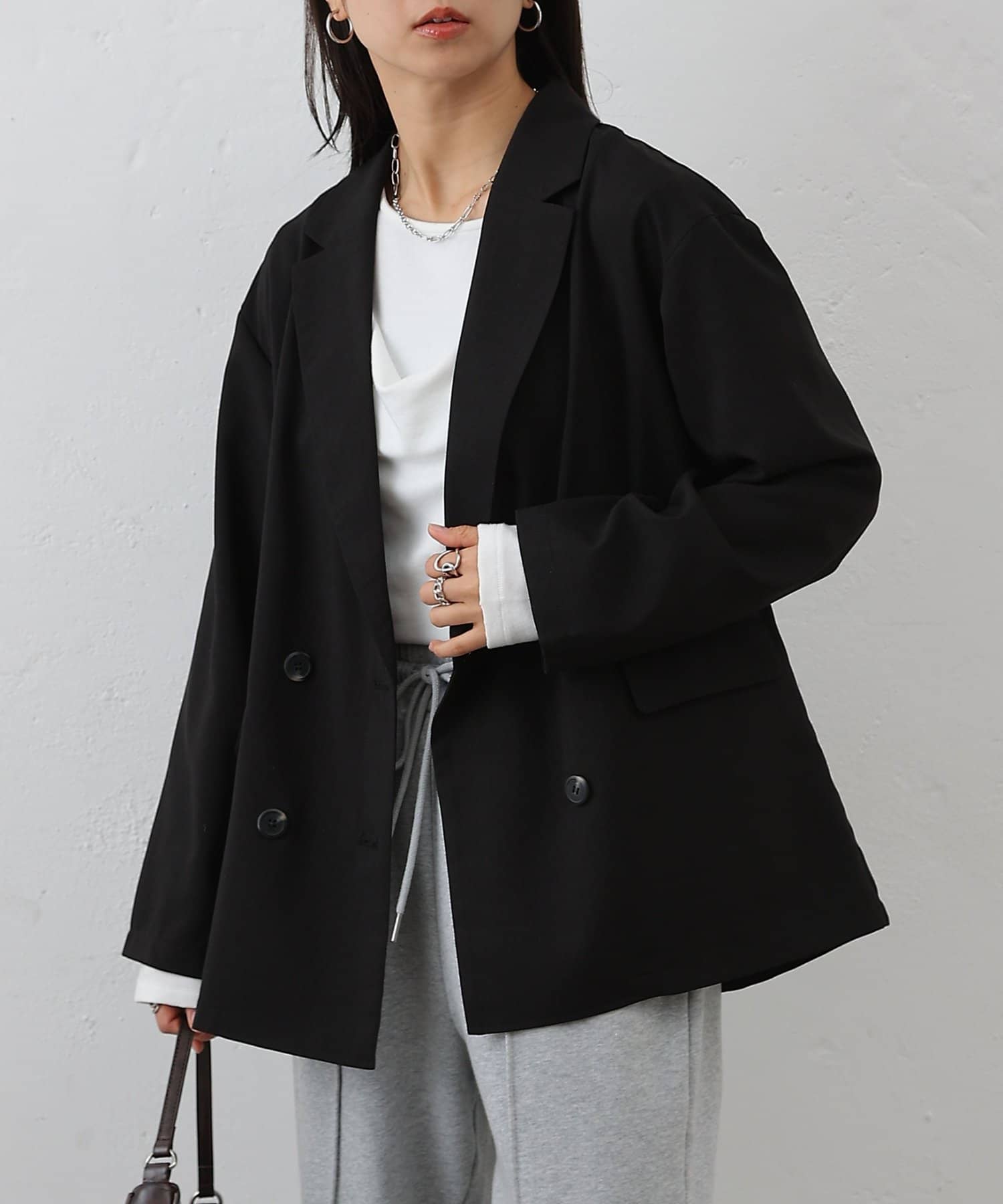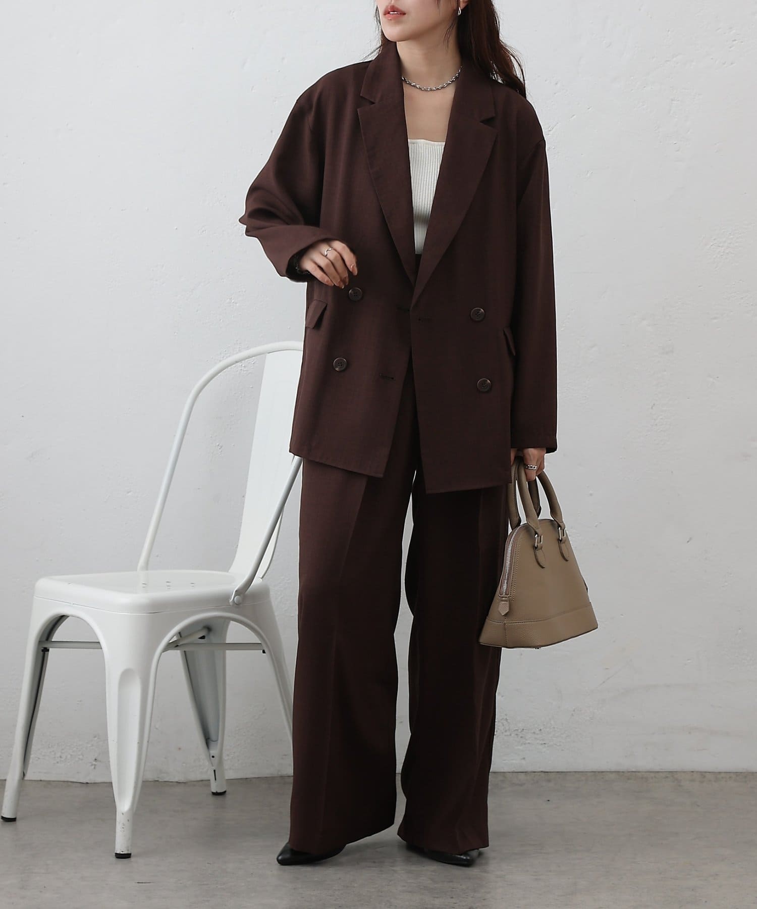 ダブルブレスト仕様が程よくマニッシュな印象を演出し、縦のラインを強調することでスタイルアップ効果も期待できます◎
