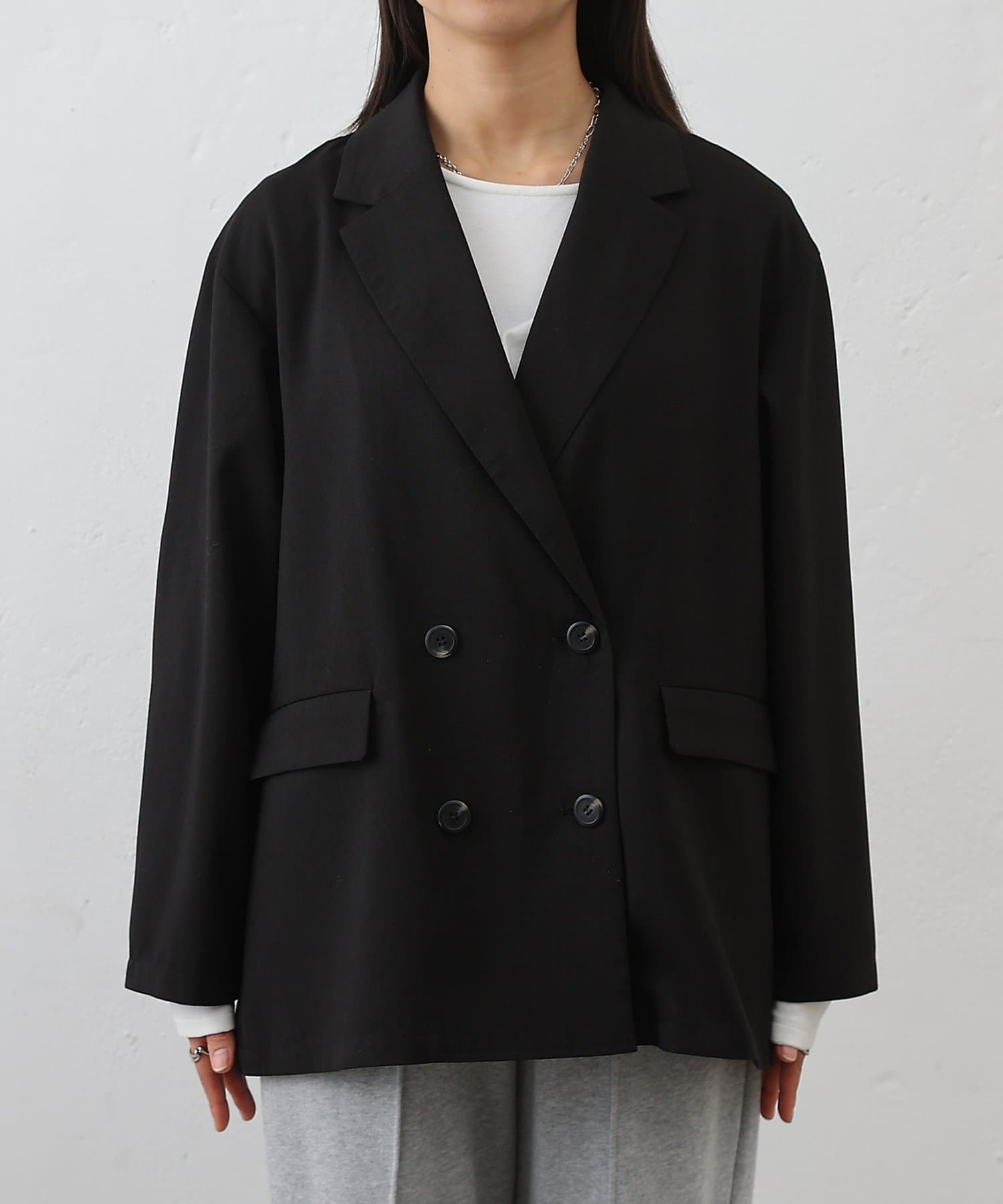 テックリネン素材を使用したダブルテーラードジャケットです。