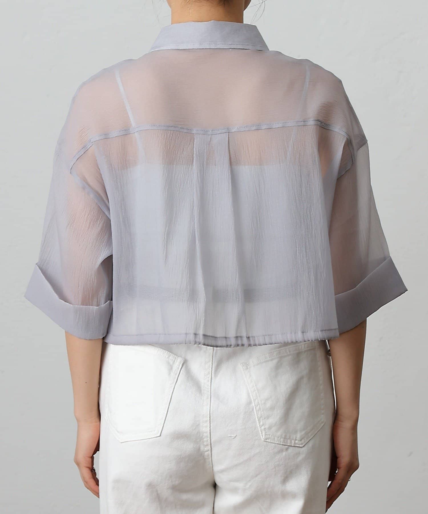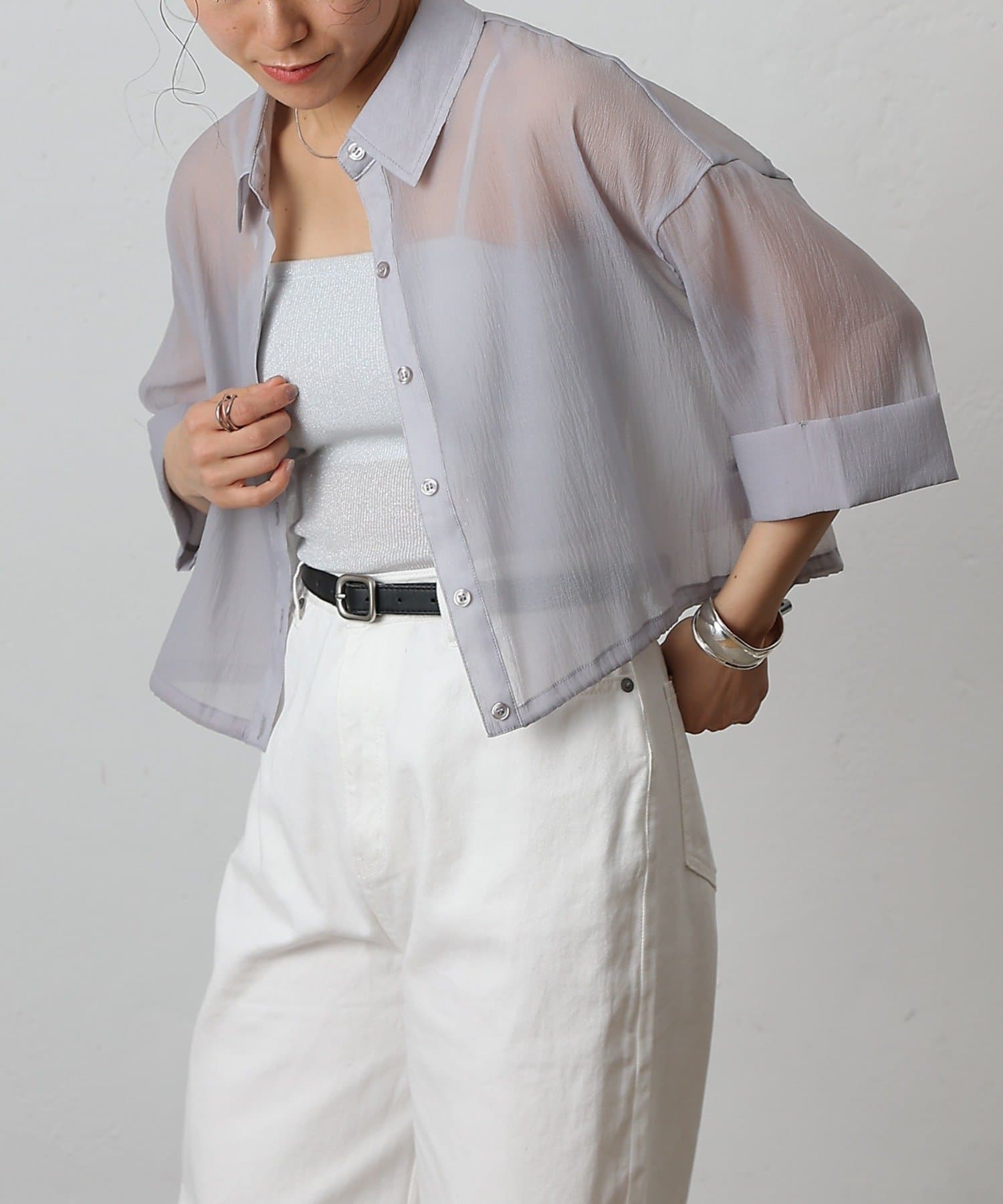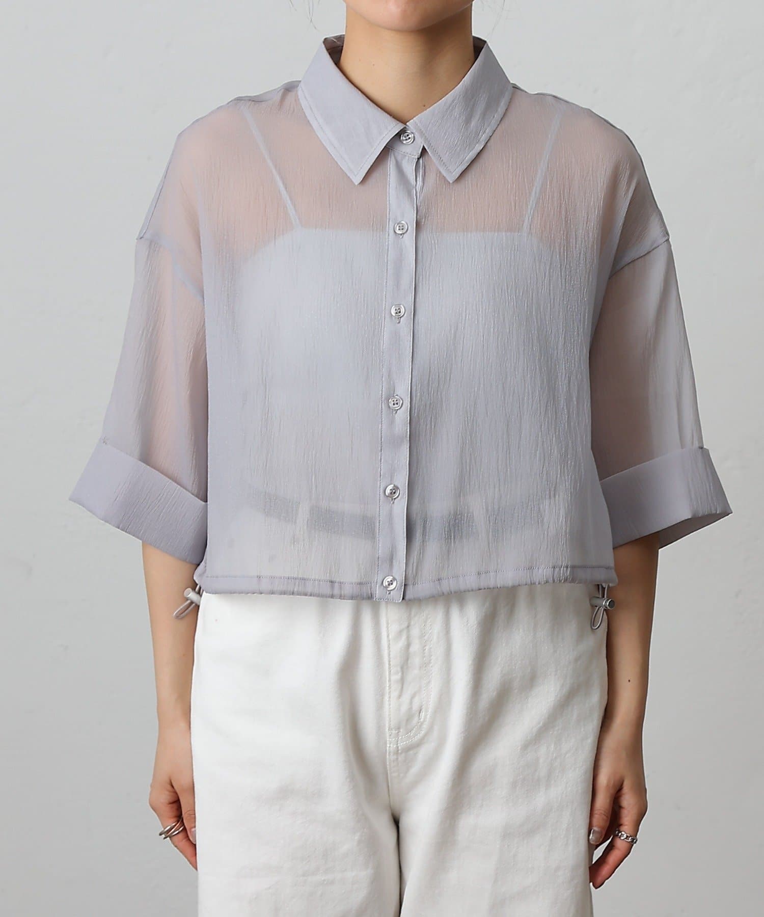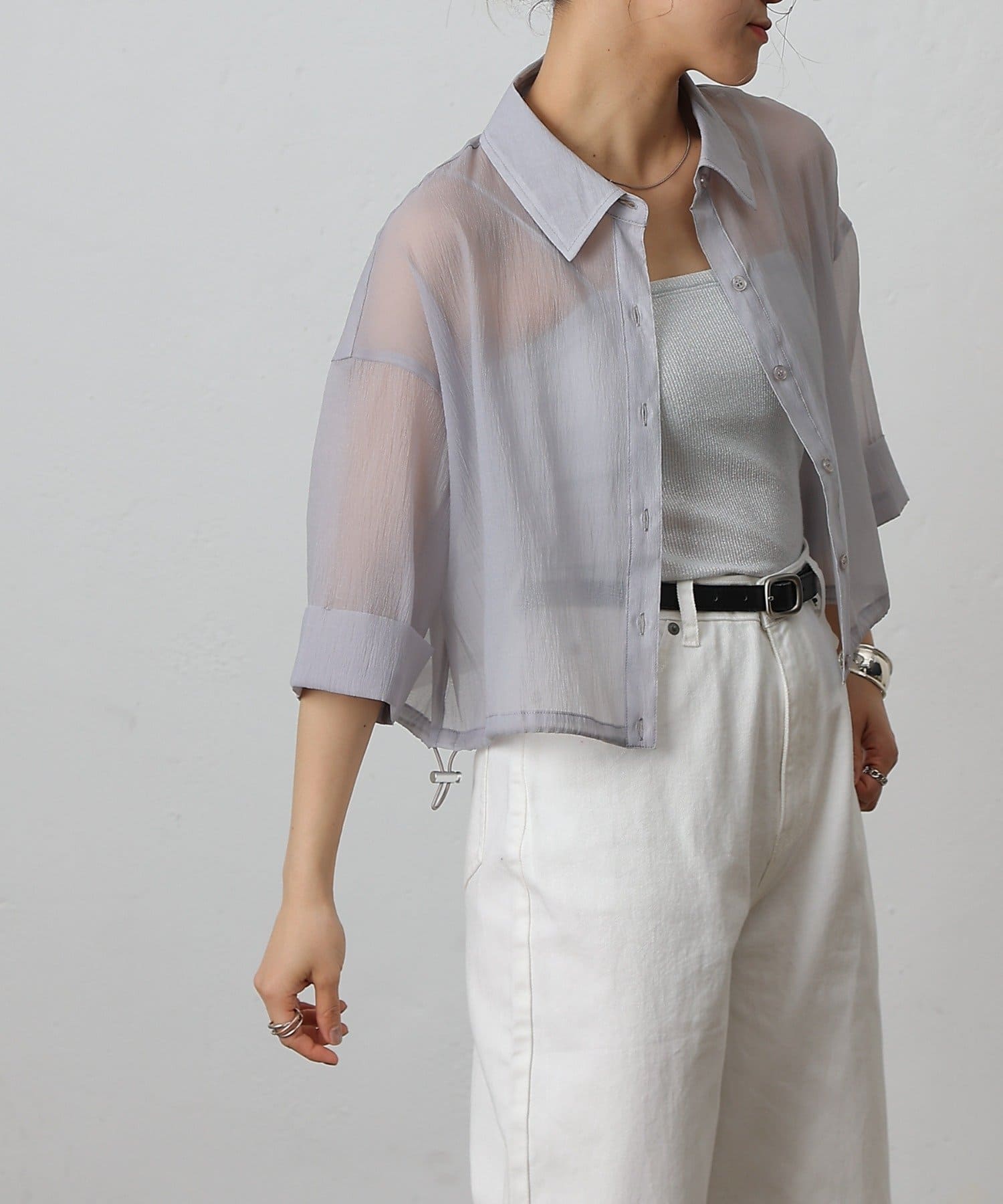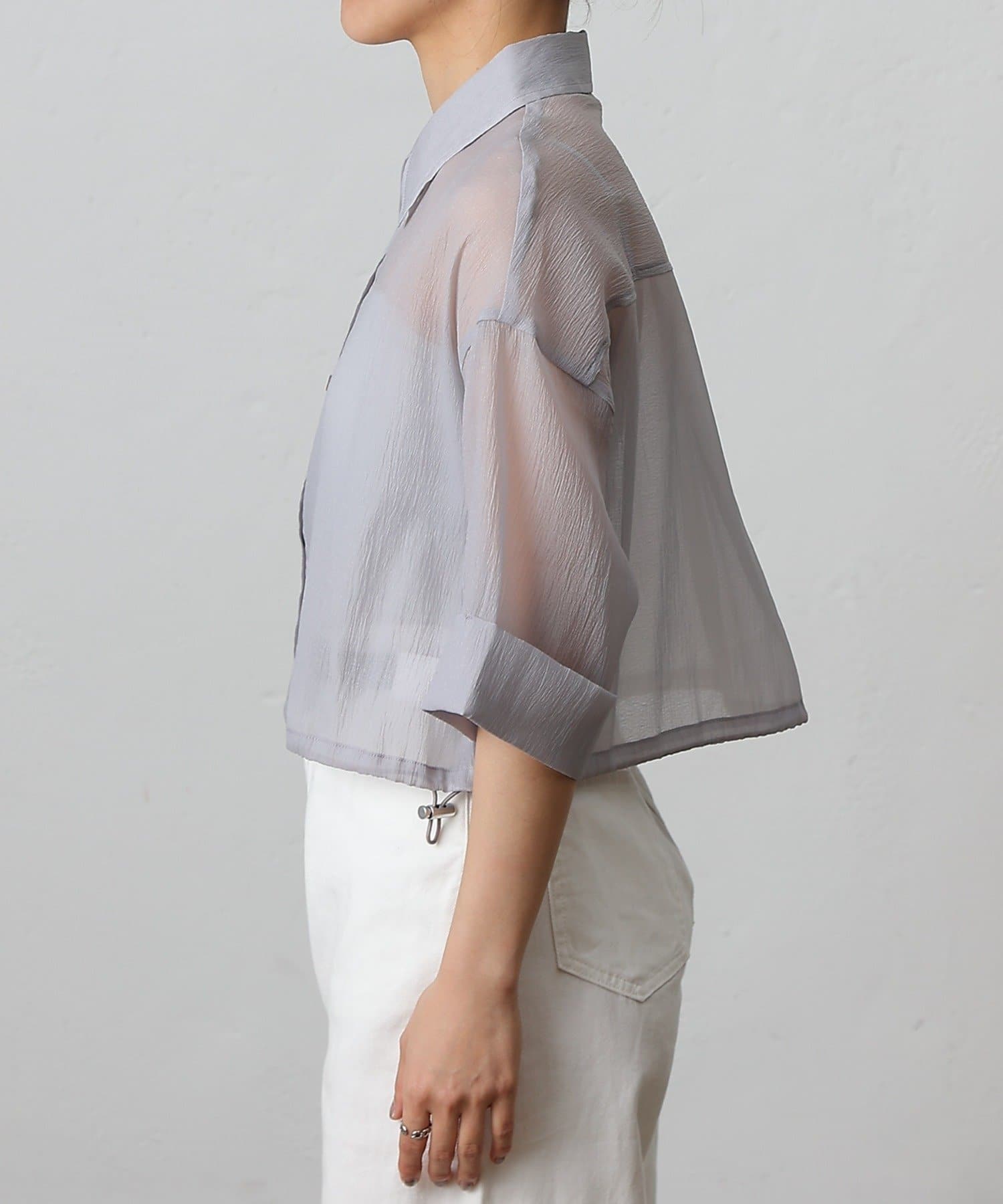 透け感の強いシャツなので、インナー次第で雰囲気がガラッと変わるのも嬉しいポイント。