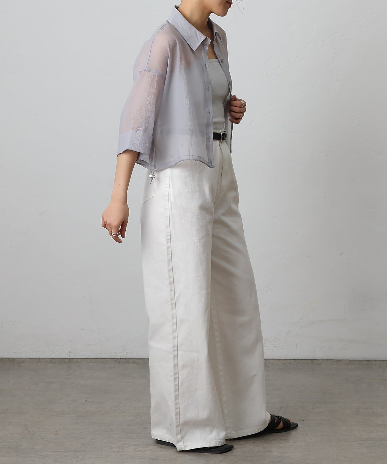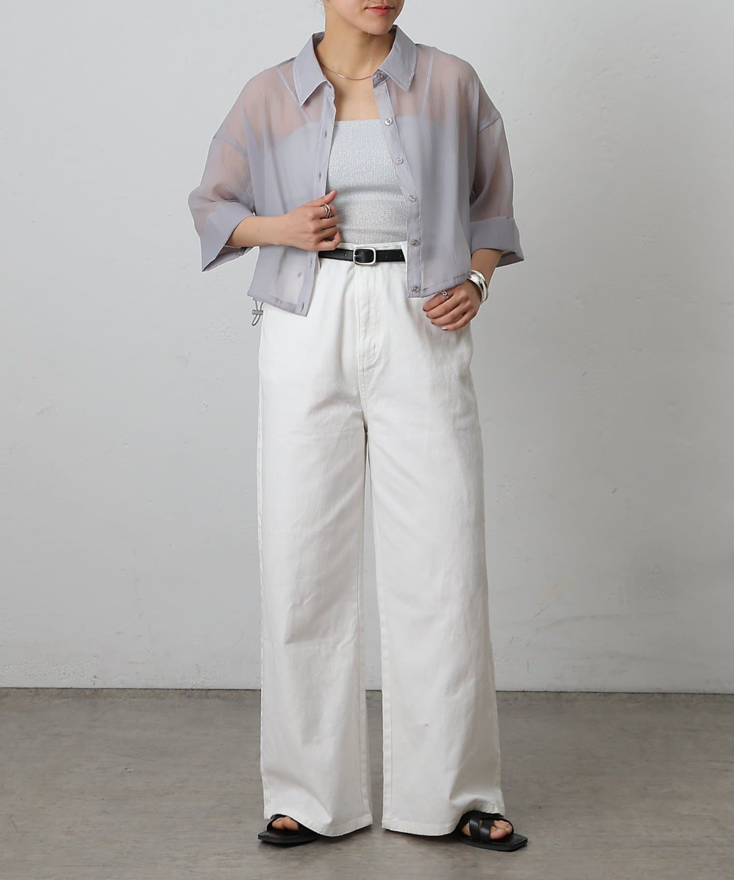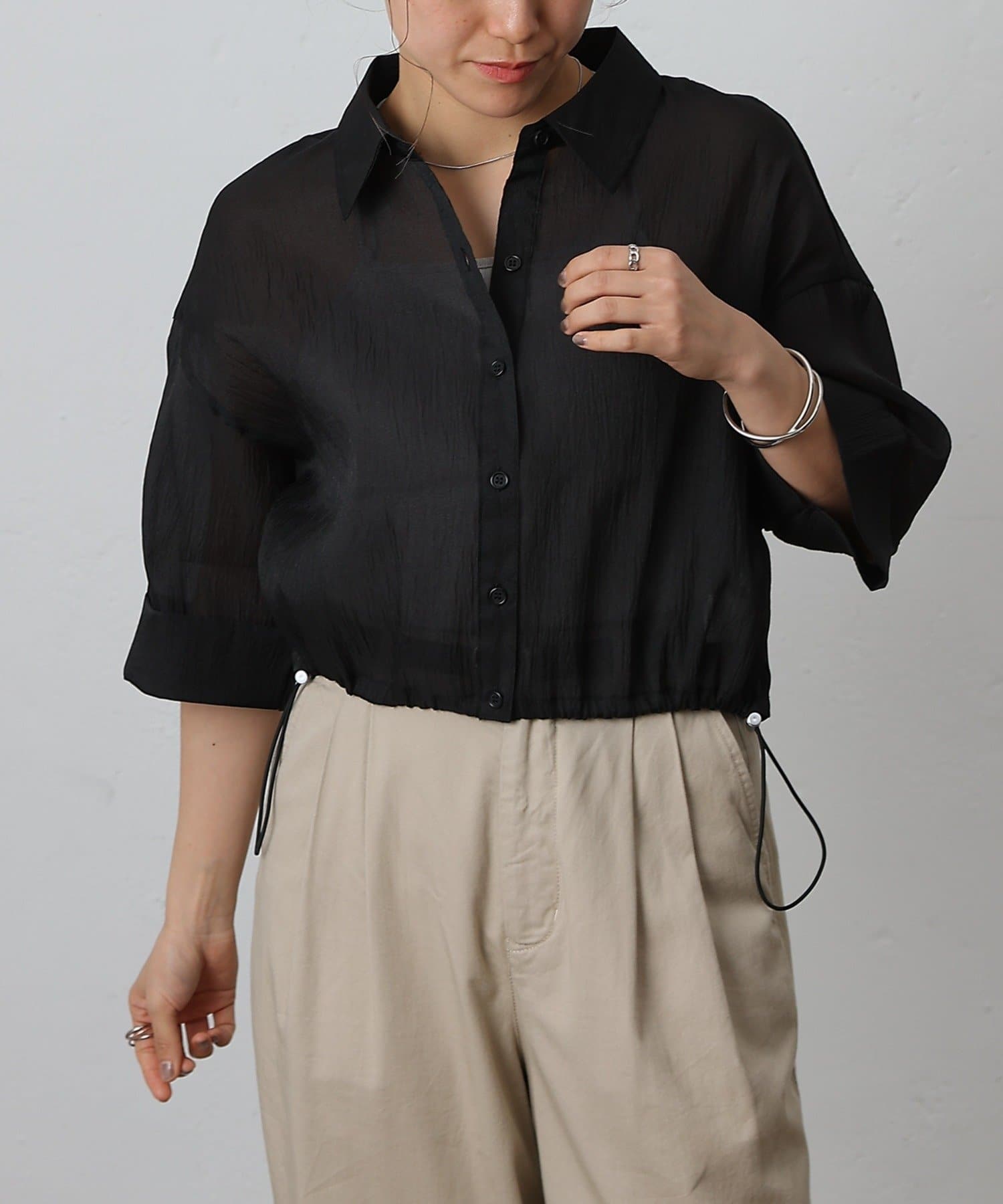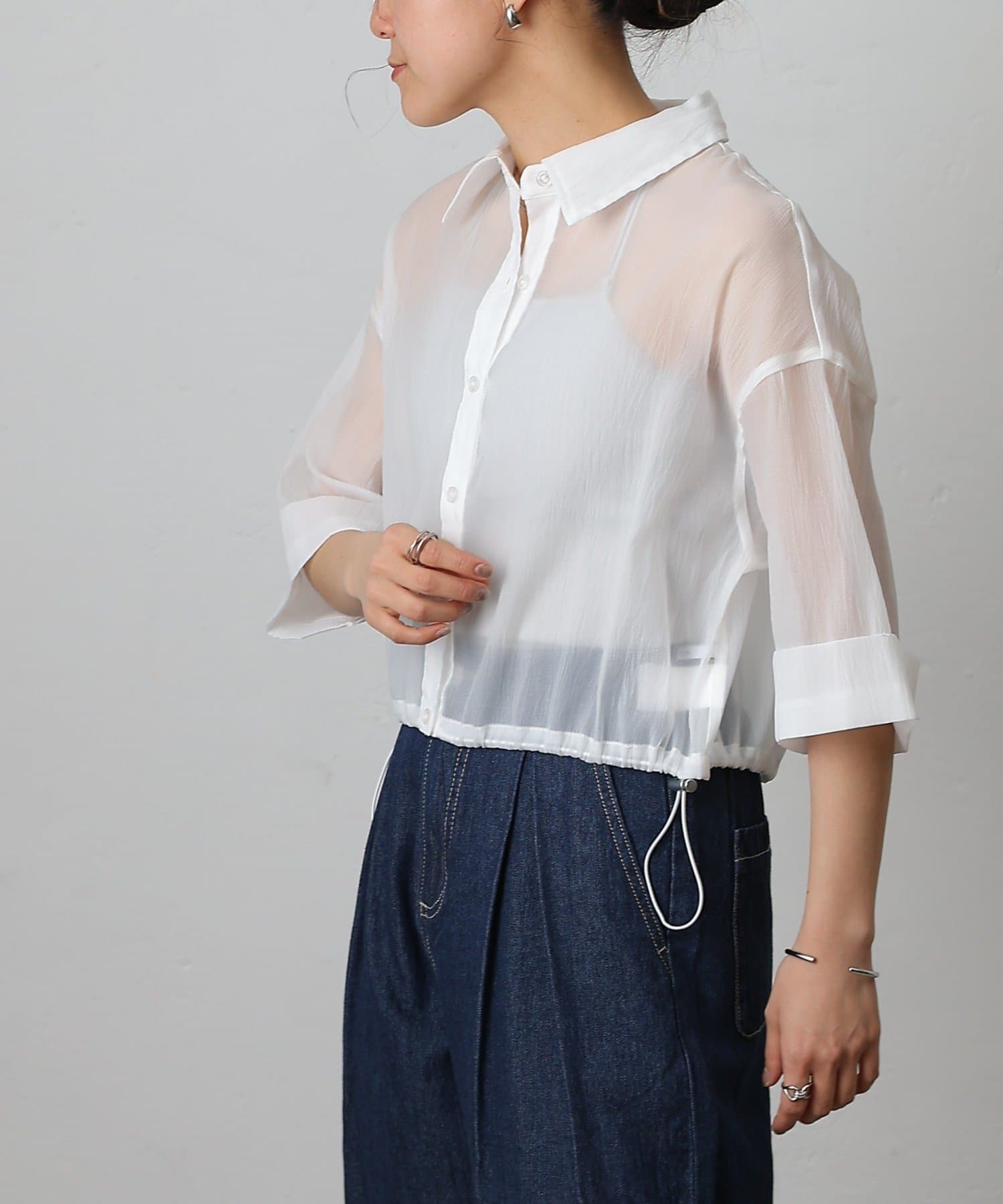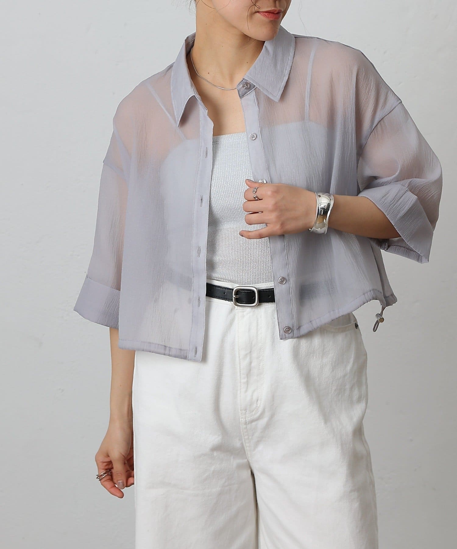 透け感の強いシャツなので、インナー次第で雰囲気がガラッと変わるのも嬉しいポイント。