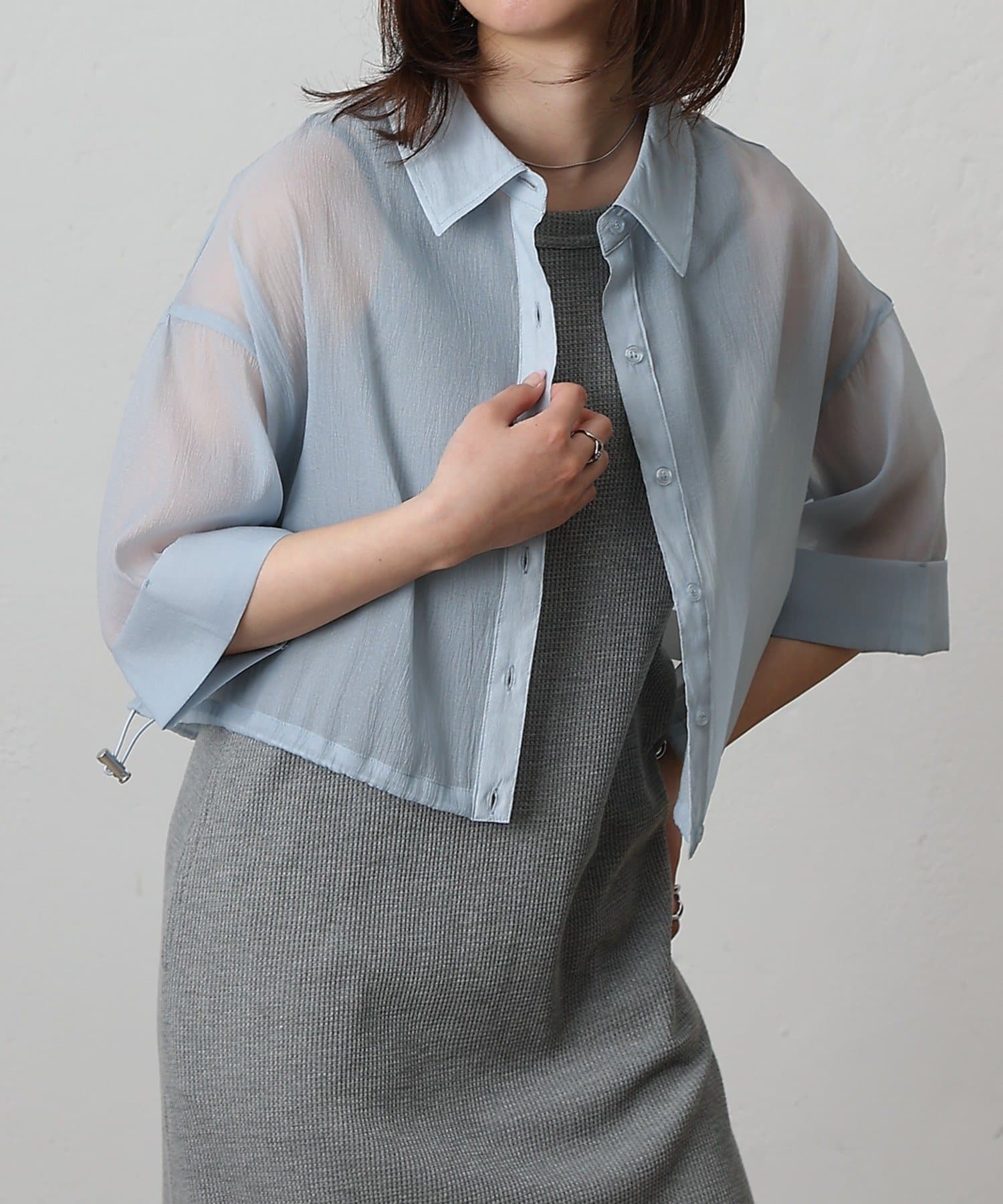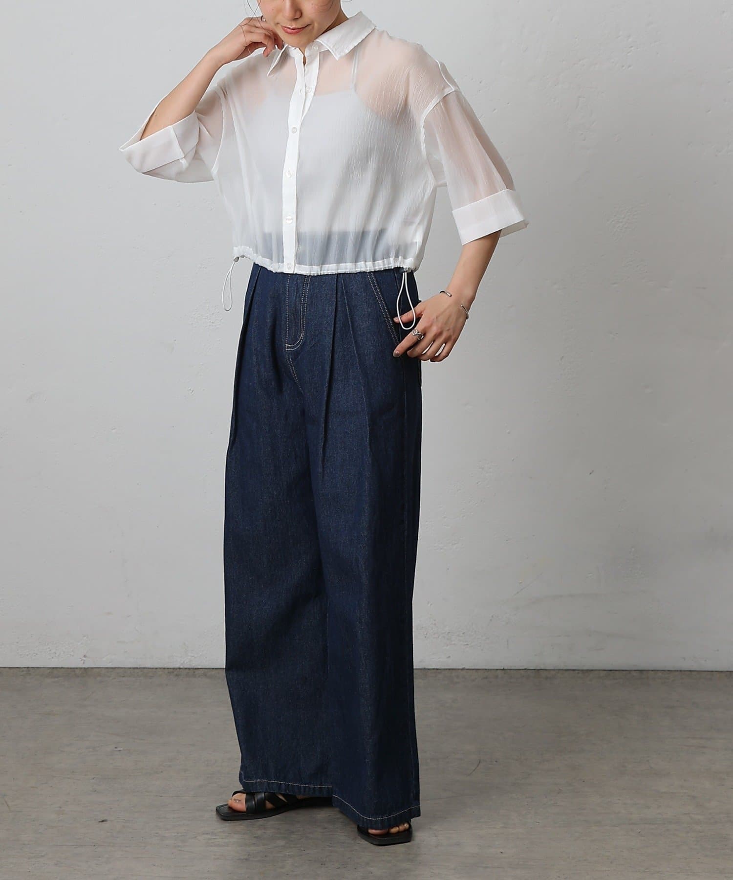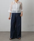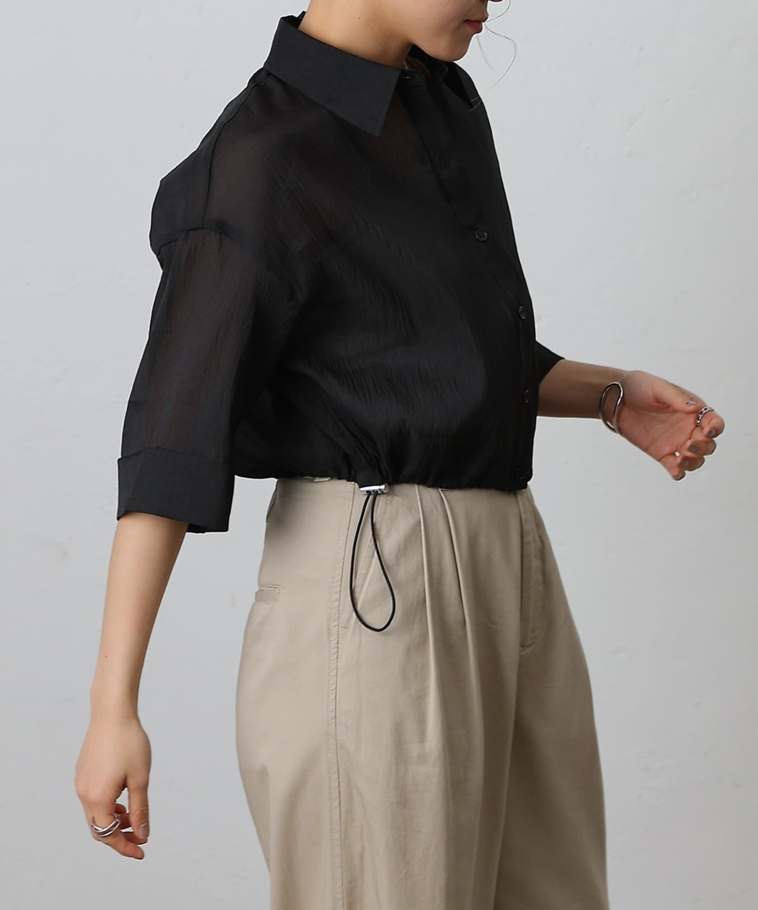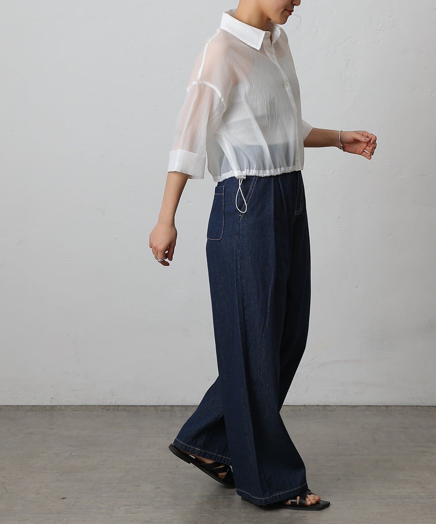 透け感の強いシャツなので、インナー次第で雰囲気がガラッと変わるのも嬉しいポイント。