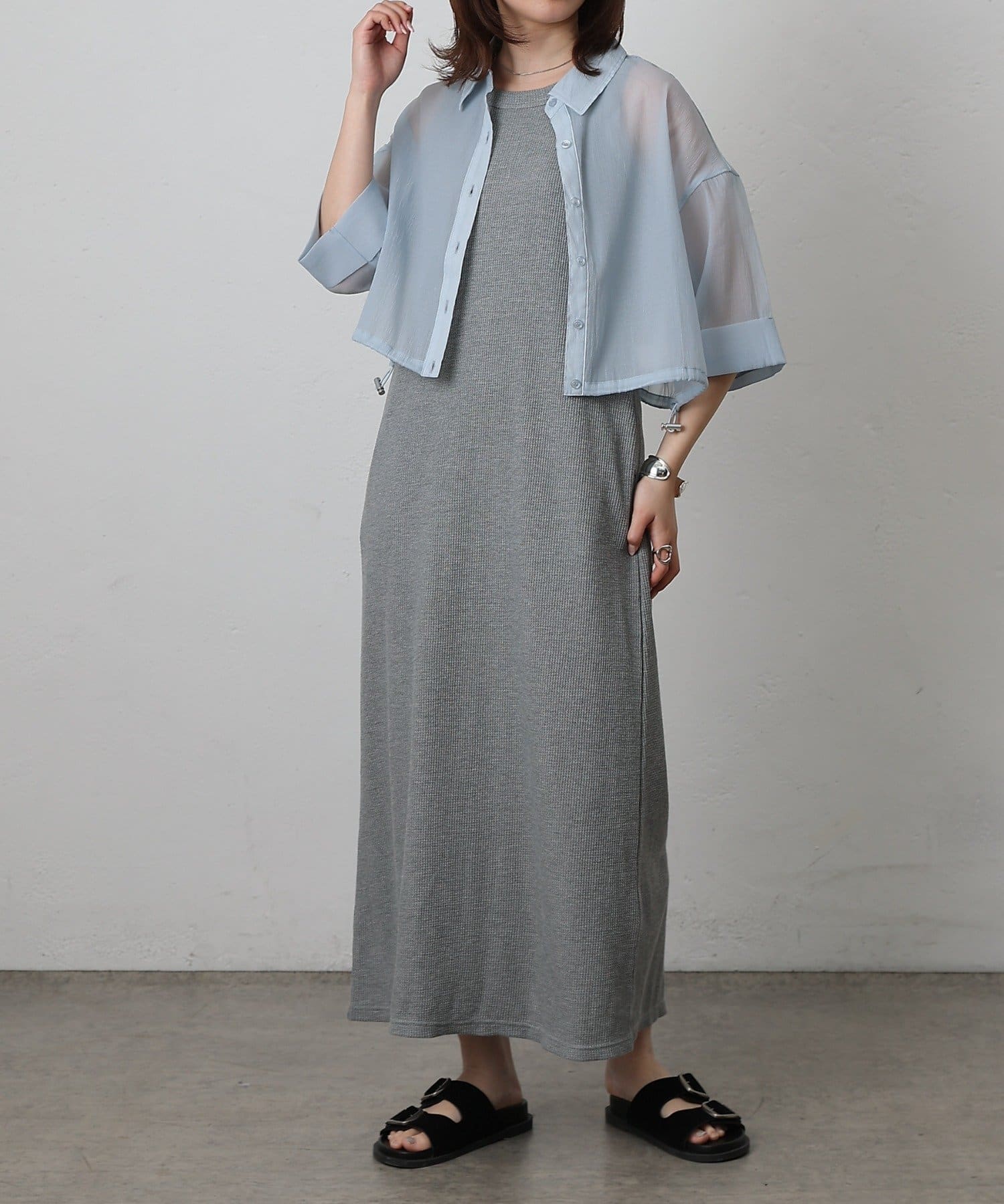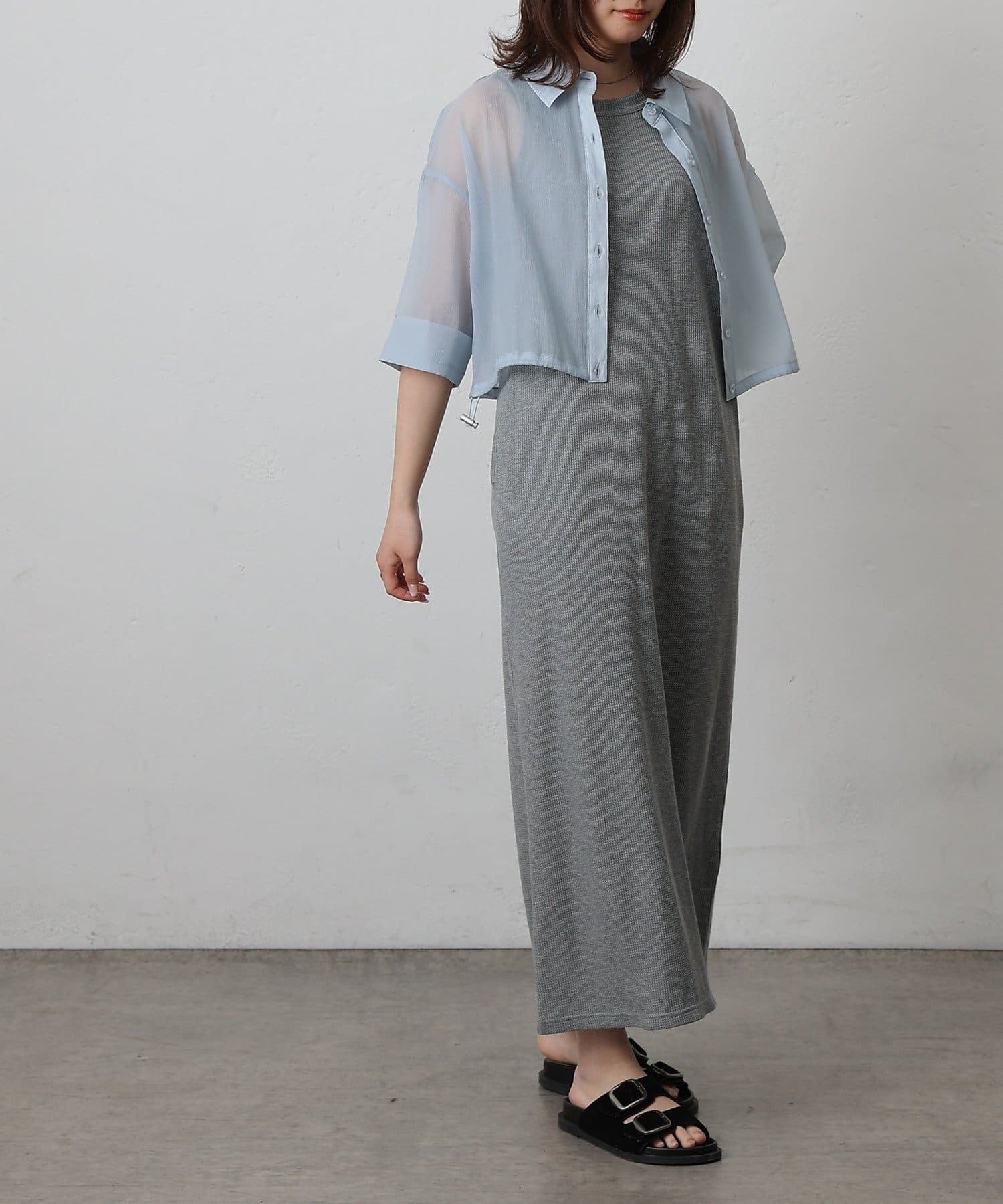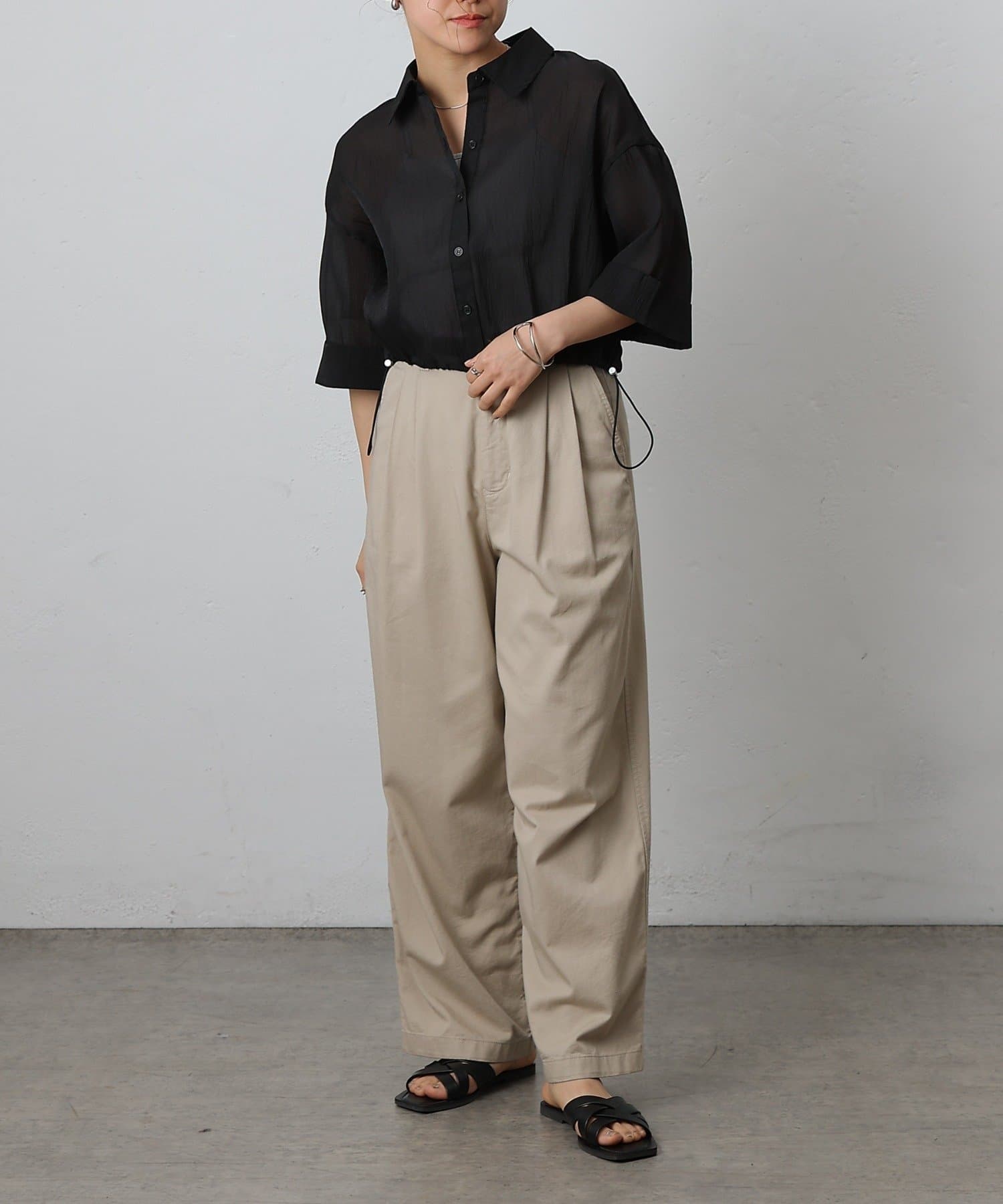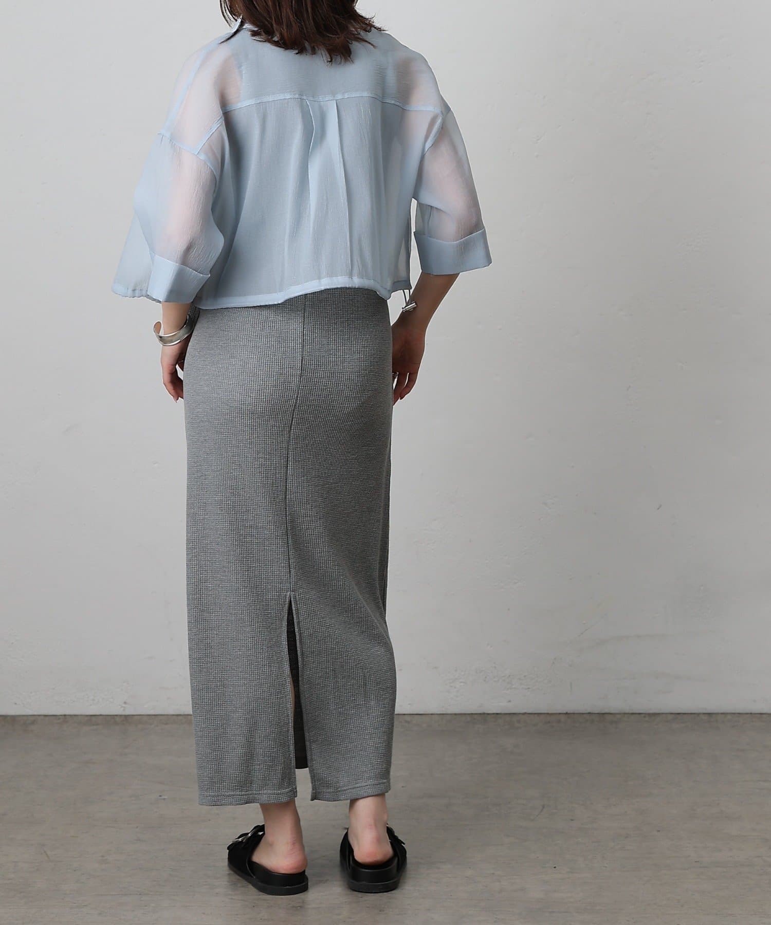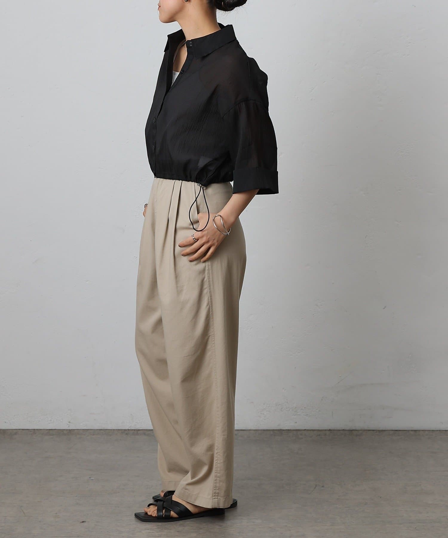 透け感の強いシャツなので、インナー次第で雰囲気がガラッと変わるのも嬉しいポイント。