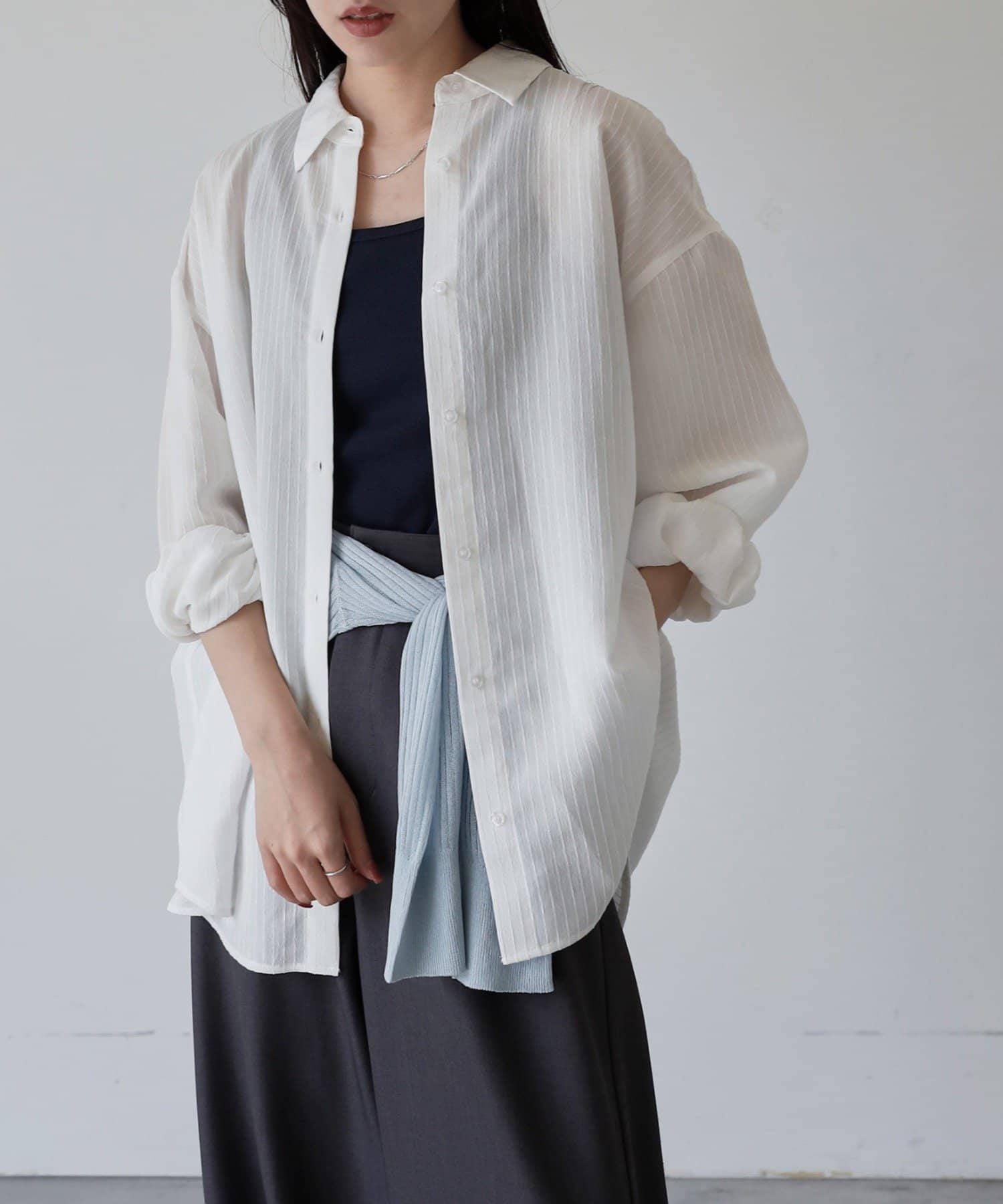 Tシャツや、キャミソールの上からなどいろいろなものと合わせやすいデザインになっています。