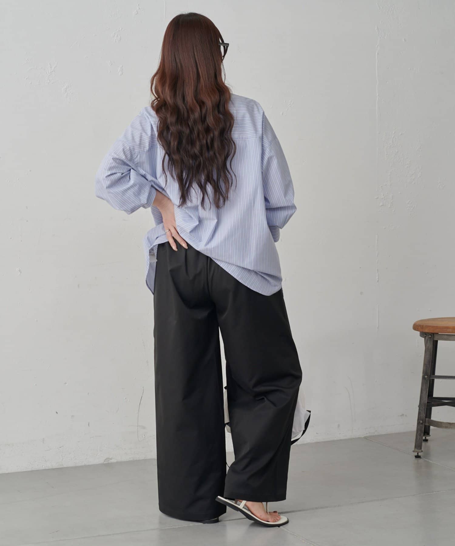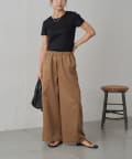 足のラインを隠しつつ穿けるややゆとりのあるシルエットなので、コンパクトなトップスともバランスよく合わせられます。
