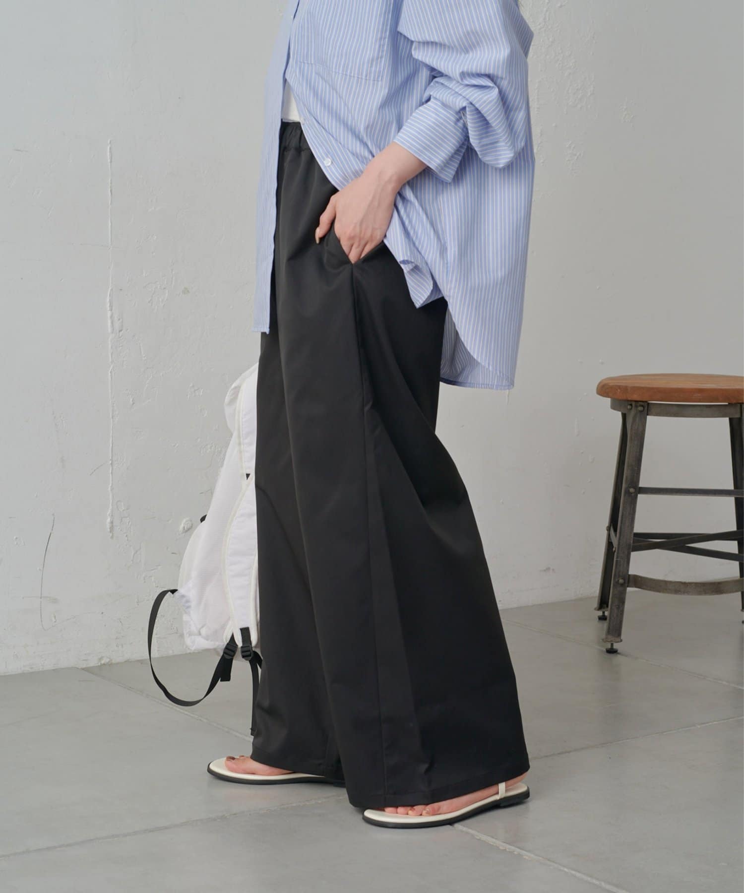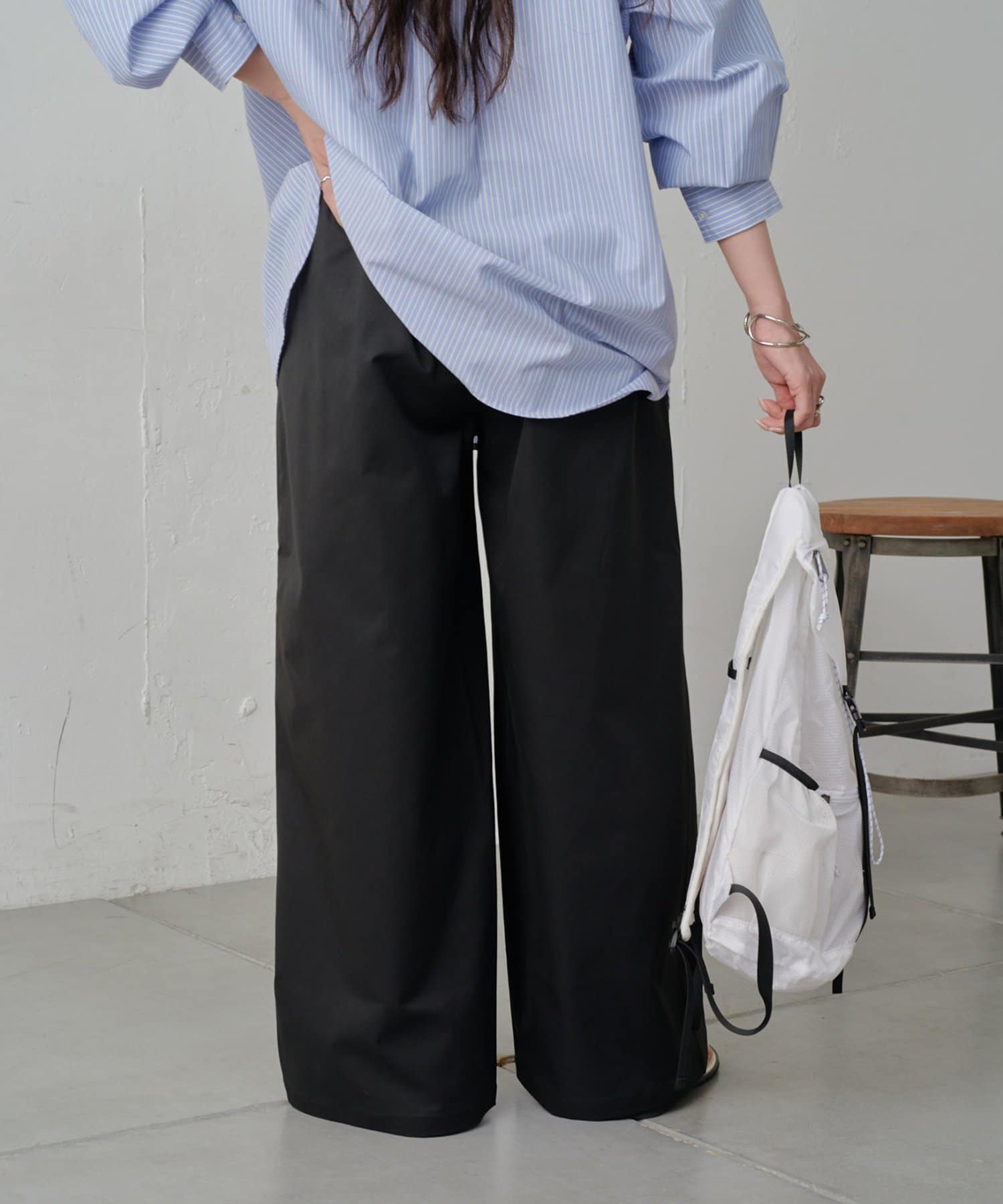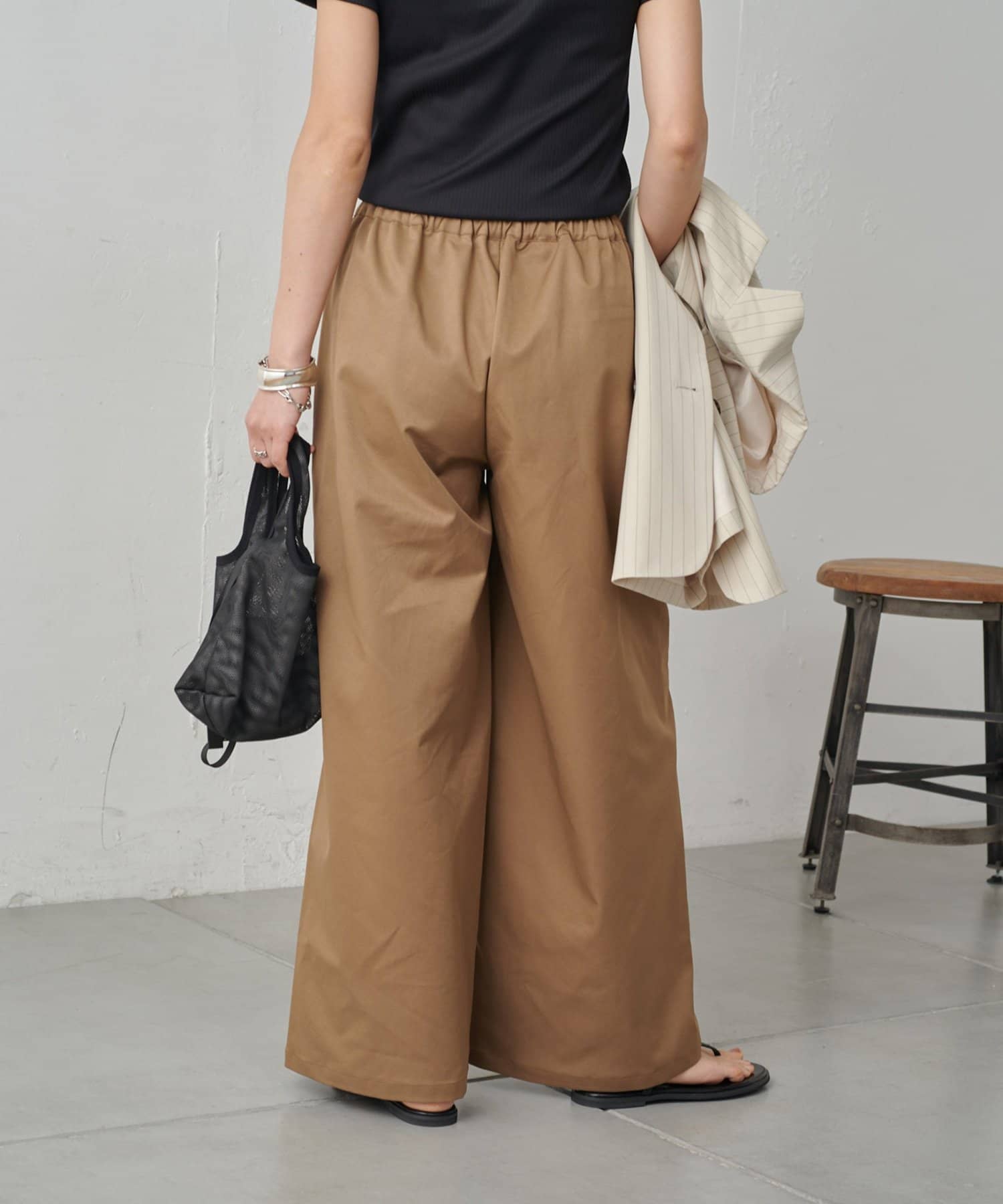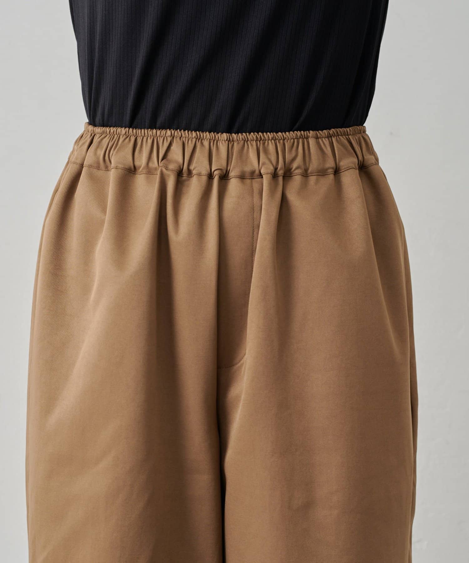 やや光沢感のある上品な素材なので、イージーパンツ仕様でもラフすぎずにキレイめな印象になります。
