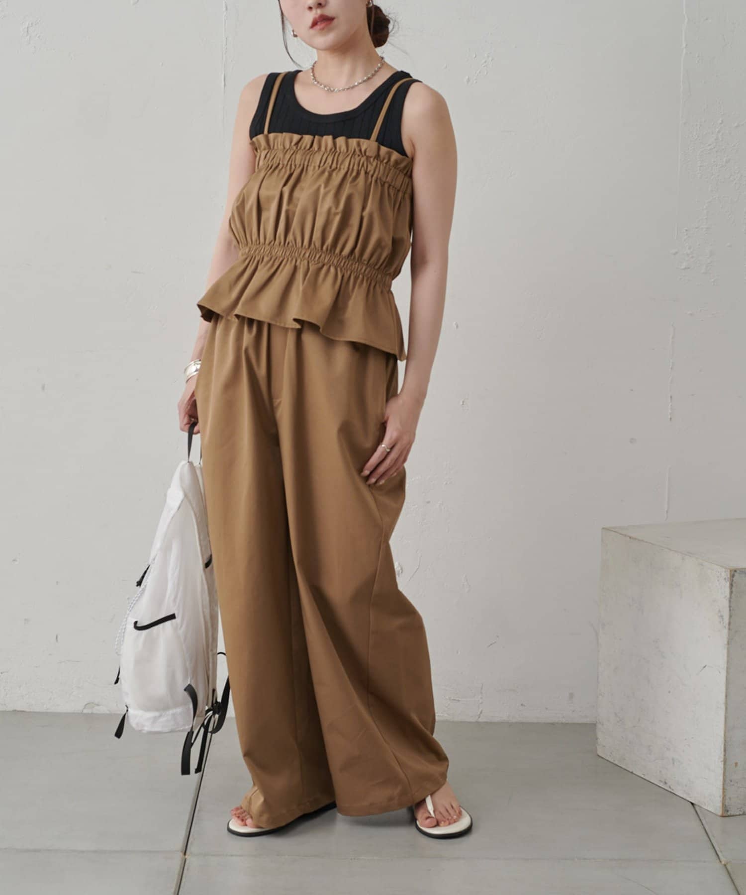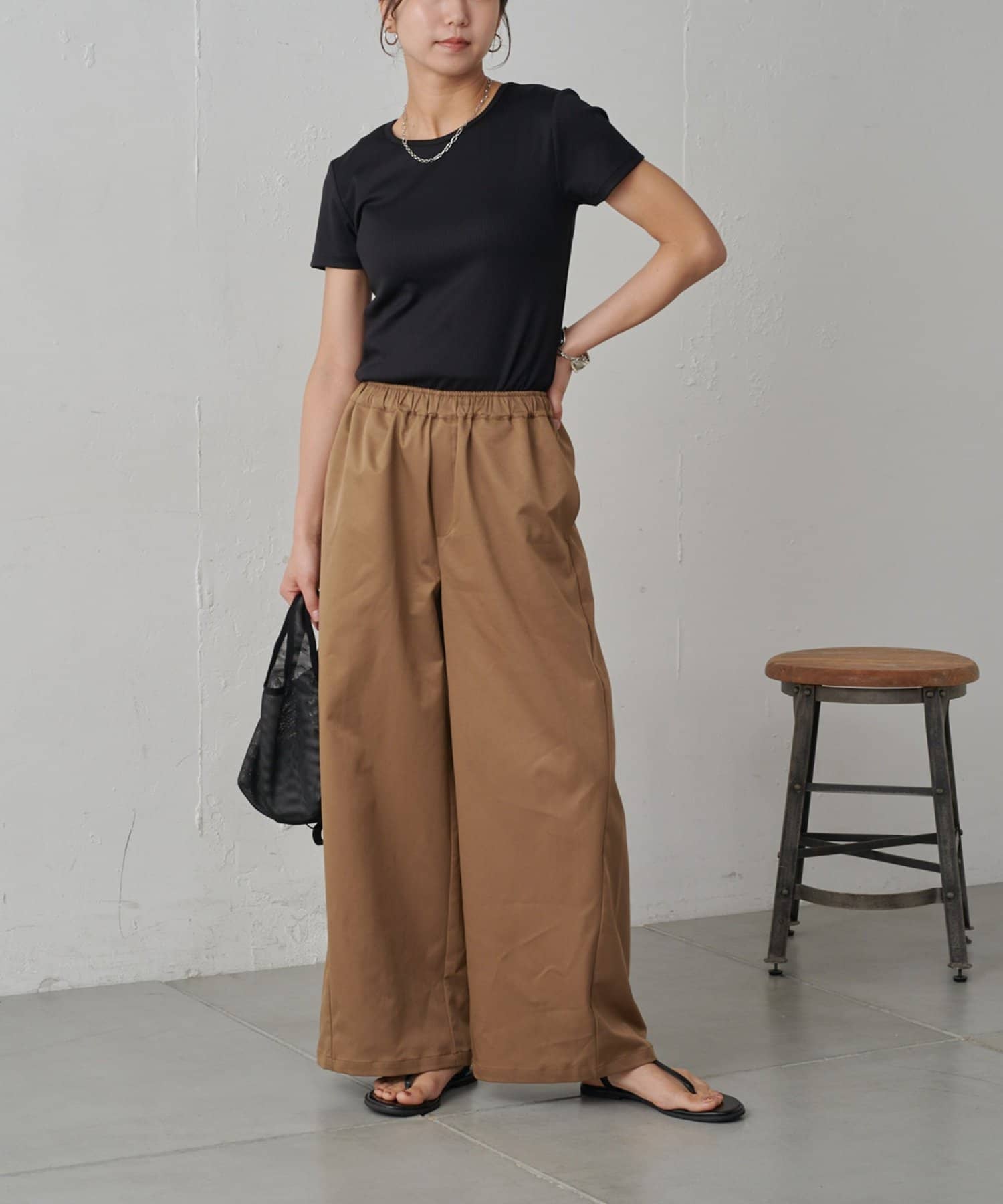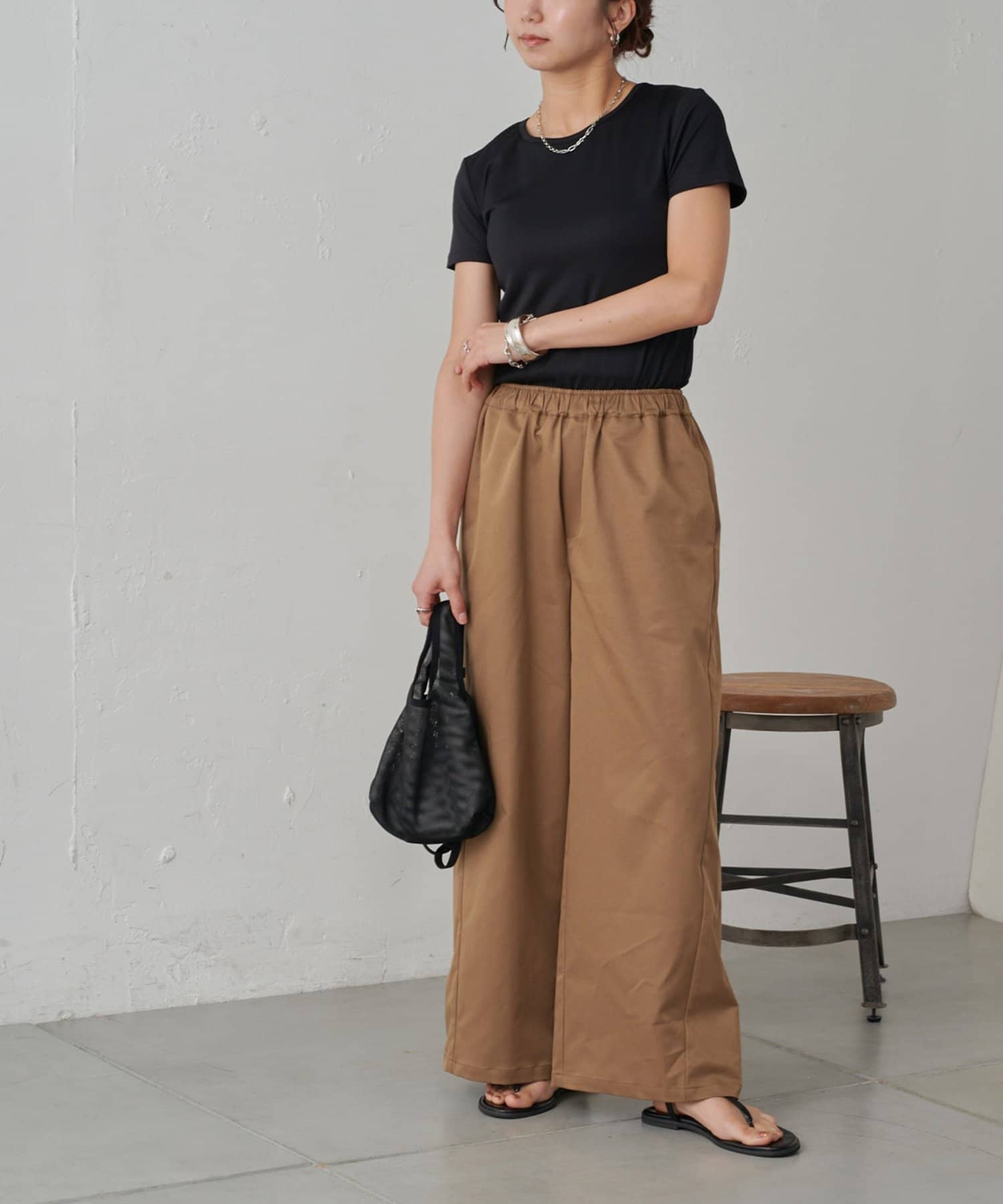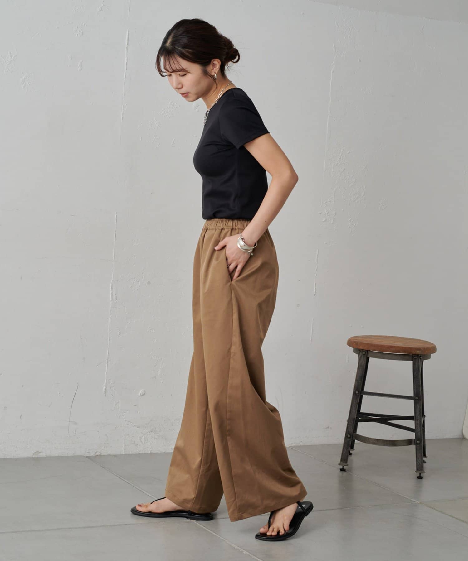 やや光沢感のある上品な素材なので、イージーパンツ仕様でもラフすぎずにキレイめな印象になります。