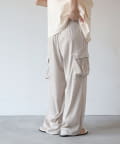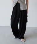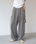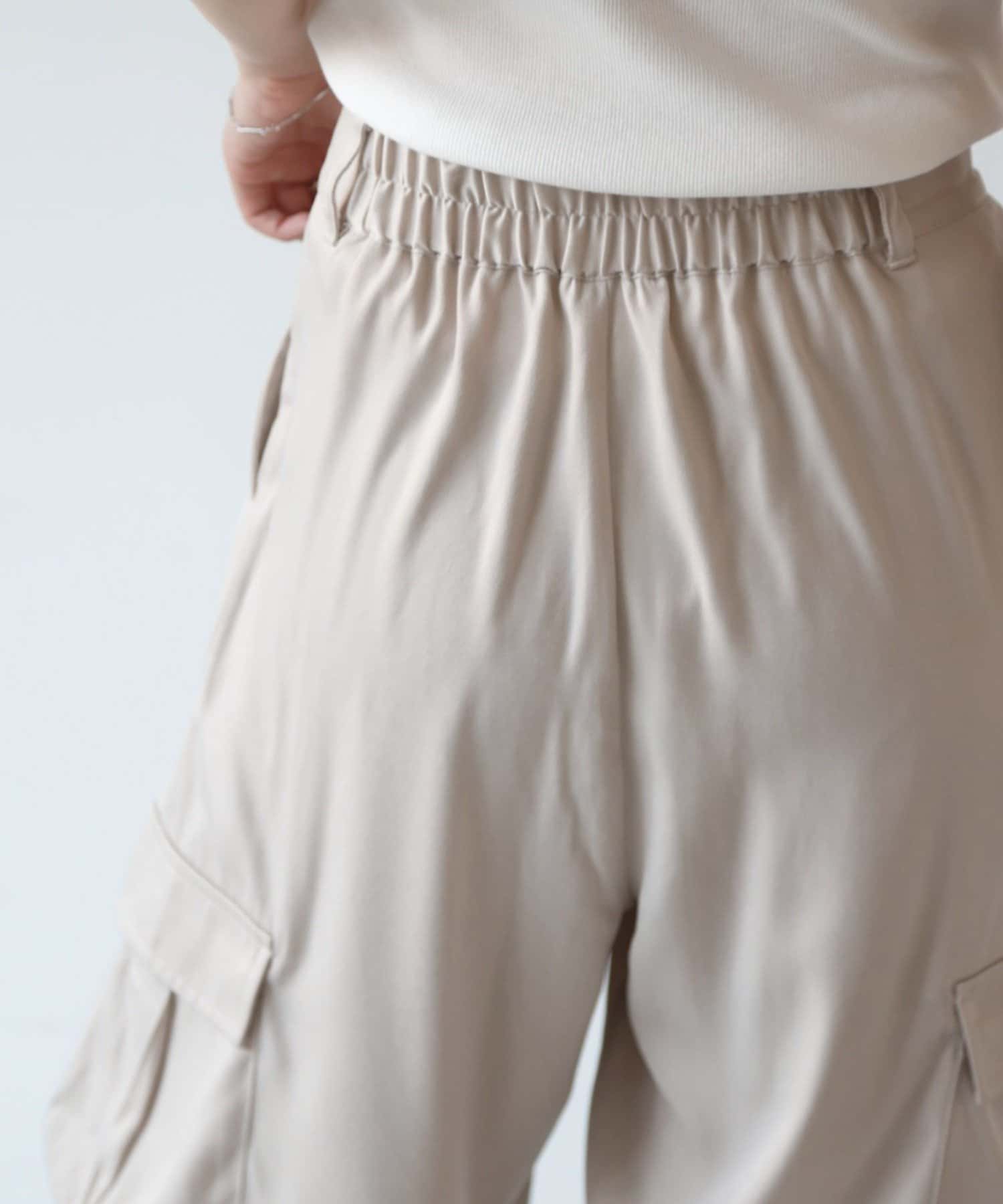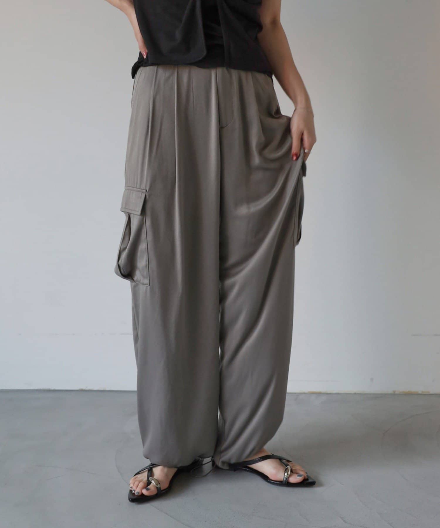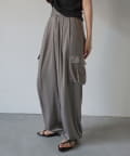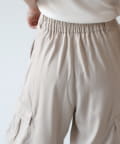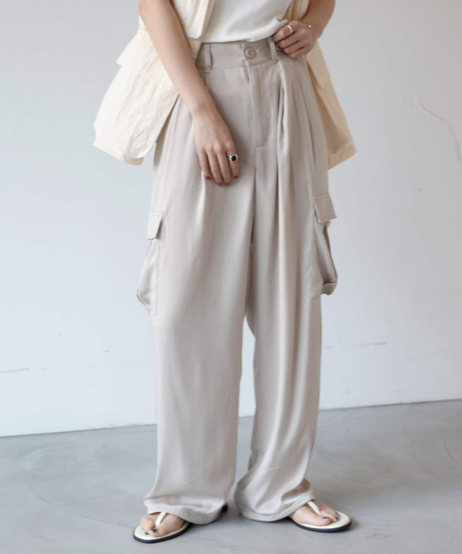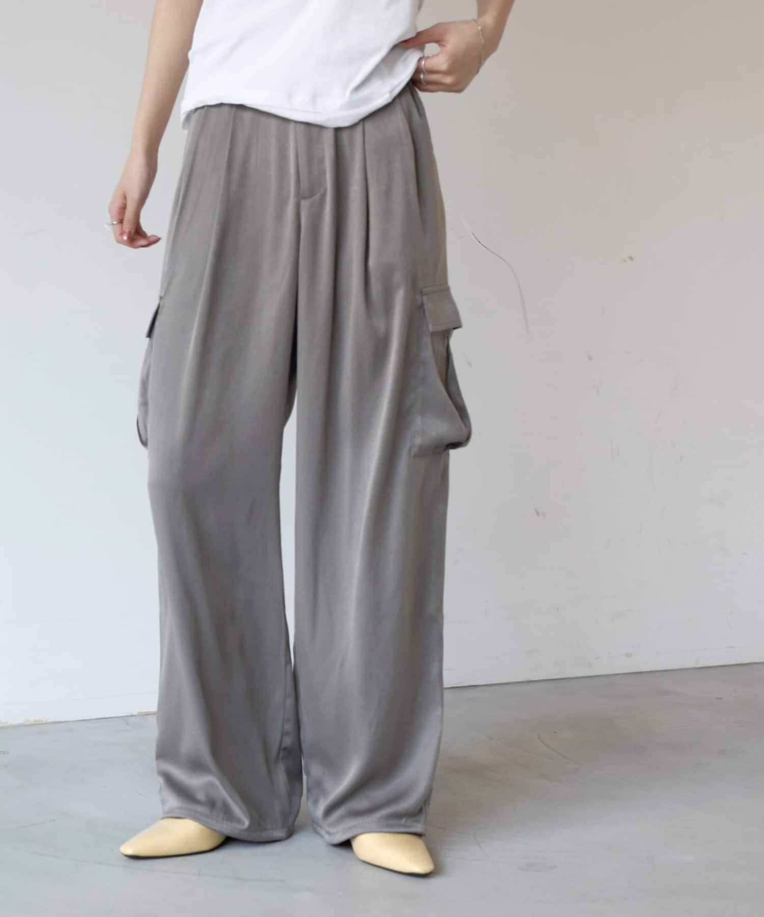 上品なマットサテン生地とカジュアルなカーゴパンツの絶妙なバランスがかわいいボトムスです。