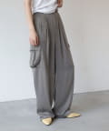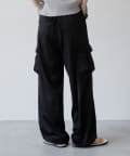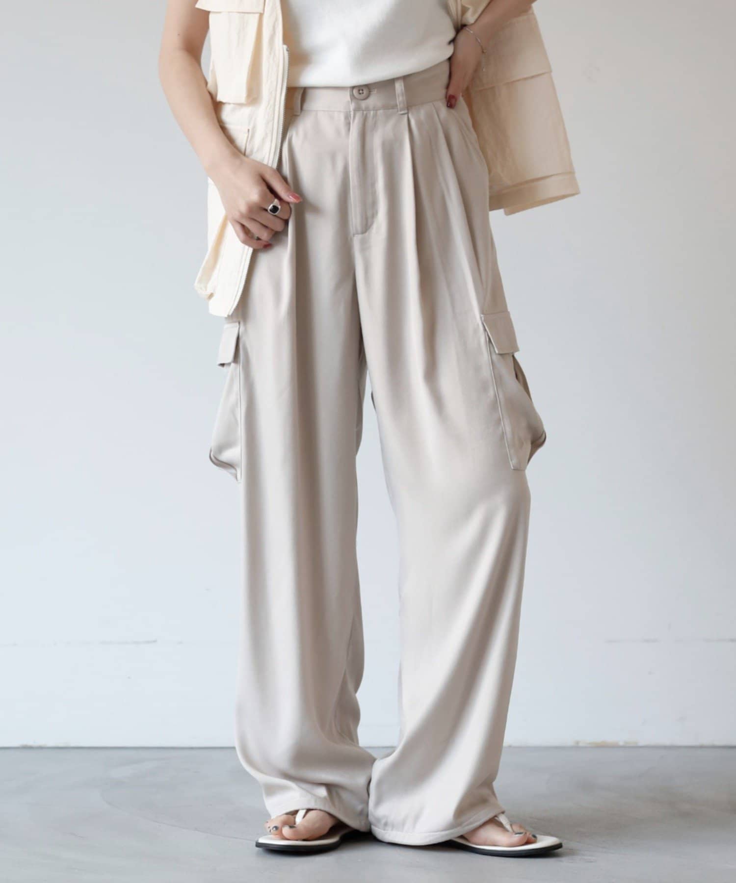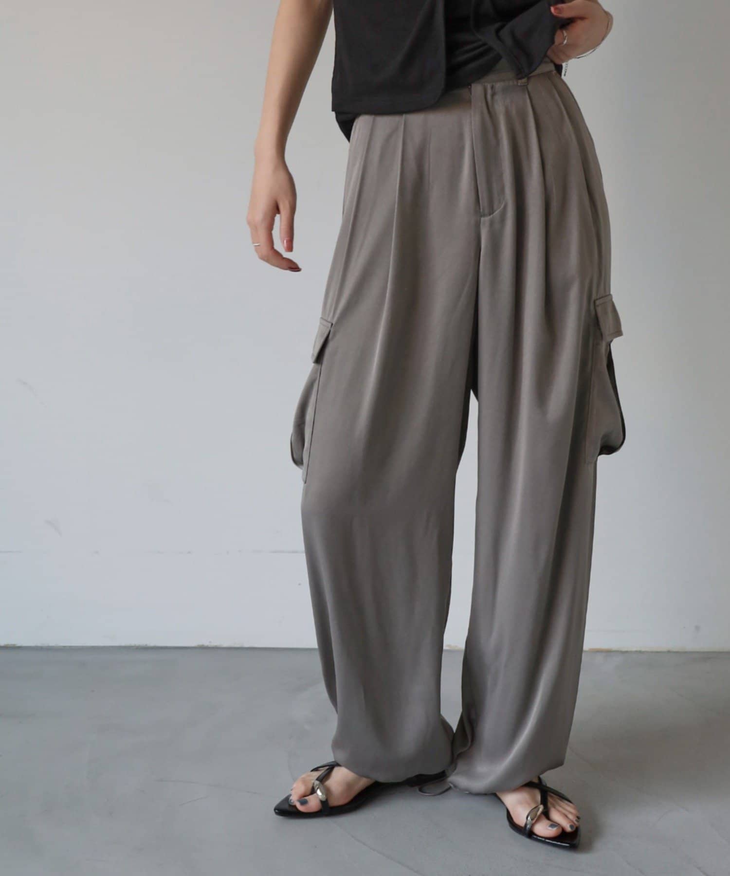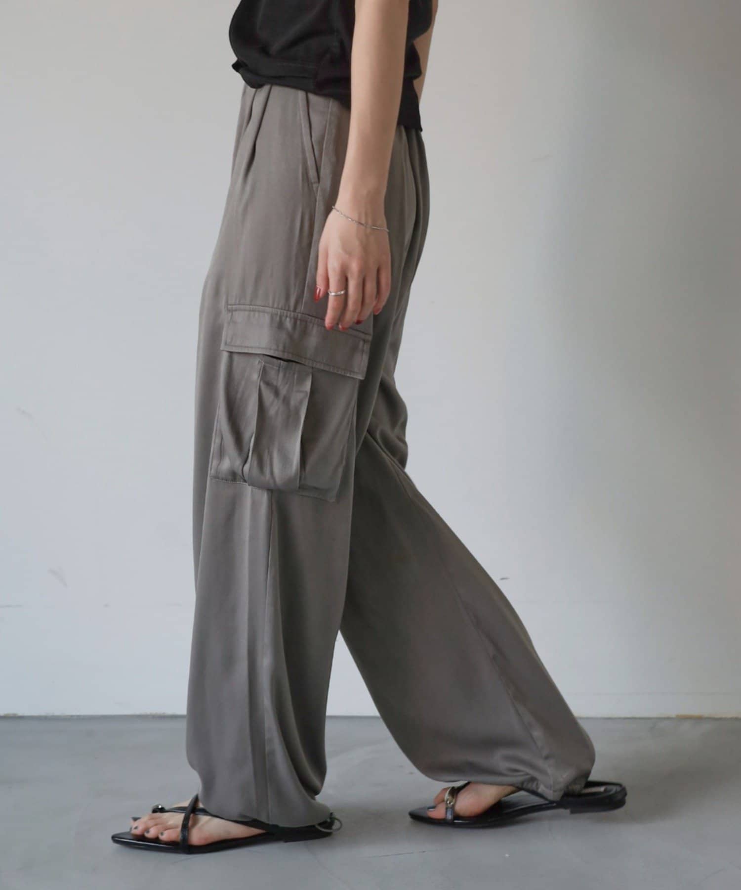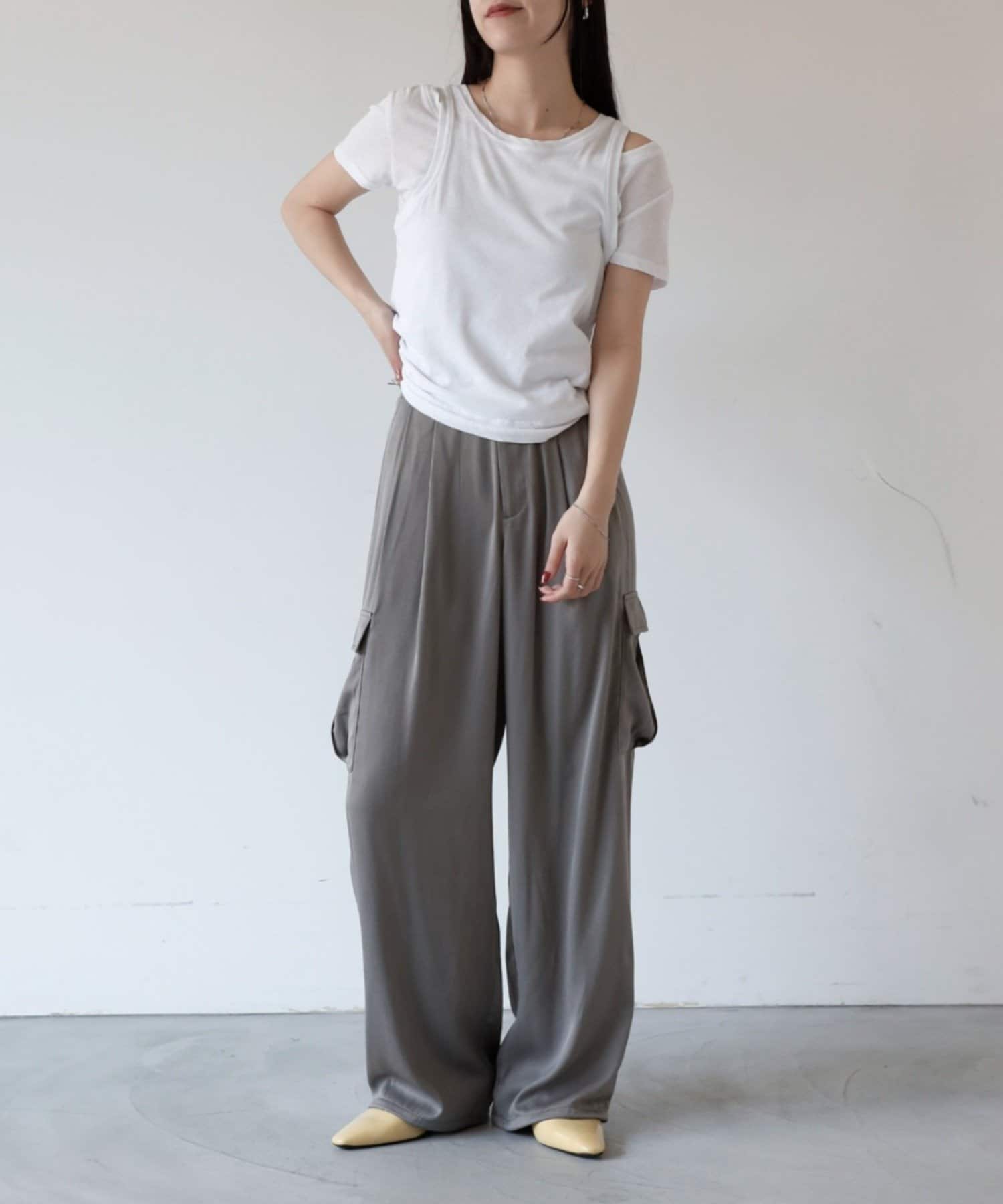 上品なマットサテン生地とカジュアルなカーゴパンツの絶妙なバランスがかわいいボトムスです。