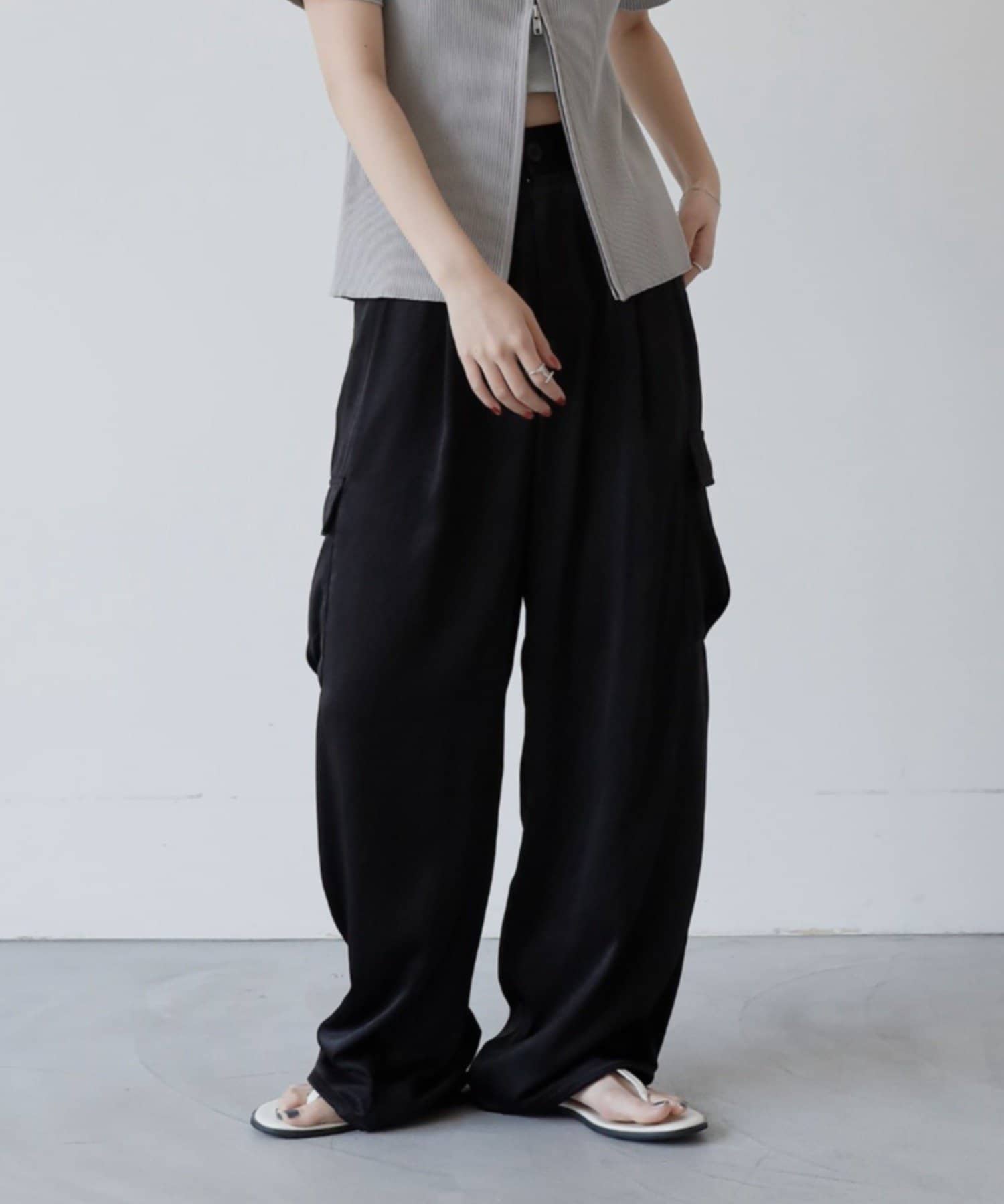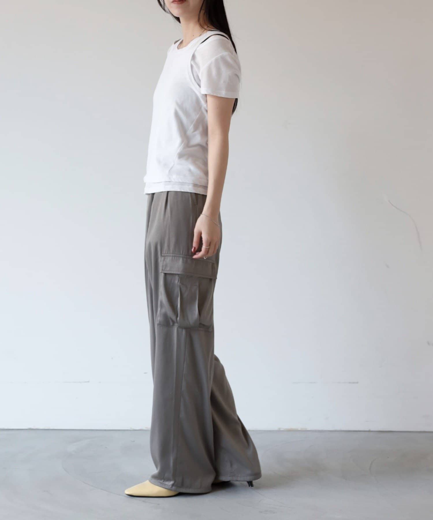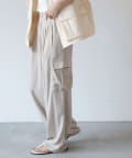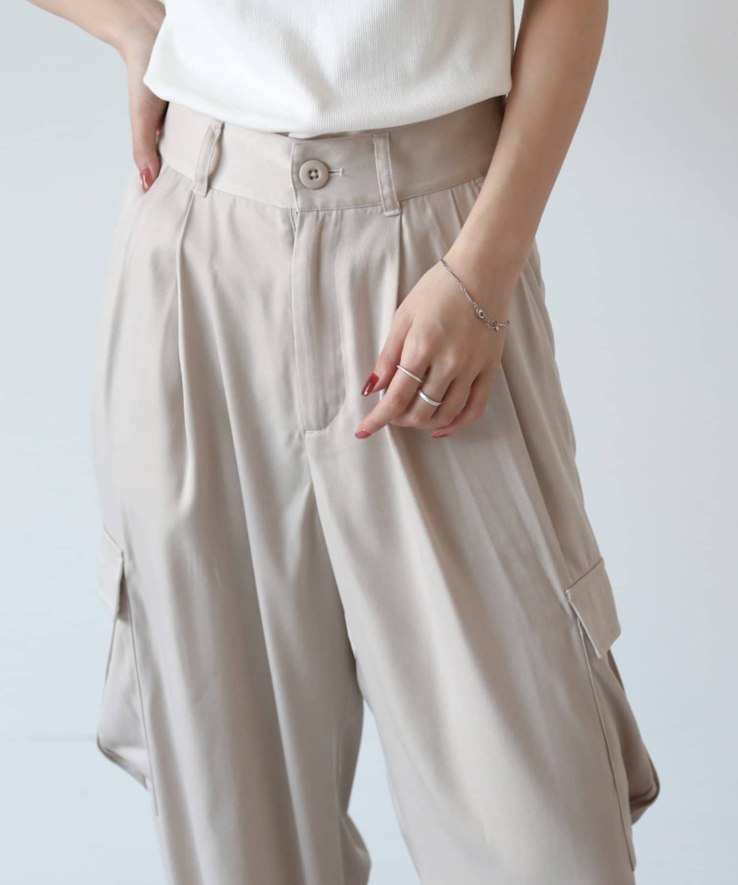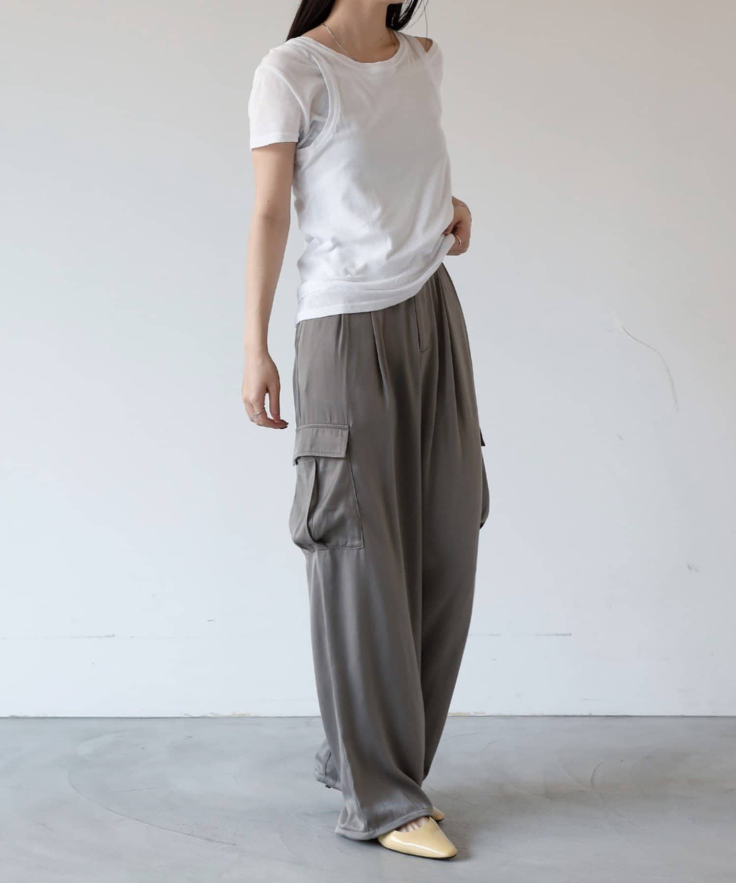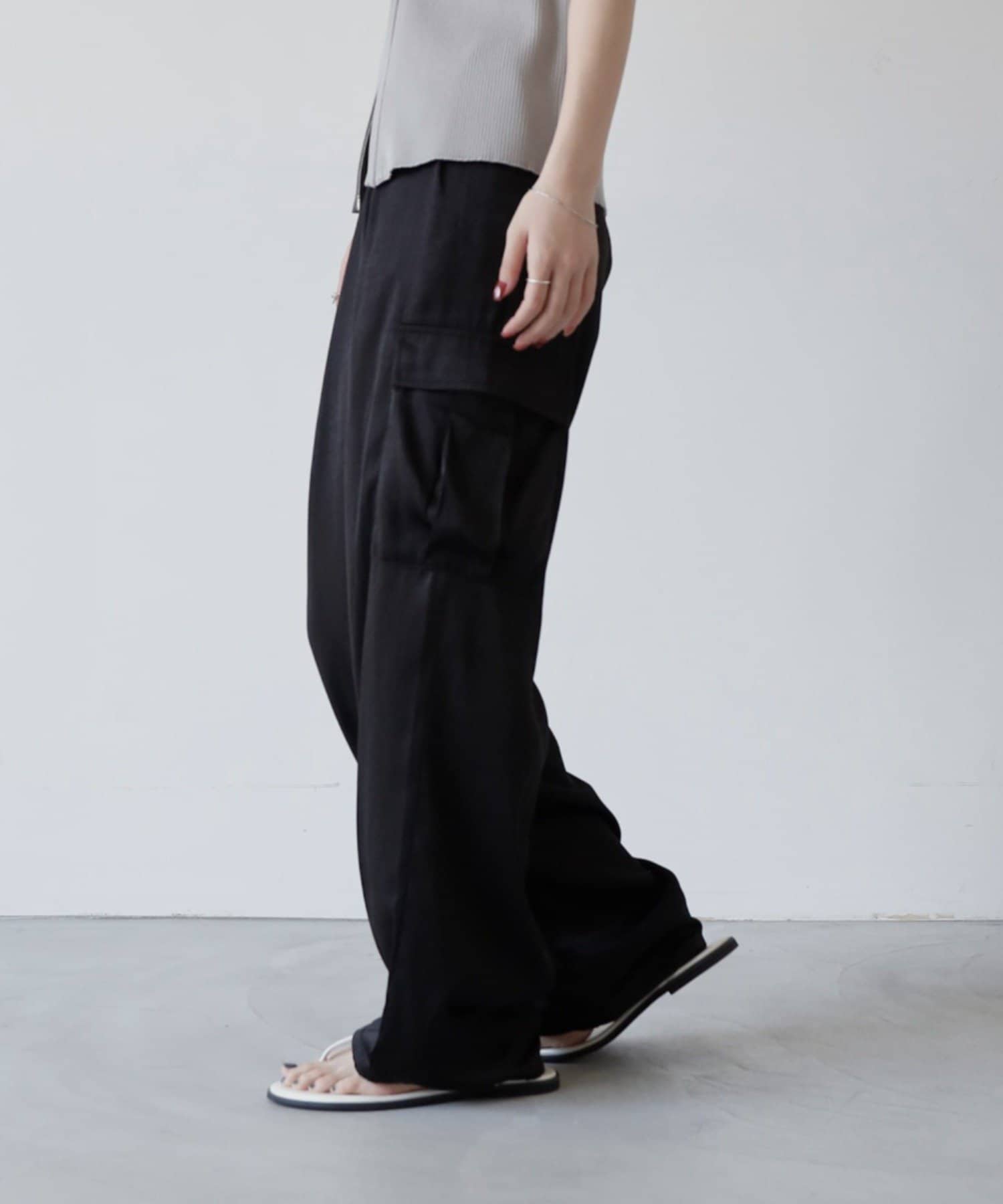 上品なマットサテン生地とカジュアルなカーゴパンツの絶妙なバランスがかわいいボトムスです。