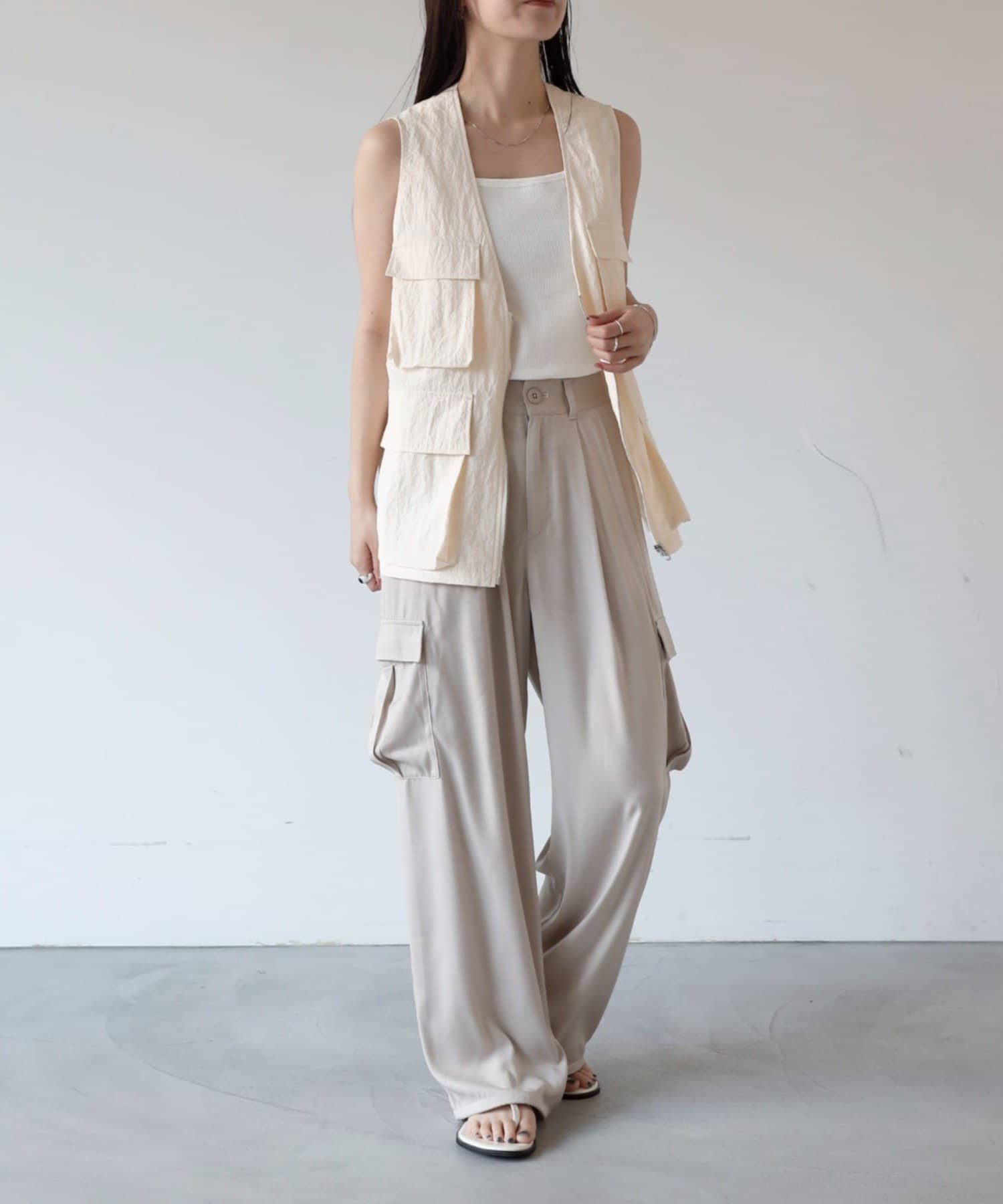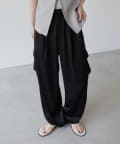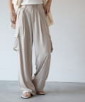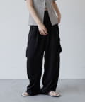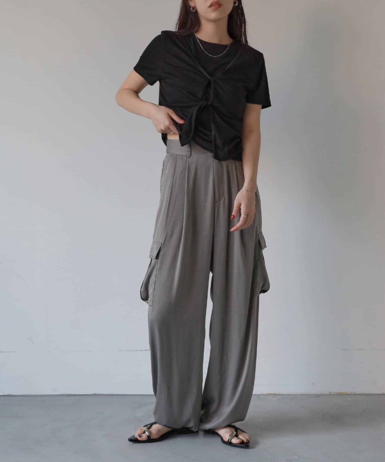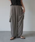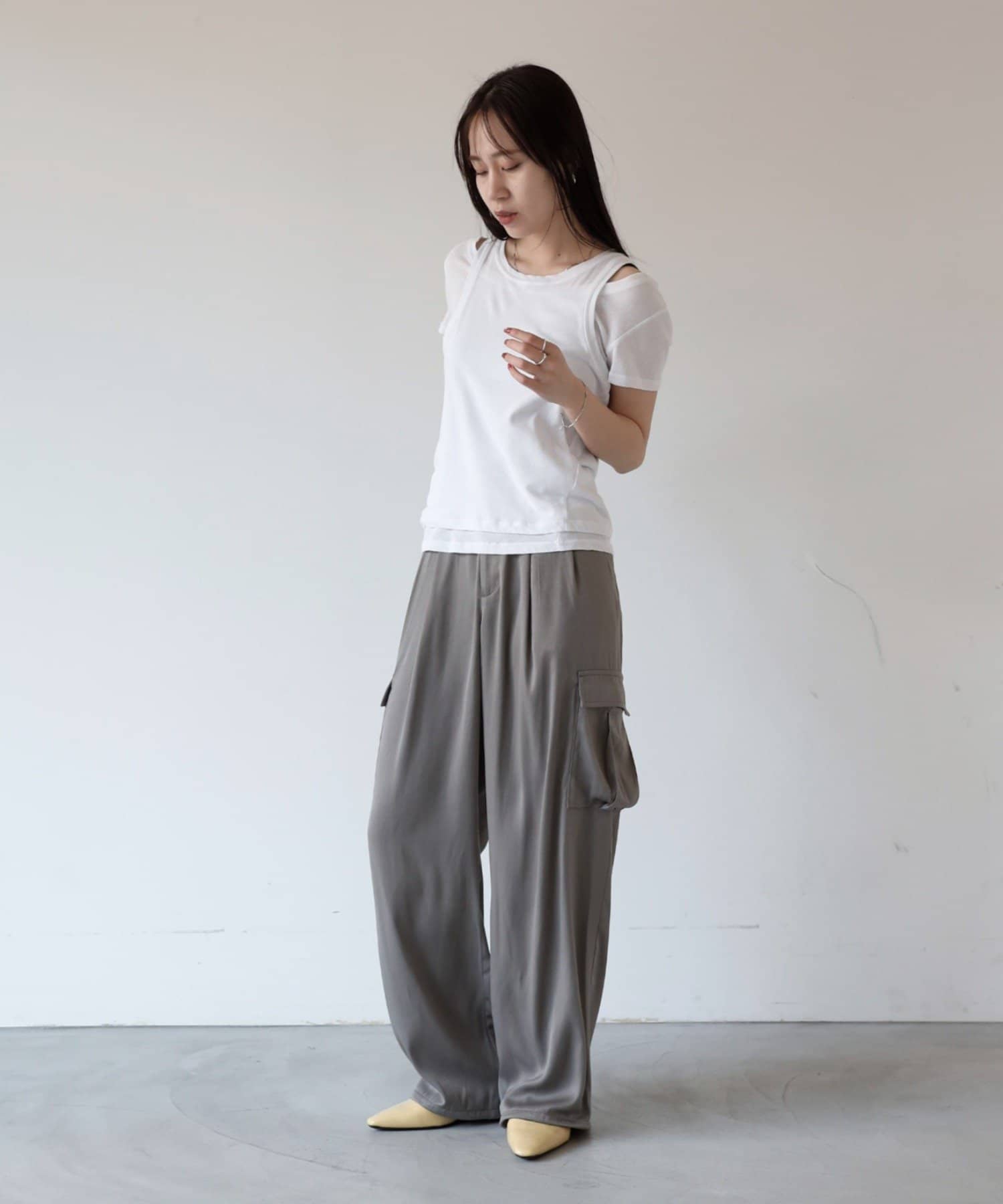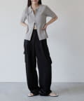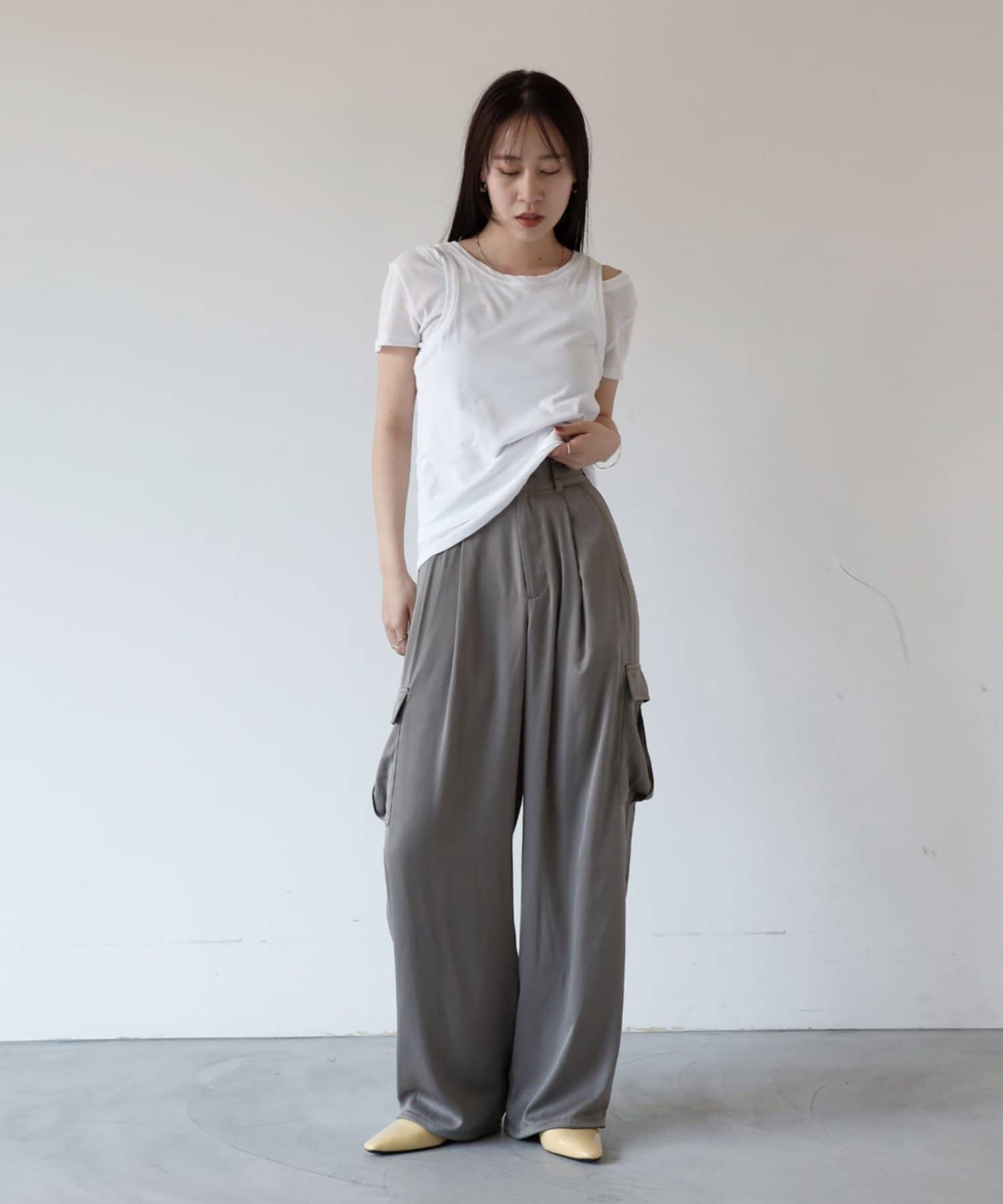 上品なマットサテン生地とカジュアルなカーゴパンツの絶妙なバランスがかわいいボトムスです。