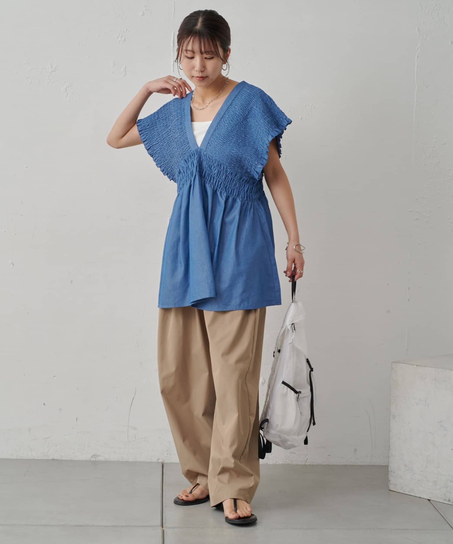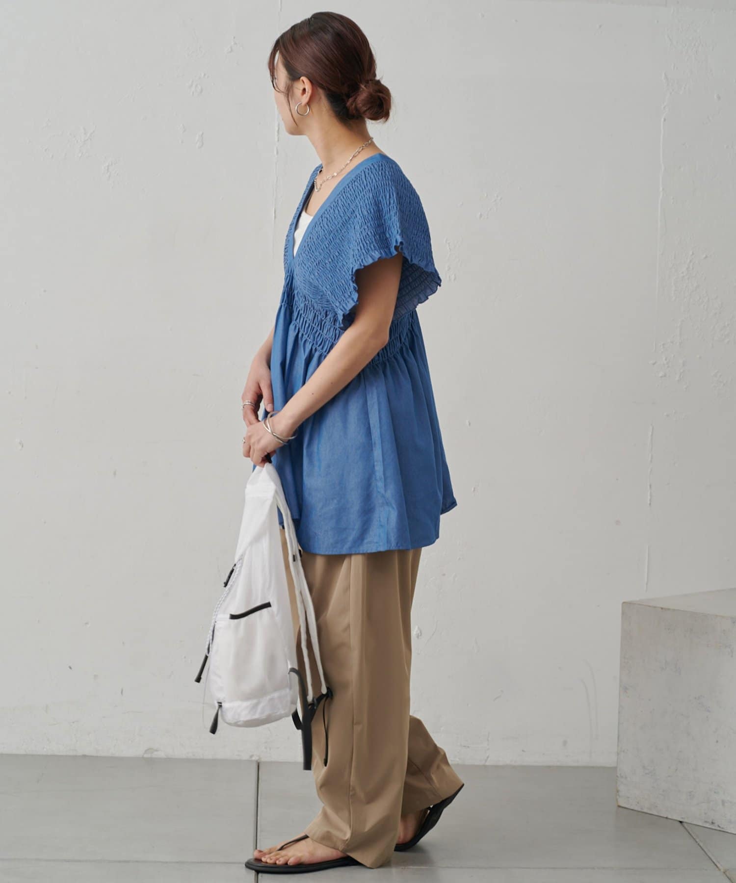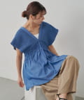 シャーリングとざっくりとした深めのVネックがデコルテを美しく見せ女性らしい印象に。